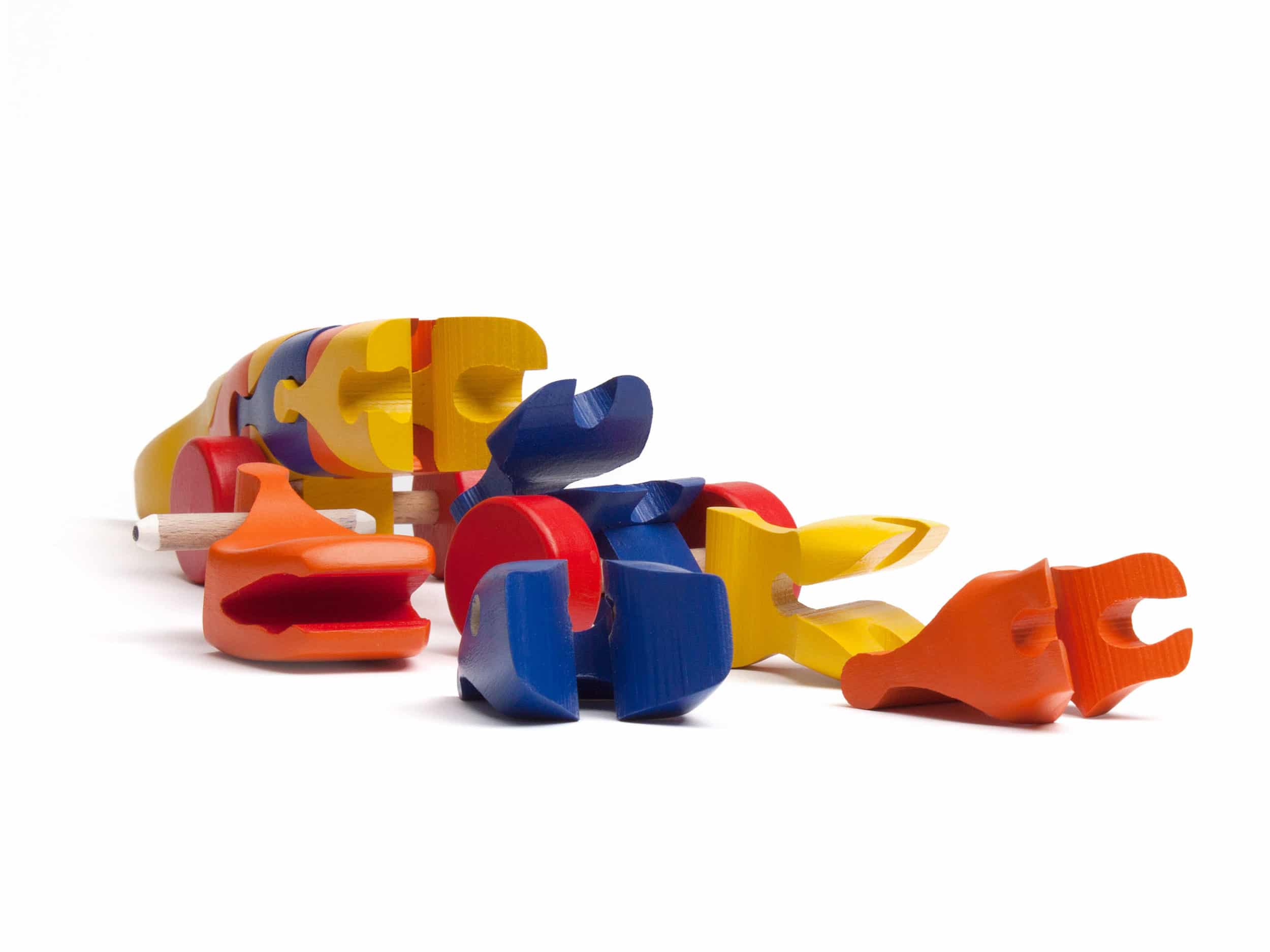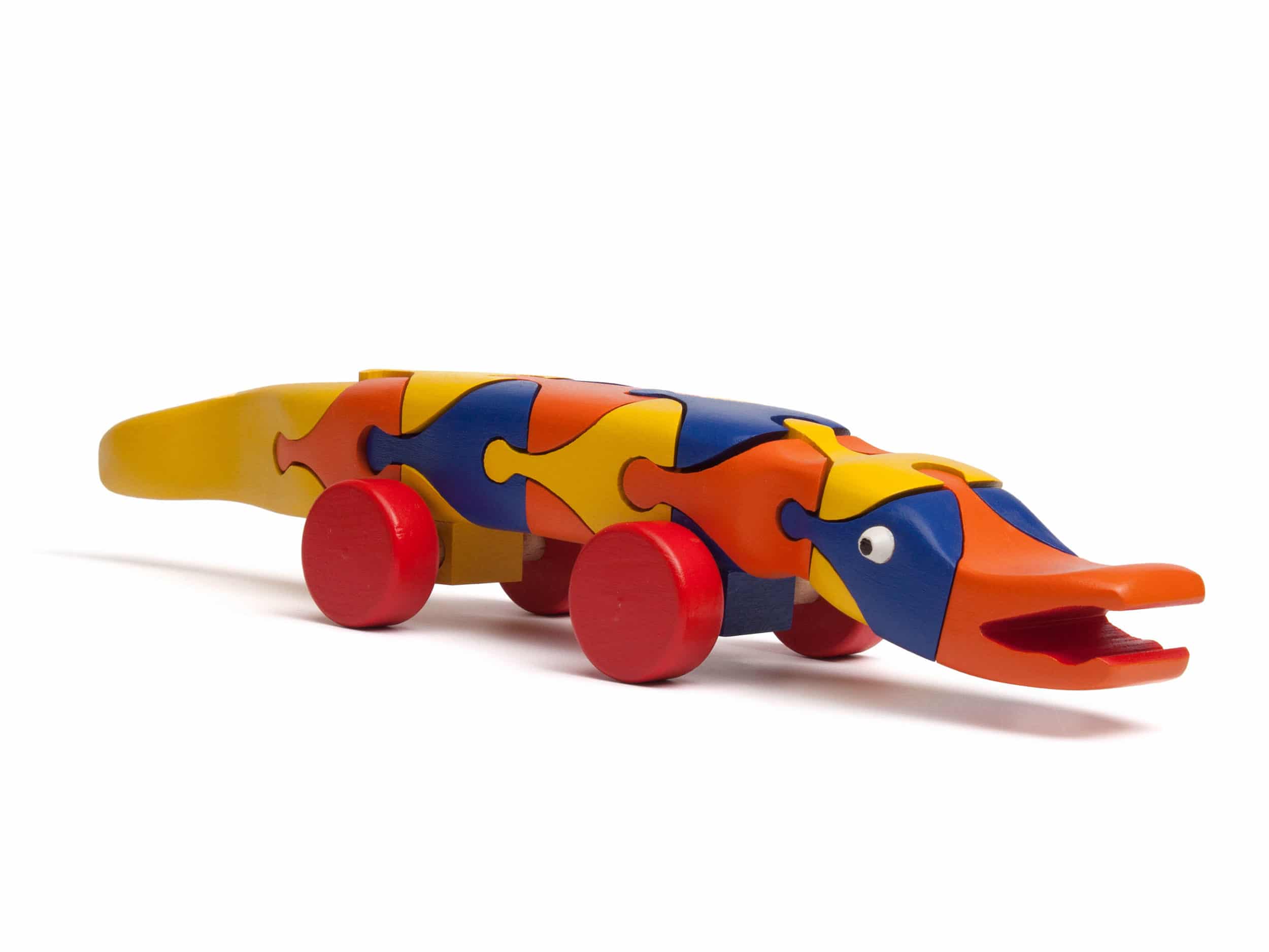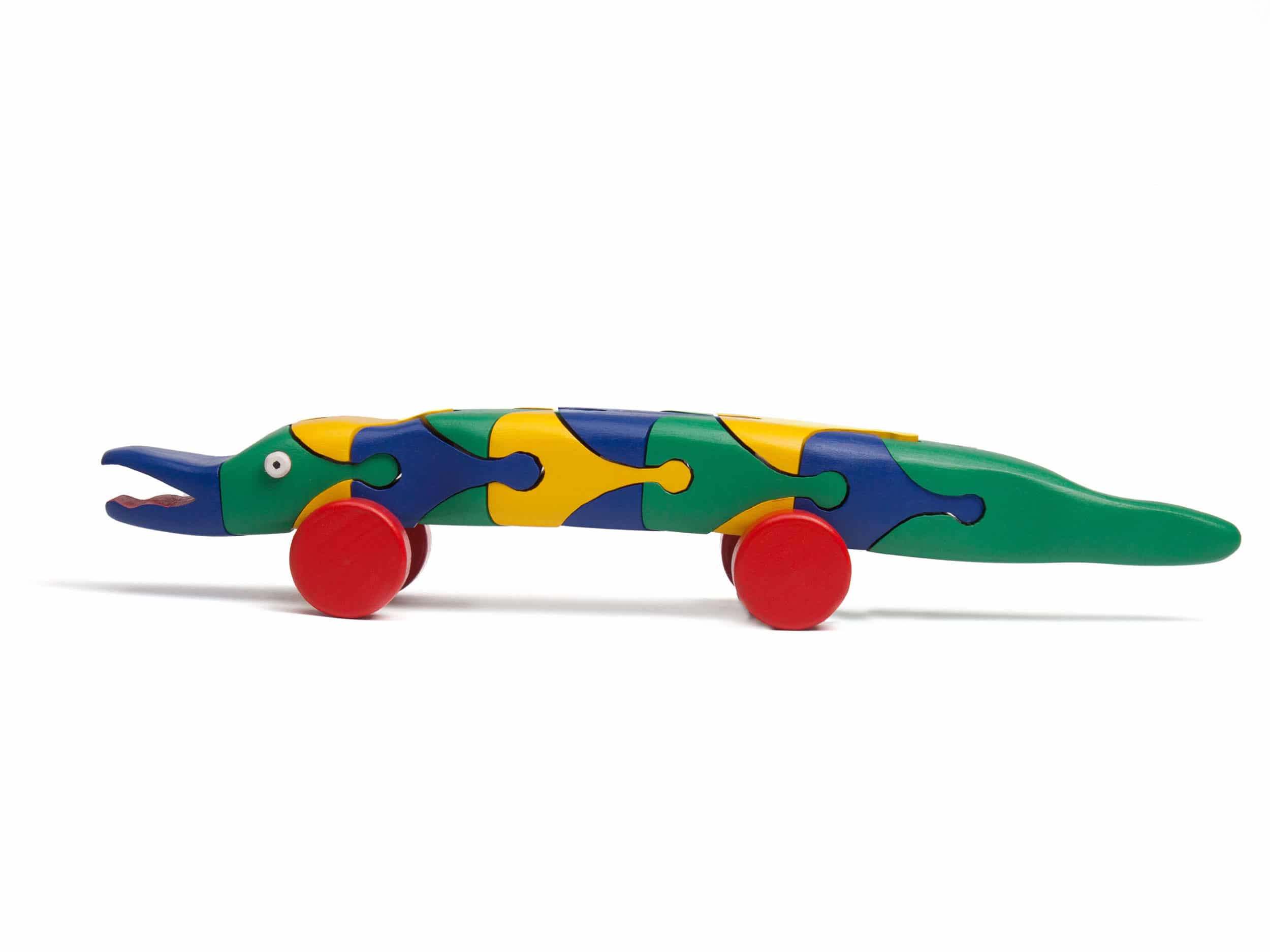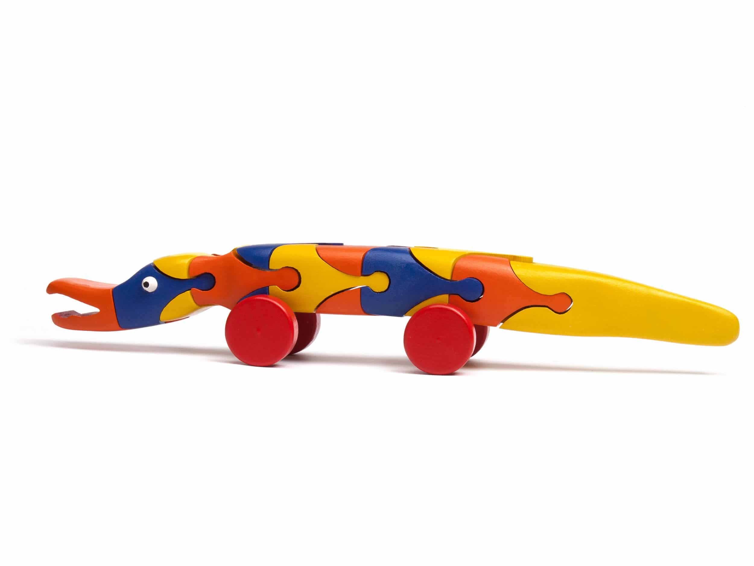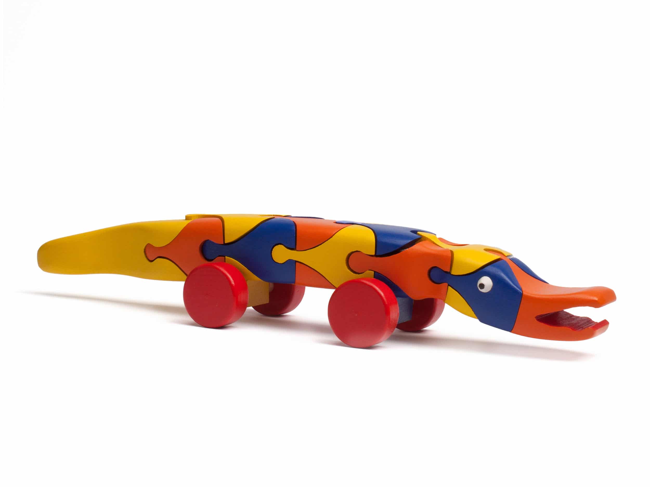 Herziges Kroki aus Schweizer Holz für Kinder ab 3 Jahren. Das Besondere daran – das Krokodil ist gleichzeitig ein dreidimensionales Puzzle und so neben dem Spielen auch pädagogisch wertvoll.