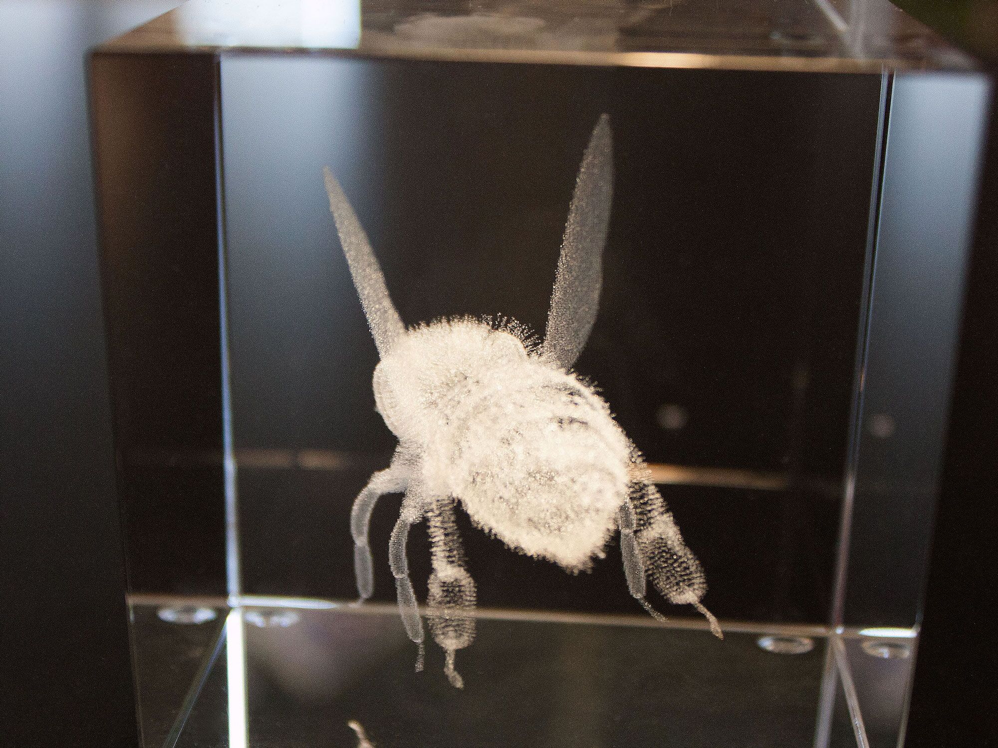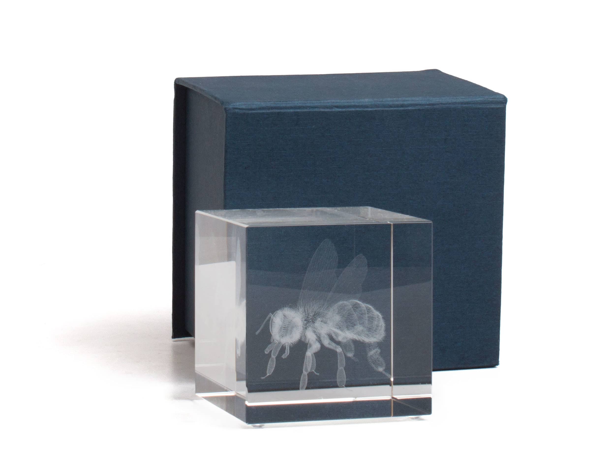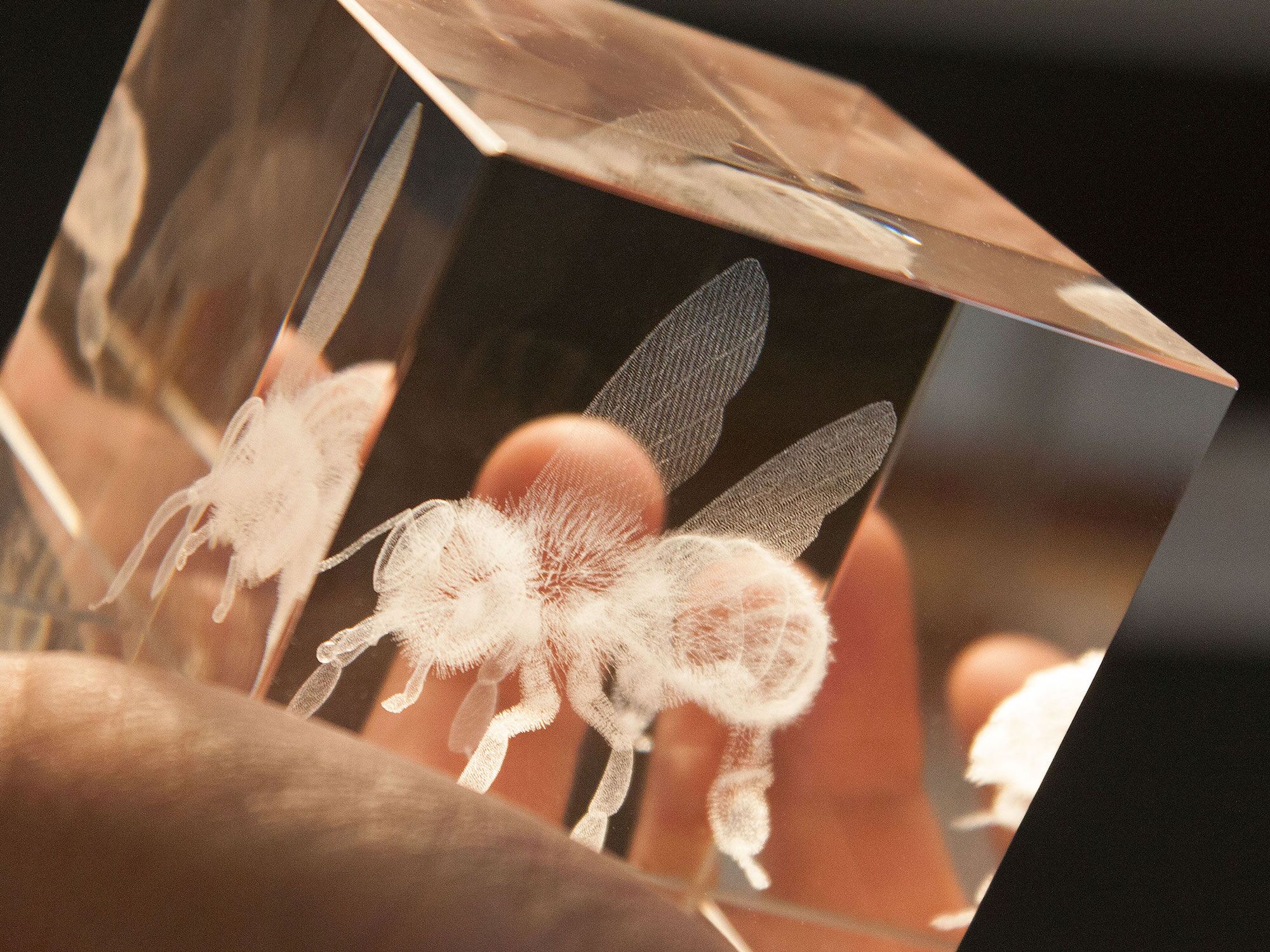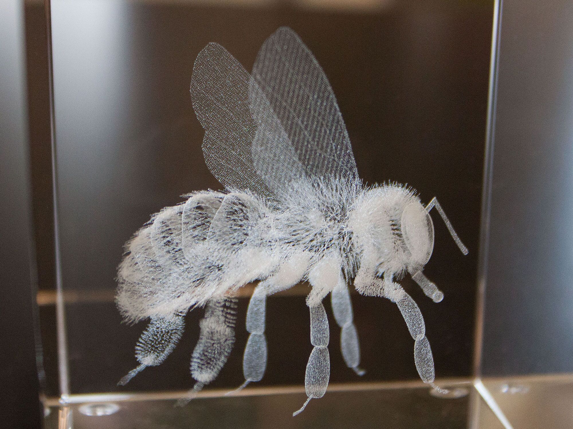 Der Würfel besteht übrigens zu 100% aus reinem, optischen Glas BK7 (Bor-Kronglas). Das 3D-Modell der Biene wird im Kanton Aargau mittels hochmodernster Lasertechnik mit Millionen kleinster Laserpunkte von aussen direkt ins Herz des Glases gelasert.