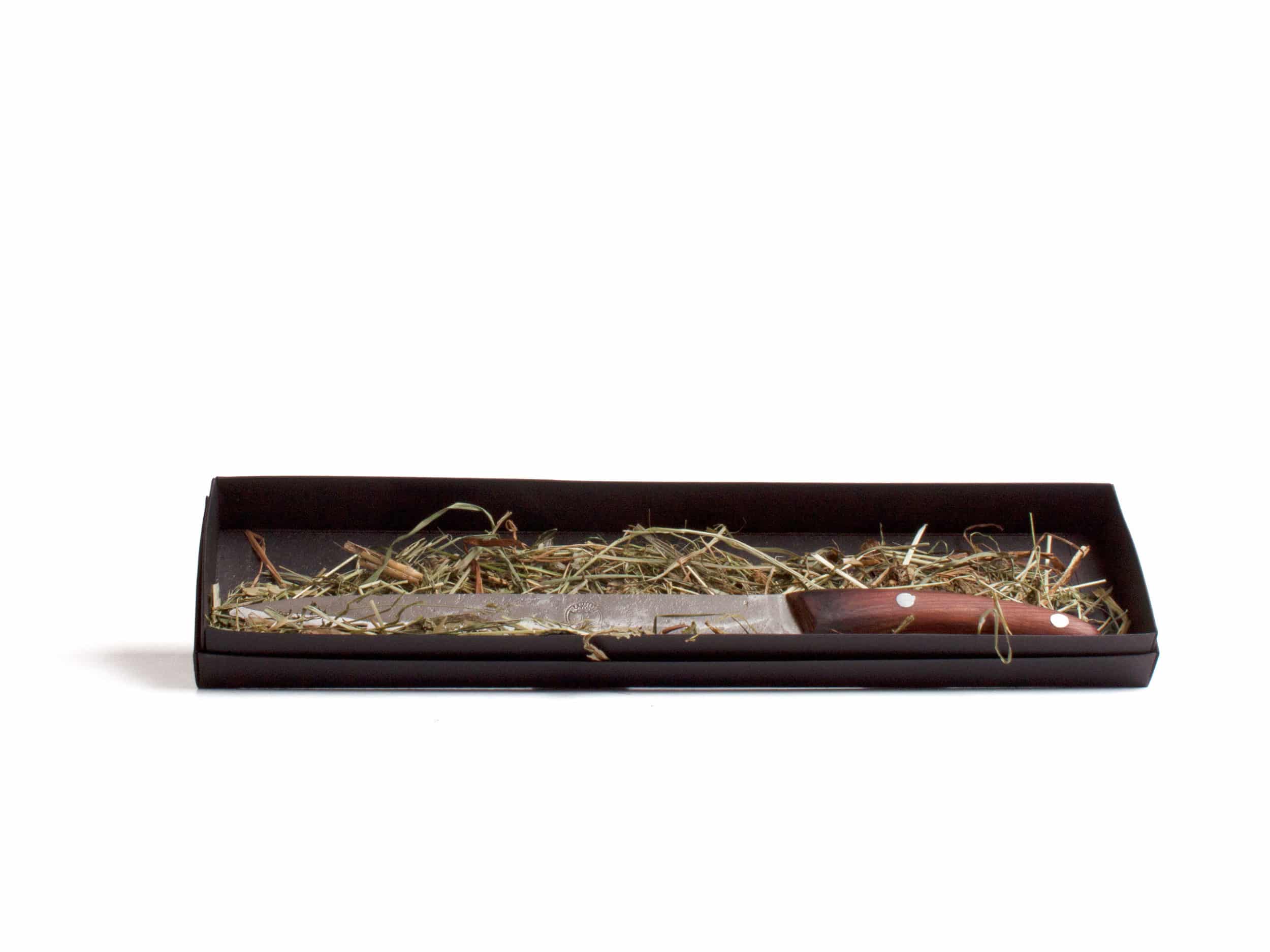 Das Messer wird aus INOX-Messerstahl 1.4034 hergestellt. Trotz des rostfreien Stahls könnte ein wenig Flugrost an den nicht blanken Stellen auftreten, wenn das Produkt nicht abgetrocknet wird. Dieser ist jedoch leicht abwischbar und hygienisch unbedenklich.