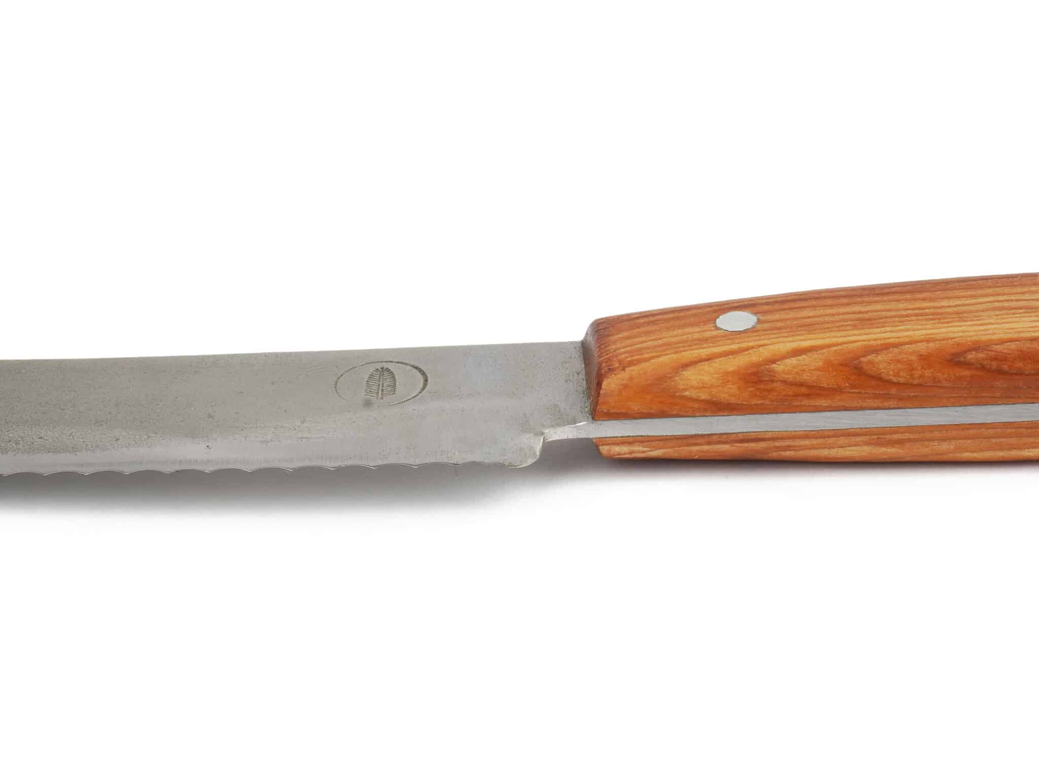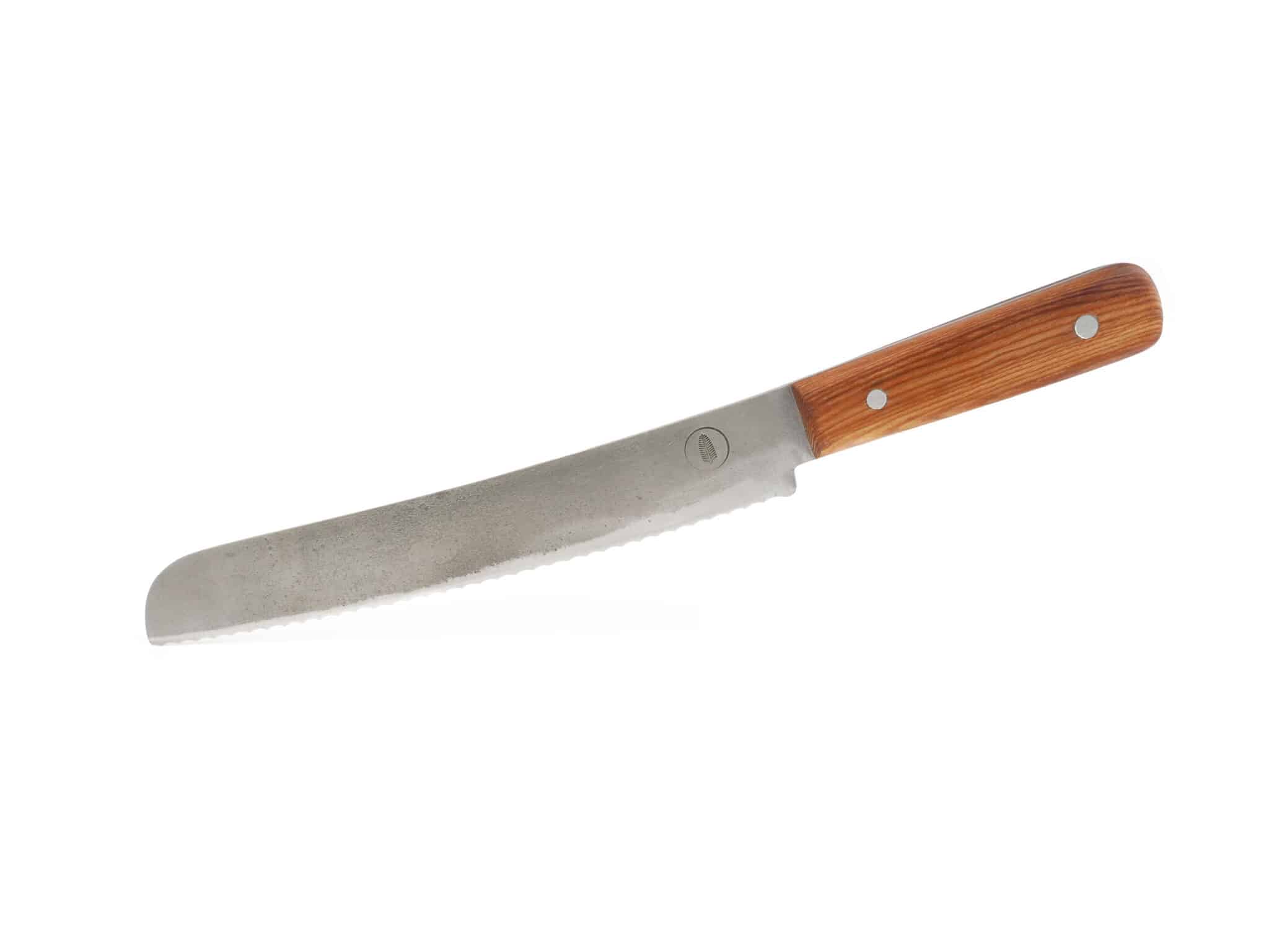 Schönes und stilvolles Schweizer Brotmesser von Naturköchin Rebecca Clopath. Mit Holzgriff aus altem Lärchenholz. Hergestellt in Guarda.