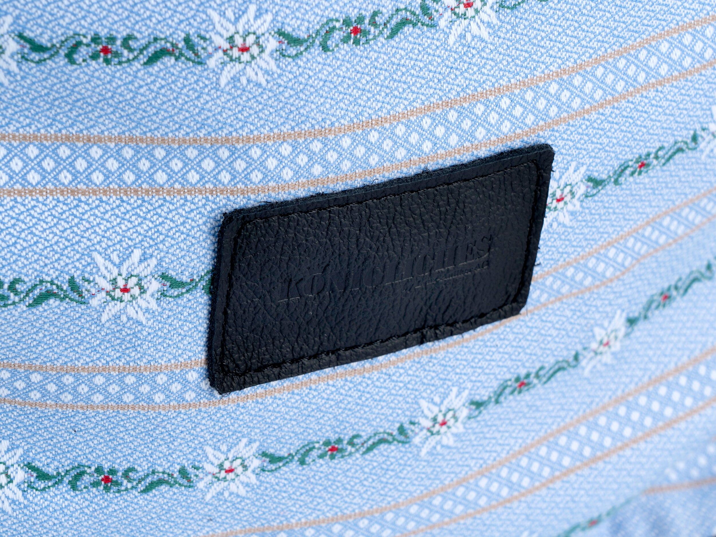 Der Edelweiss-Stoff wird in der Schweiz gewoben und im Kanton Bern von Pascal und seinem Team zu diesem Schmuckstück vollendet. Die Lederverstärkungen (Restleder aus einer der letzten Gebereien im Emmental) garantieren dem Besitzer Langlebigkeit.