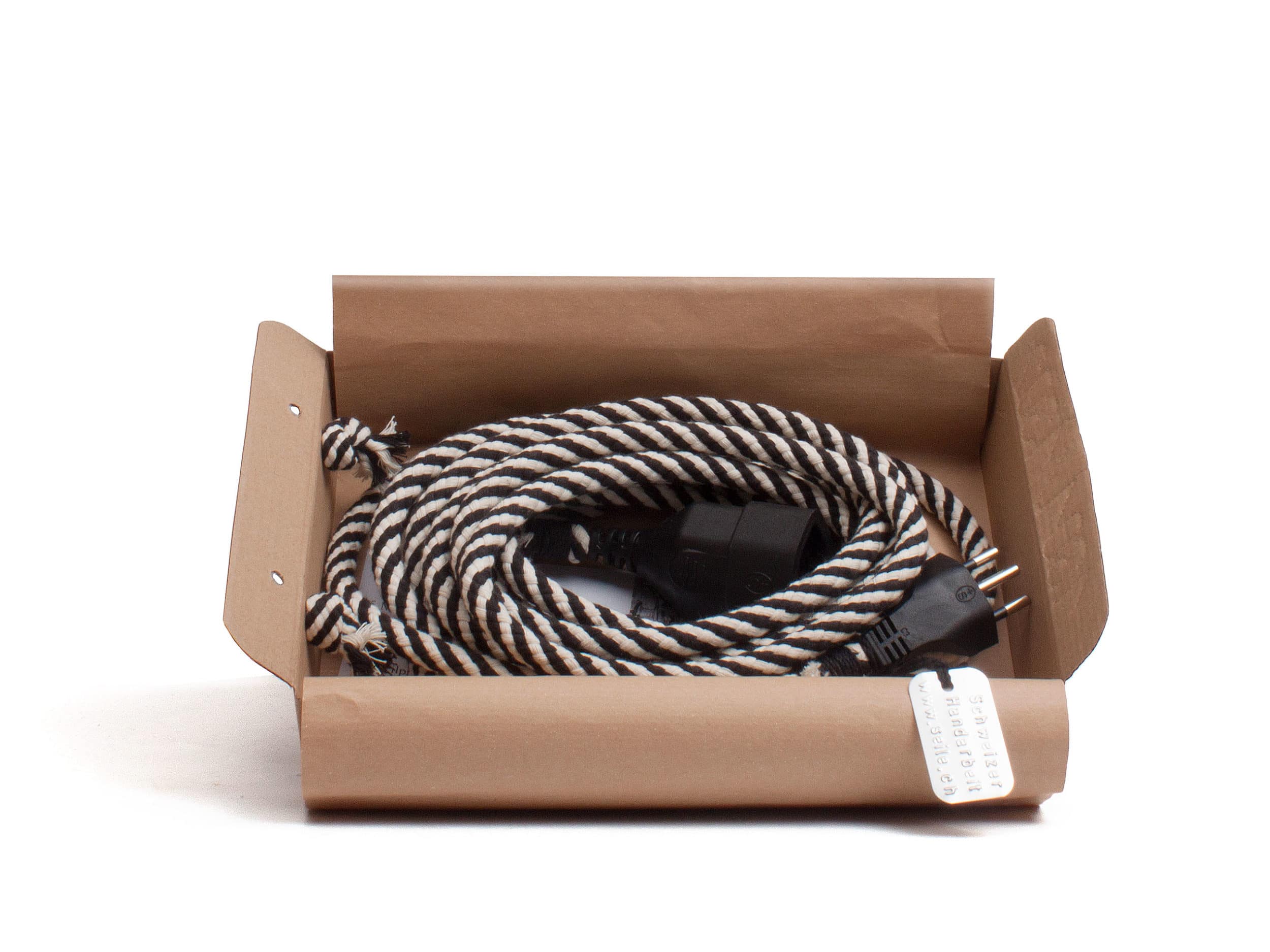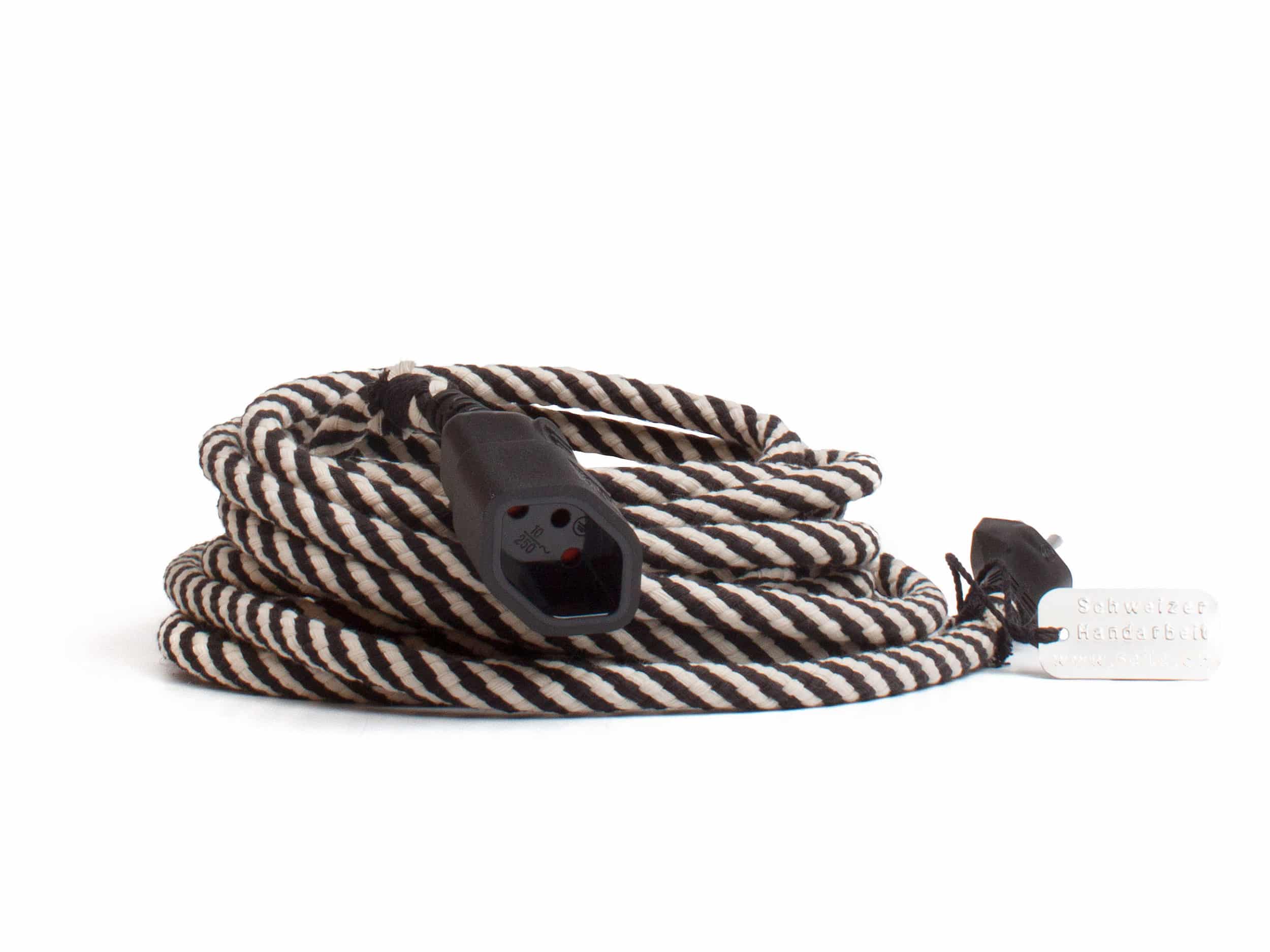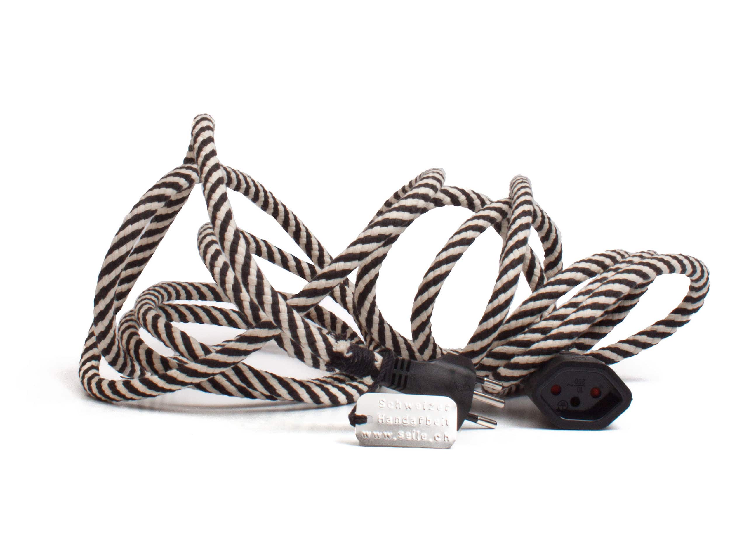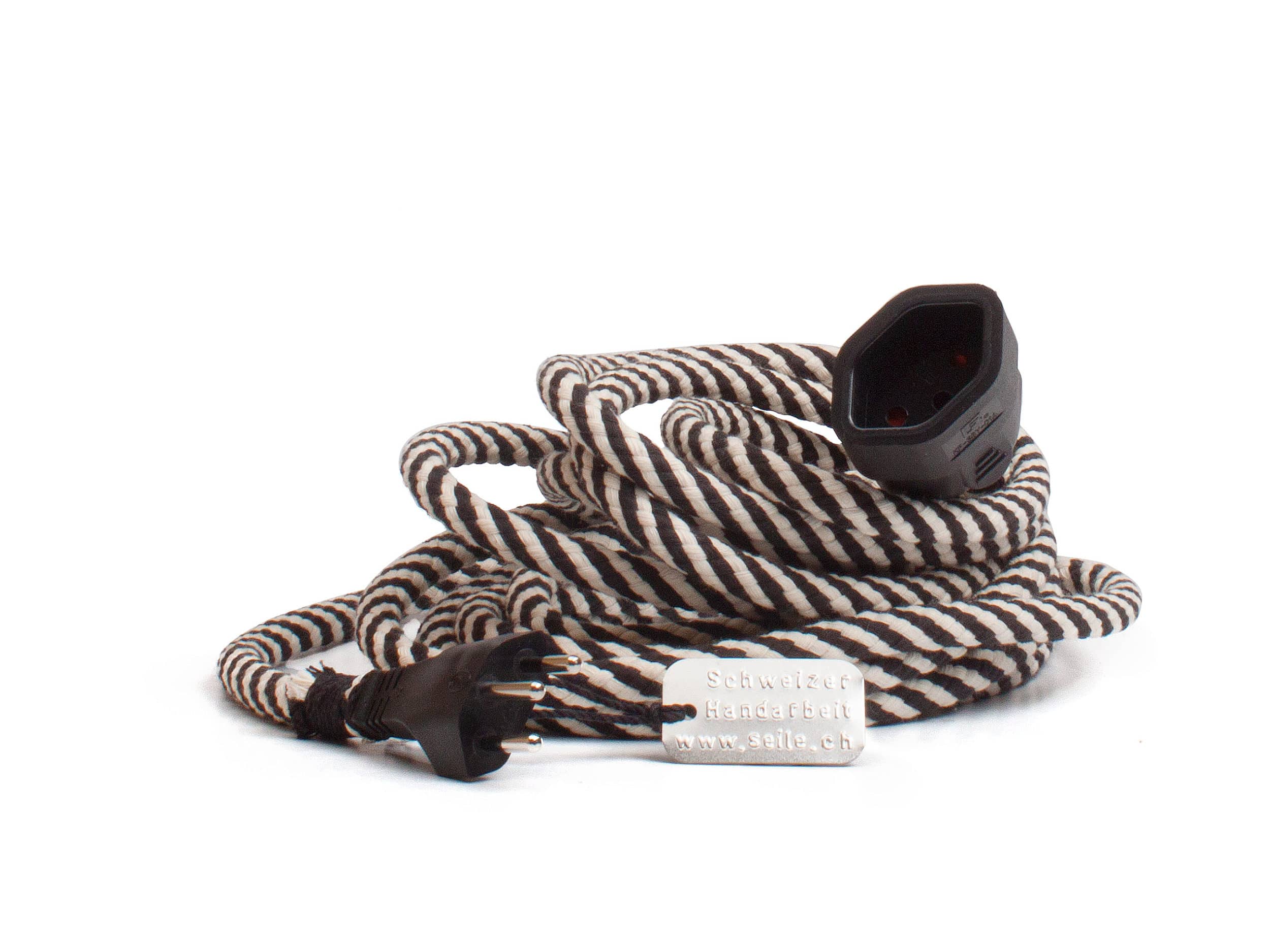 Damit Du das Verlängerungskabel nicht verstecken musst. Das dekorative «Elektroseil» wird in der Seilerei von Martin nach traditioneller Art hergestellt. Das 5 Meter lange Verlängerungskabel ist mit Baumwolle umflochten und von Hand abgebunden.
