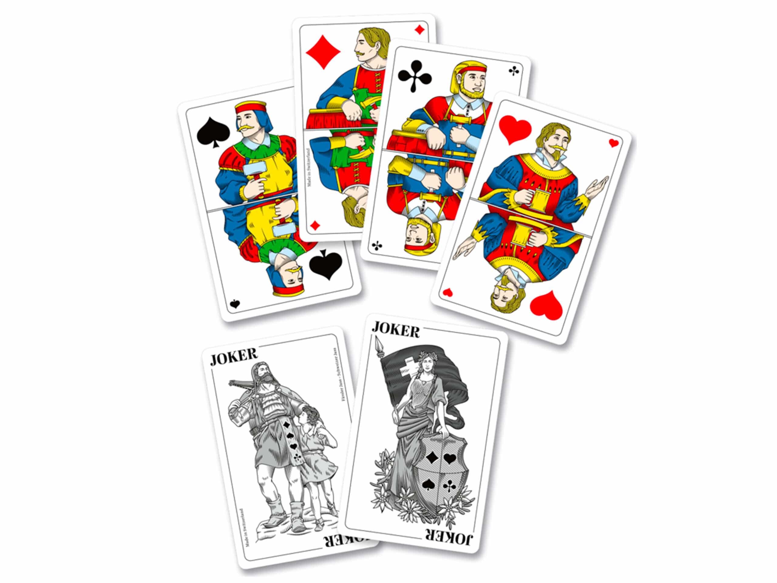Denn das traditionelle Kartensspiel mit den vier bekannten Sujets und 36 Spielkarten wird pro Farbe um die neuen Karten 1, 2, 3, 4 und 5, zwei Joker (Willhelm Tell und Helvetia), sowie um die Fässler-Karten (zwischen Banner (10) und Under) ergänzt. Insgesamt hat das Kartenset also 60 Spielkarten und 2 Joker.