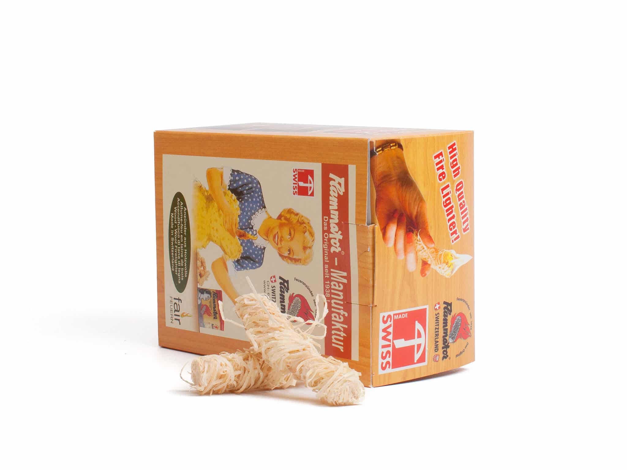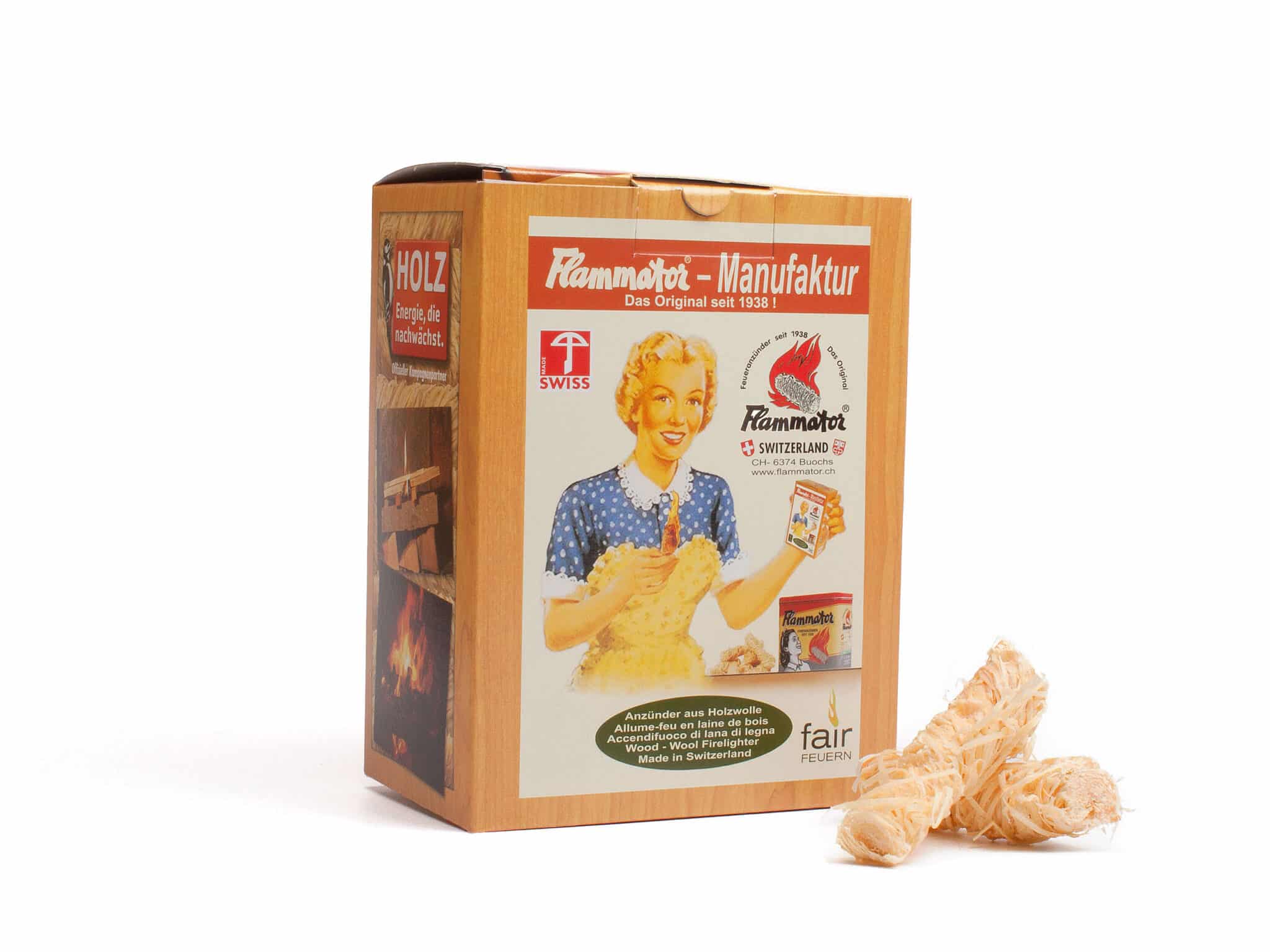 «Flammator»-Anzündhilfen (Schweizer Holz) eignen sich hervorragend zum Anfeuern von festen Brennstoffen wie Holz oder Holzkohle. Keine Russentwicklung im Kamin.