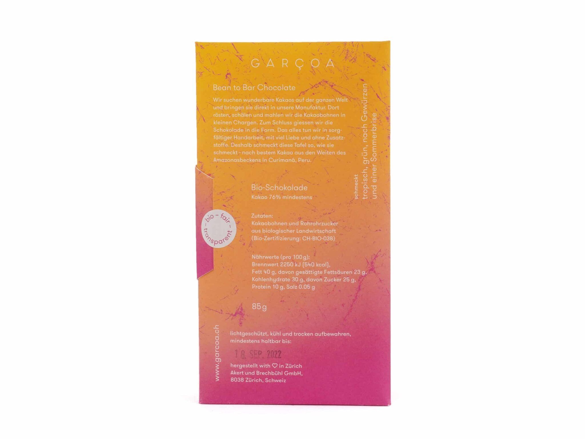 Bio Schokolade (76% Kakaoanteil). Von Hand hergestellt in Zürich aus den Kakaobohnen einer modernen Forastero-Sorte der Region Curimaná im peruanischen Amazonasbecken. Sie schmeckt tropisch, grün, nach Gewürzen und einer leichten Sommerbrise.