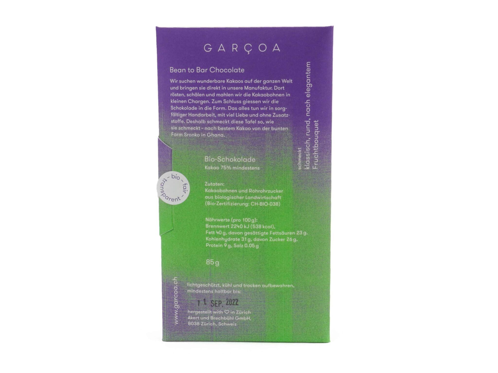 Bio Schokolade (75% Kakaoanteil). Von Hand hergestellt in Zürich aus liebevoll angebauten Kakaobohnen der Farm Sronko in Ghana. Sie schmeckt klassisch, rund und hat ein elegantes Fruchtbouquet.