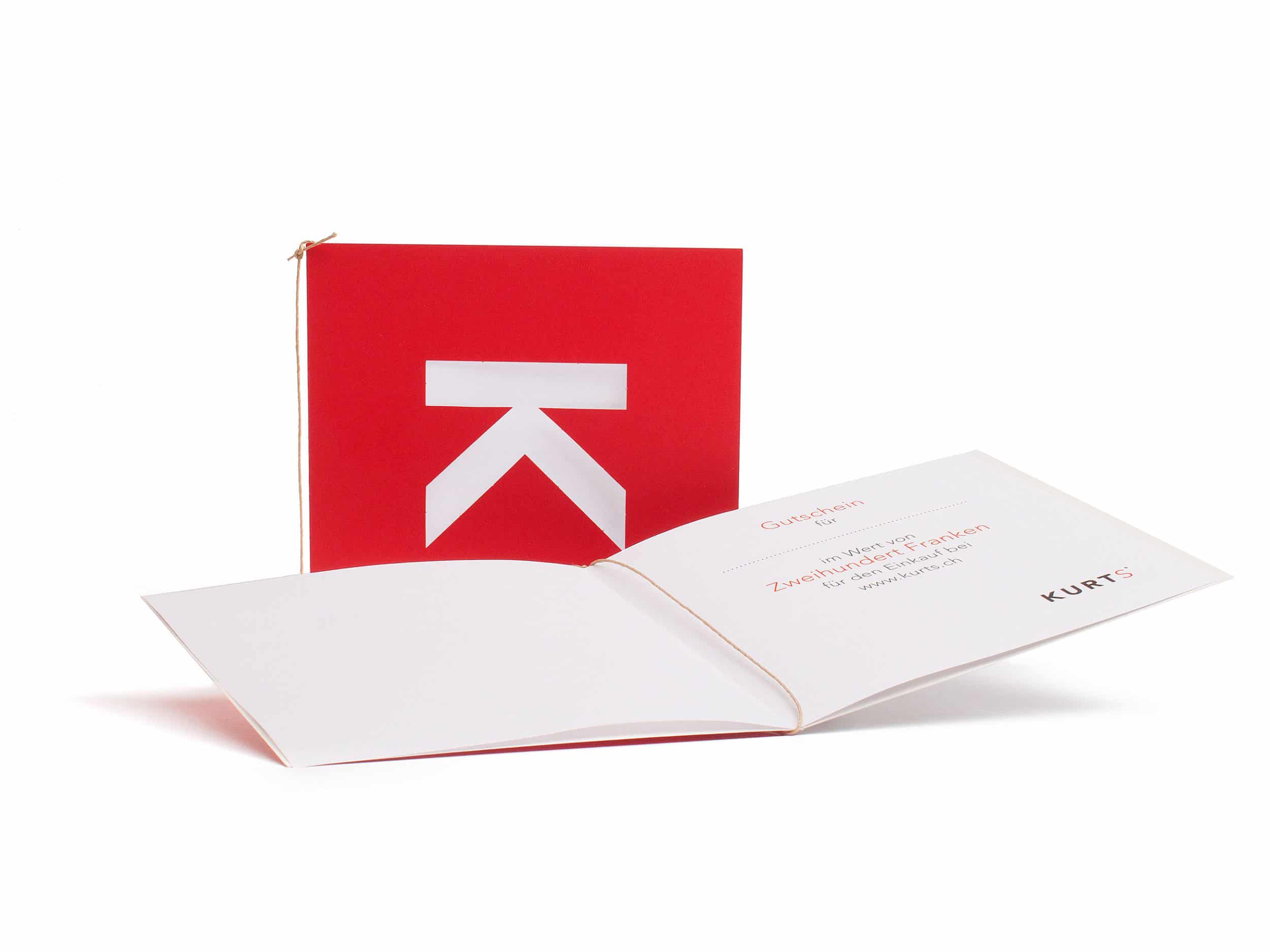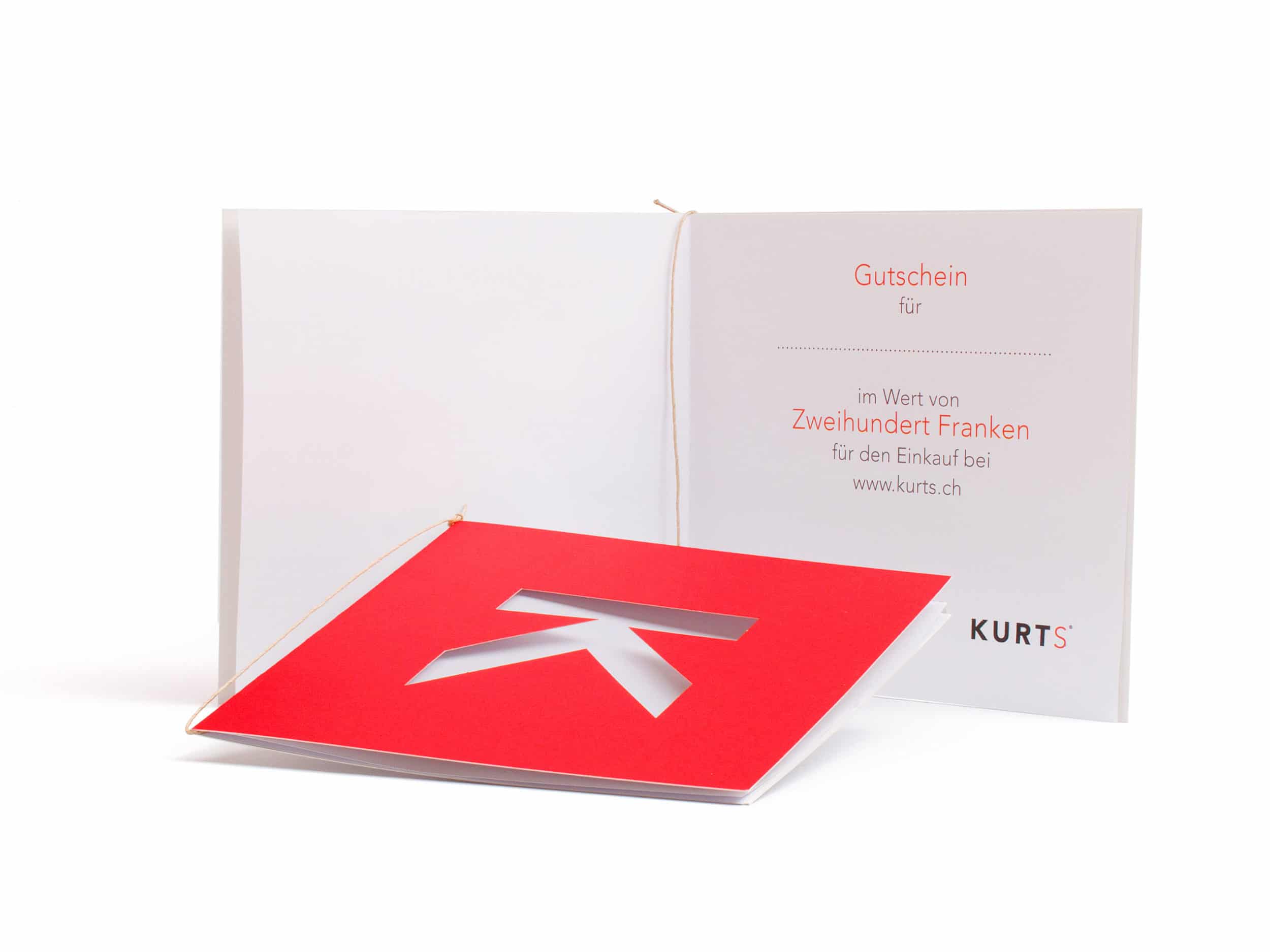Geschenkgutschein KURTS für Geschenke zum Geburtstag, zu Weihnachten oder als Dankeschön. In den Grössen CHF 50.-/ 100.- / 200.-.