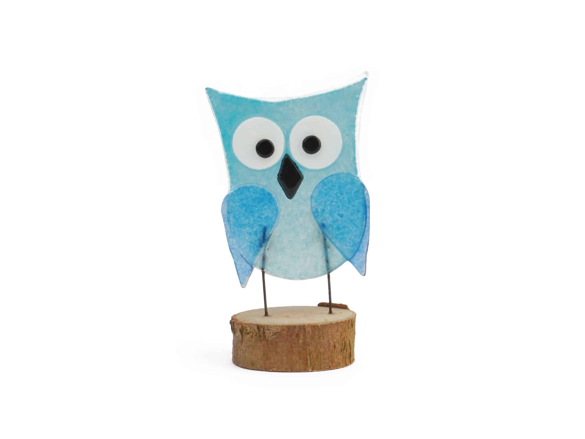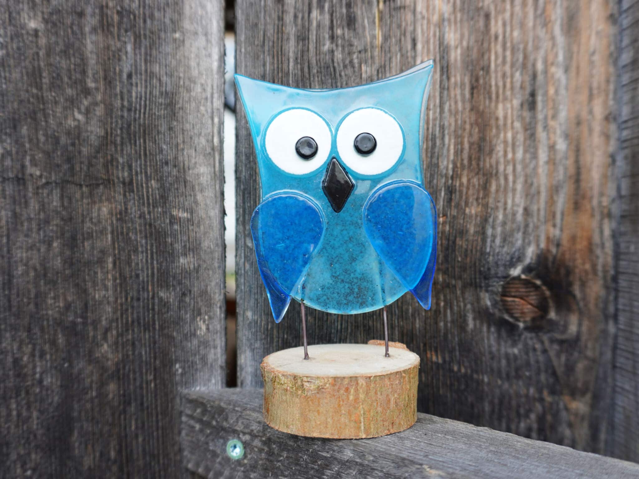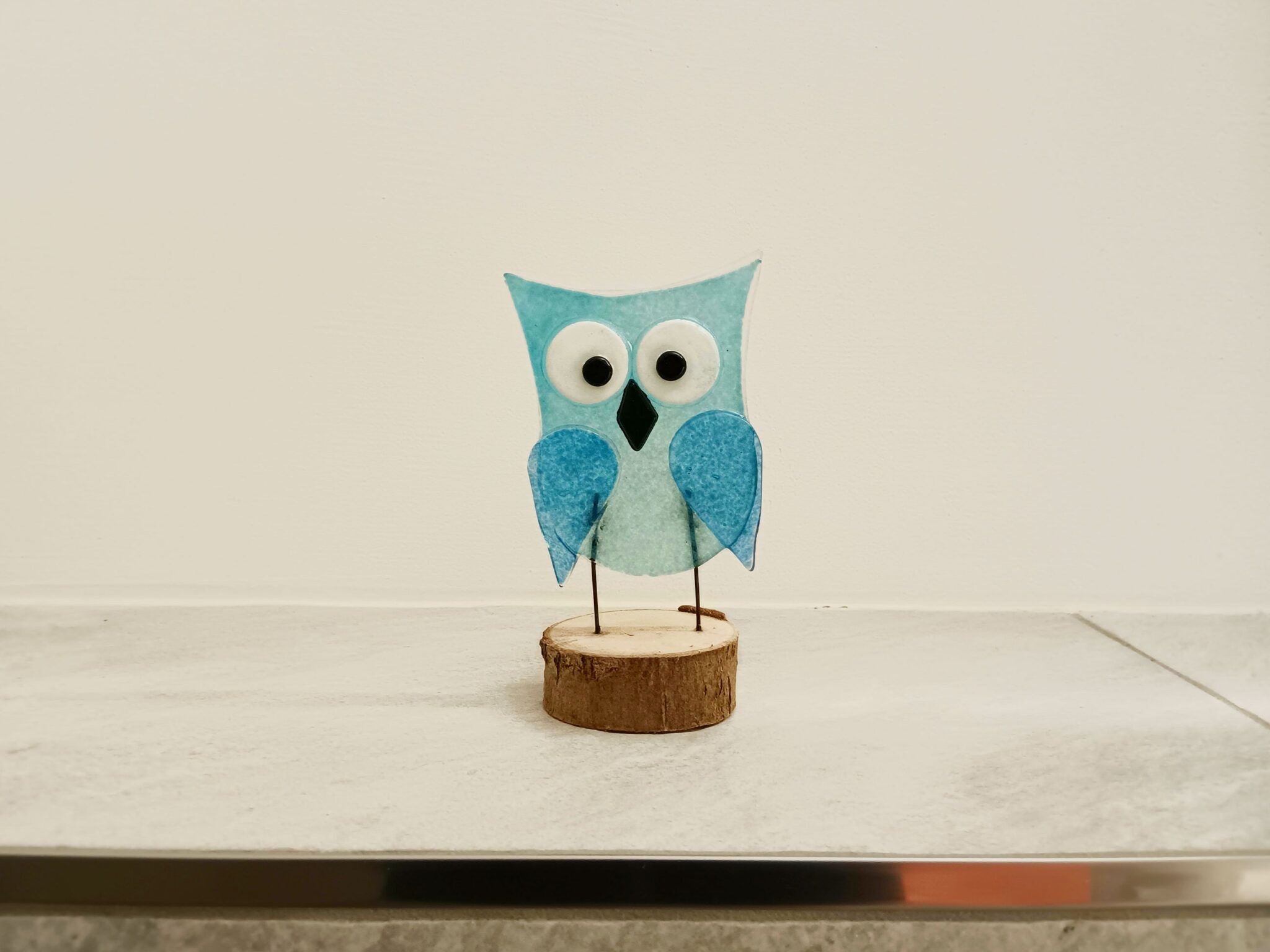 Ob fürs Büro, den Esstisch, im Schlafzimmer, Bad oder Garten. Die Glas Eule «Tobi» (Höhe 13cm) guckt Dich mit grooossen Augen an und macht gute Laune. Schweizer Dekoration von Hand gefertigt von Menschen mit Beinträchtigung in der Schweiz.