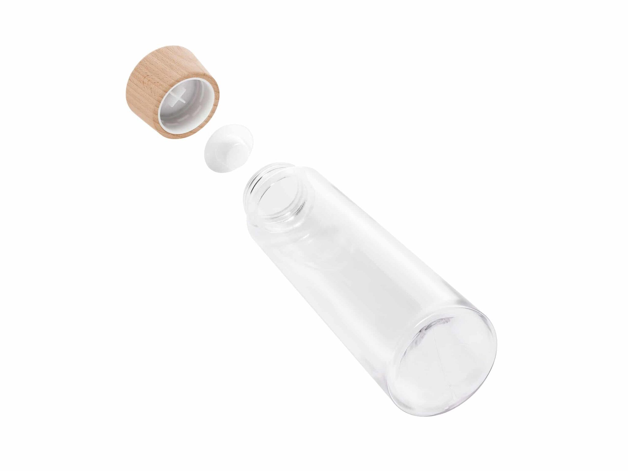 Swiss made und nachhaltig. Formschöne Schweizer Glas Trinkflasche (Inhalt 550ml) mit Deckel aus unbehandeltem Schweizer Buchenholz. Spülmaschinenfest. Für stille Getränke (warm/kalt) geeignet.