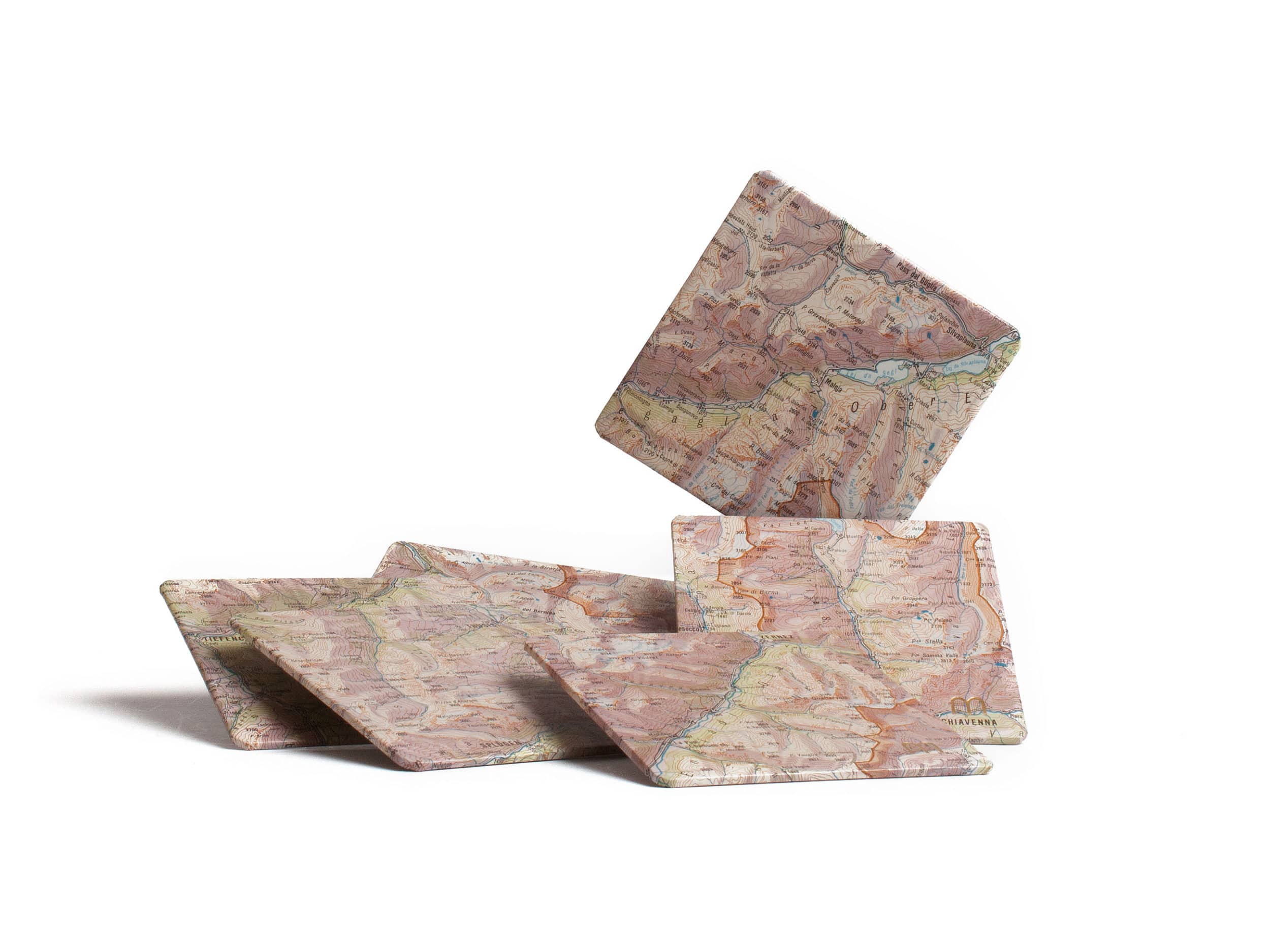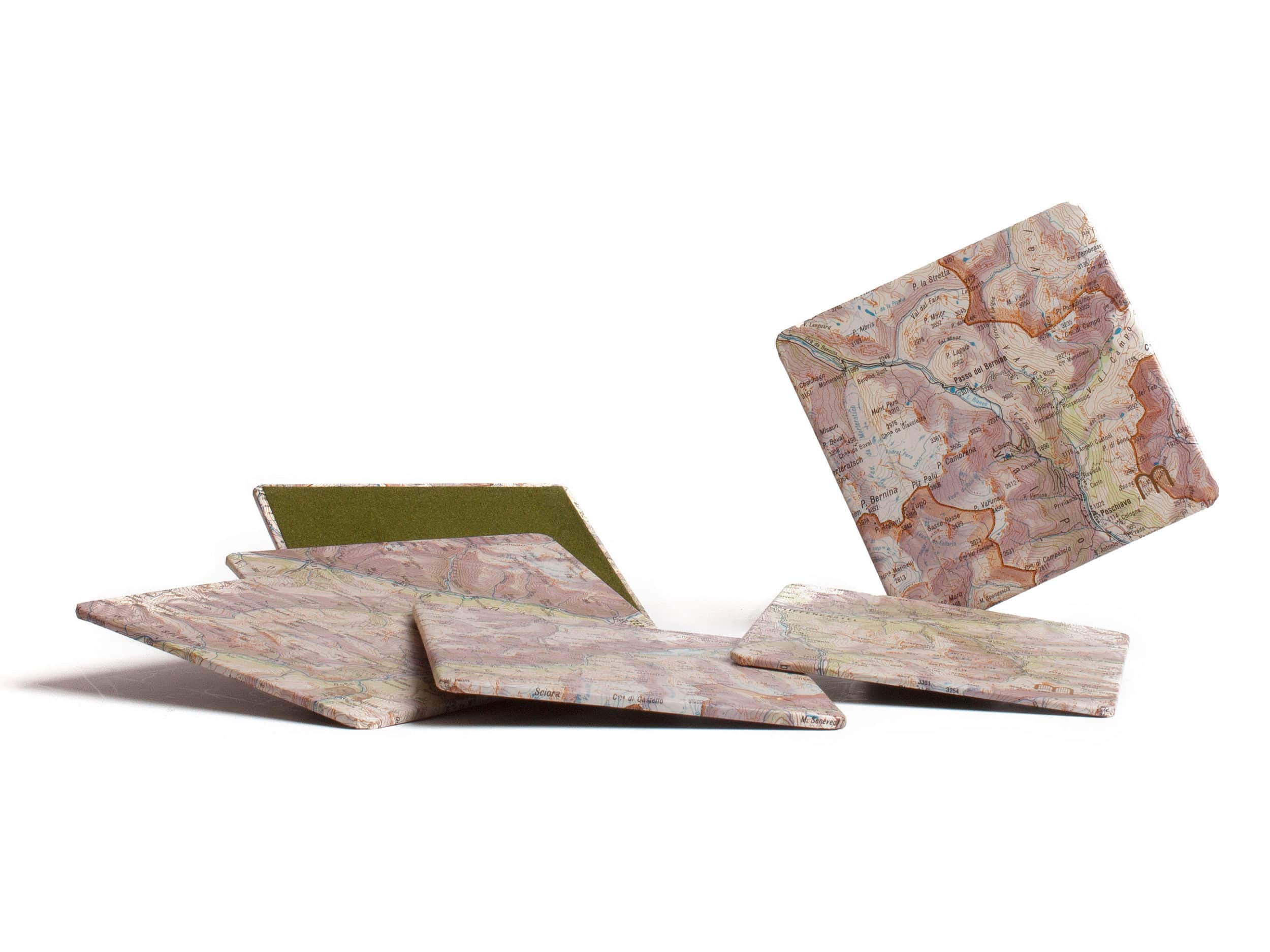 Die wunderschönen Recycling-Glasuntersetzer werden in liebevoller Handarbeit aus Recycling-Karton und alten Schweizer Landkarten gefertigt.