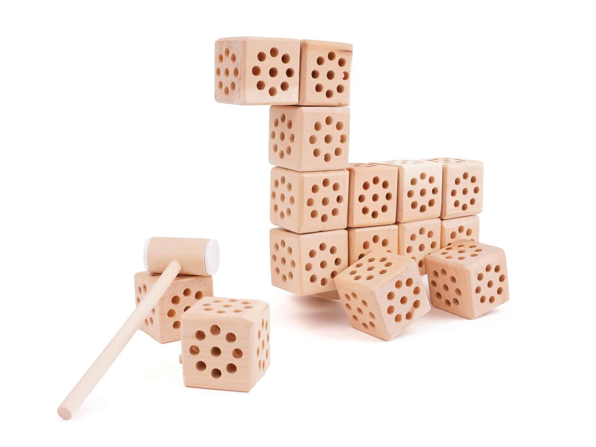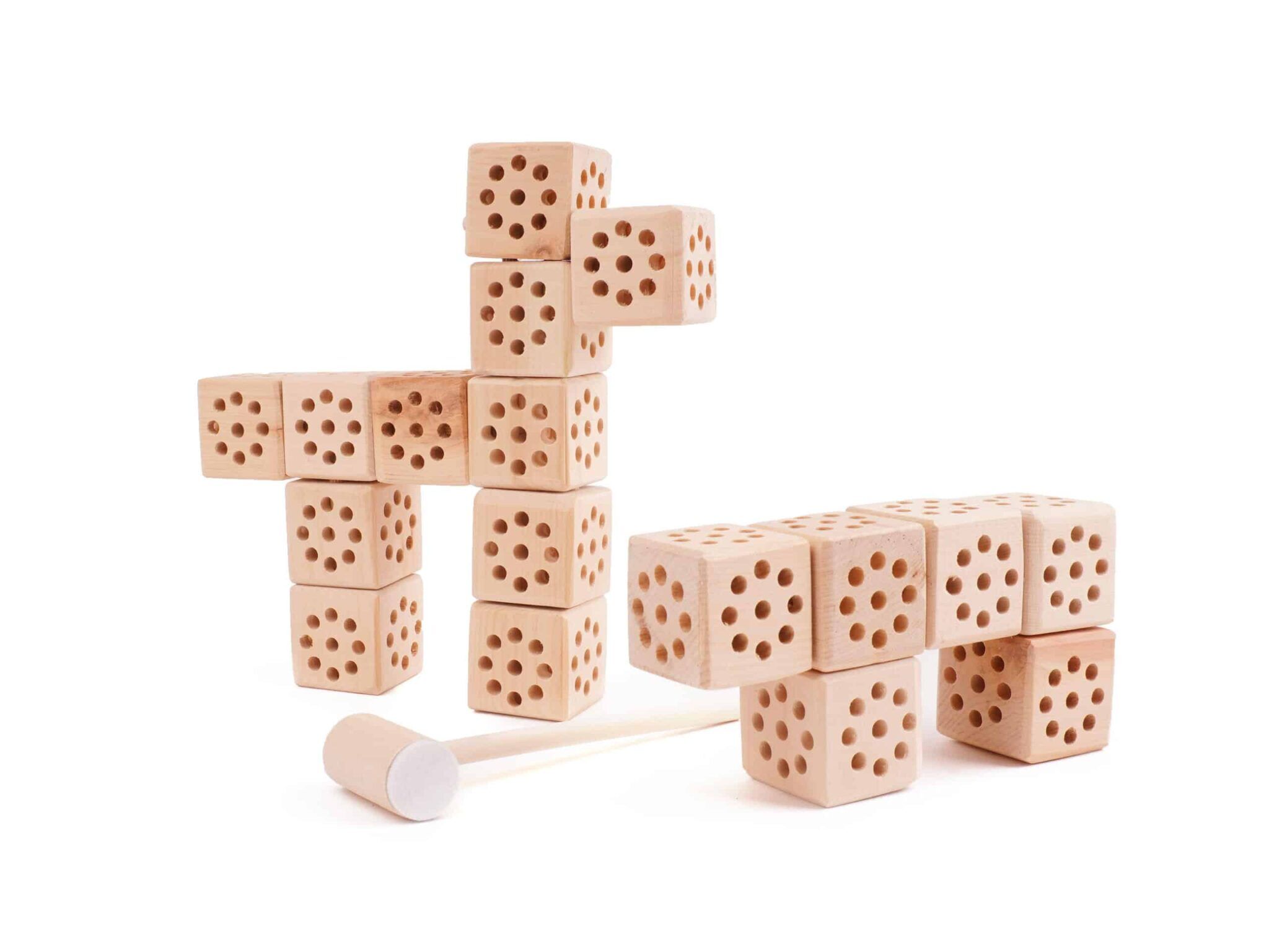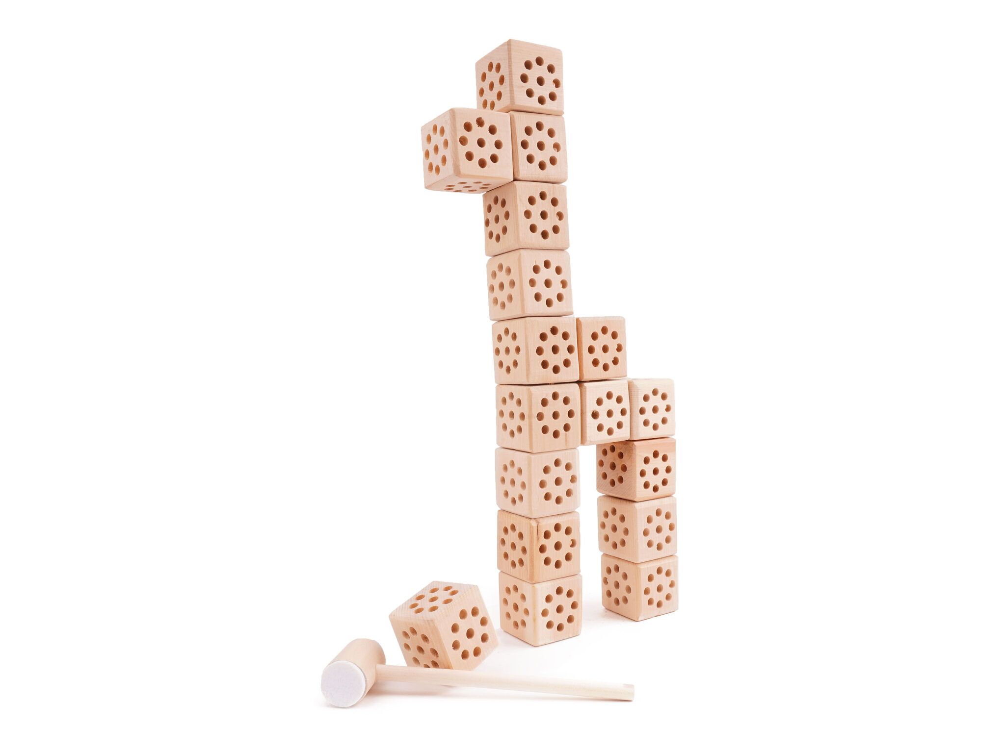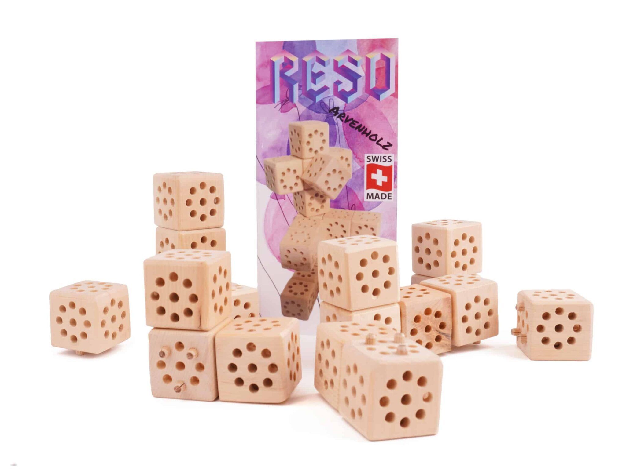 RESO ist ein patentiertes Schweizer Holzspiel aus Bündner Arvenholz. Mit den 17 Arvenholzklötzen (39,3mm mit je 48 Bohrungen und 3 fest verankerten Buchendübel) und dem Holzhämmerli lassen sich unzählige Tiere, Figuren, Skulpturen und Fantasiewelten erschaffen. Das dreidimensionale Bauen fördert die Vorstellungskraft, Feinmotorik, Fantasie und Kreativität des Kindes.