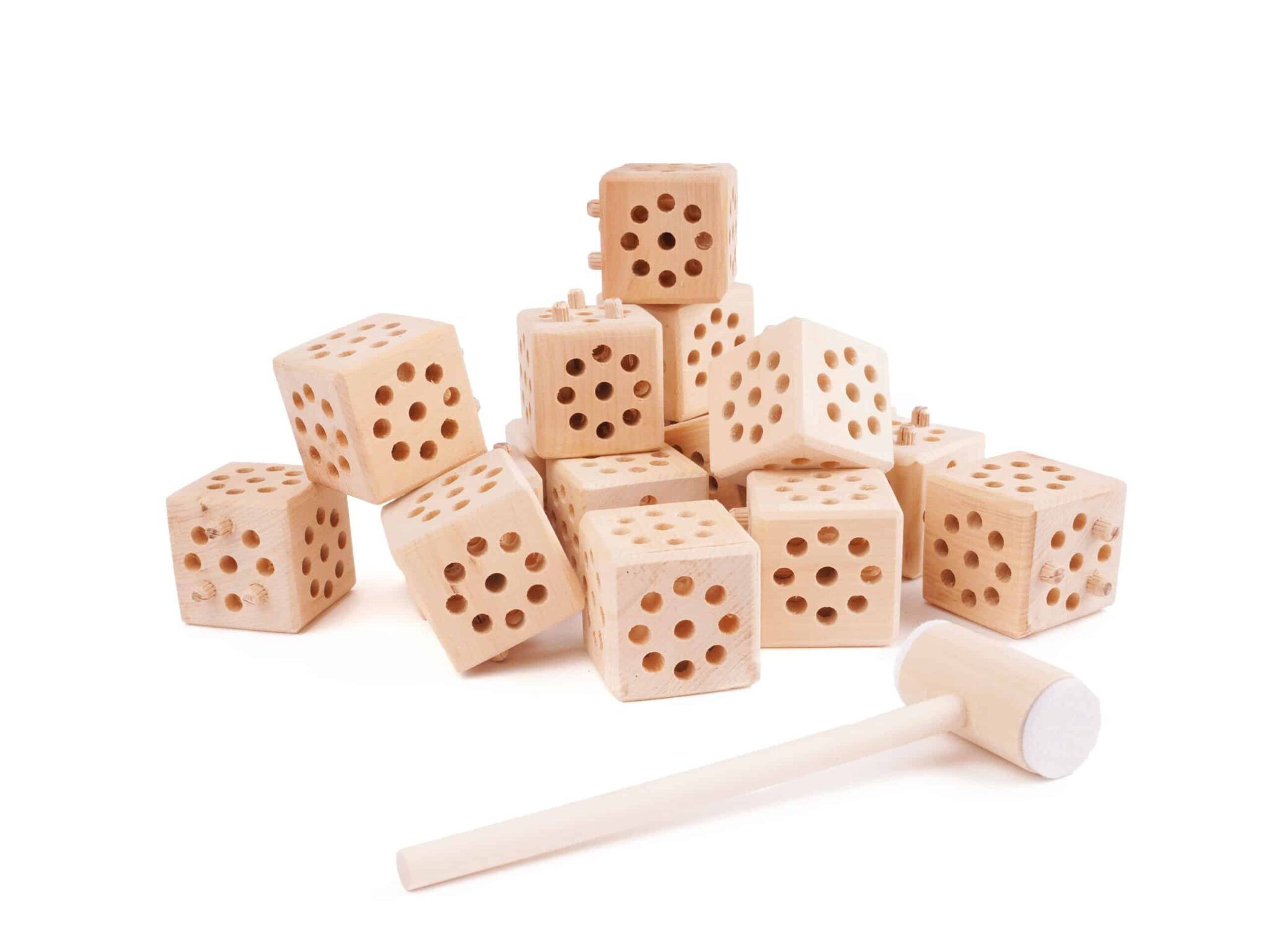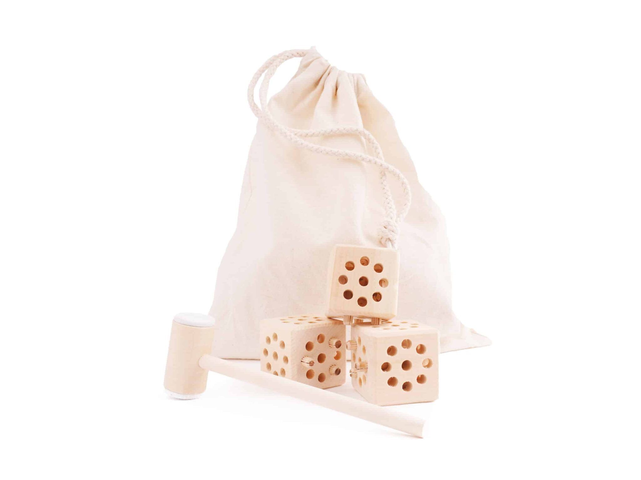 Für Kinder ab 2 Jahren geeignet, mit Holzhämmerli und verpackt in Stoffbeutel.