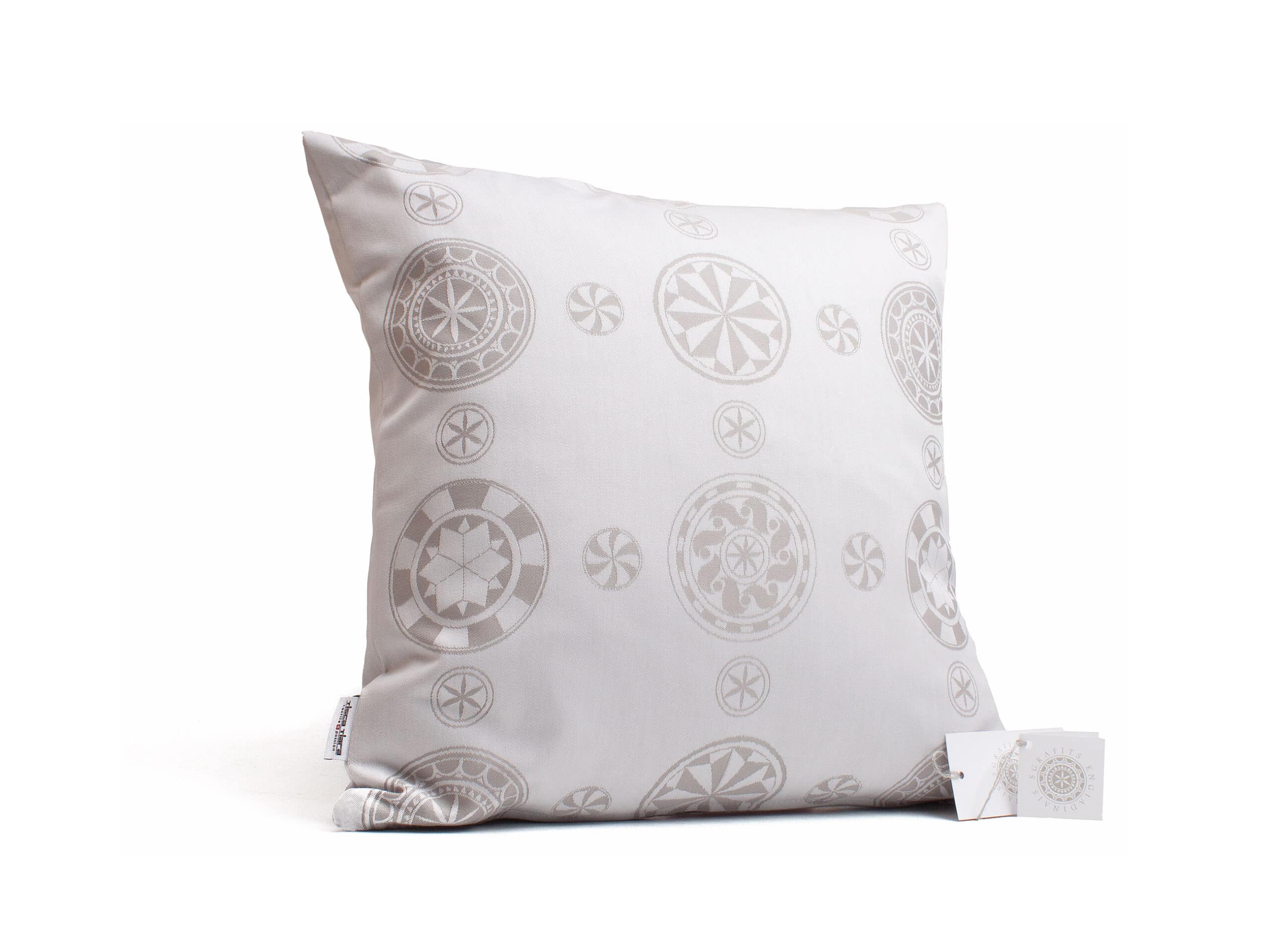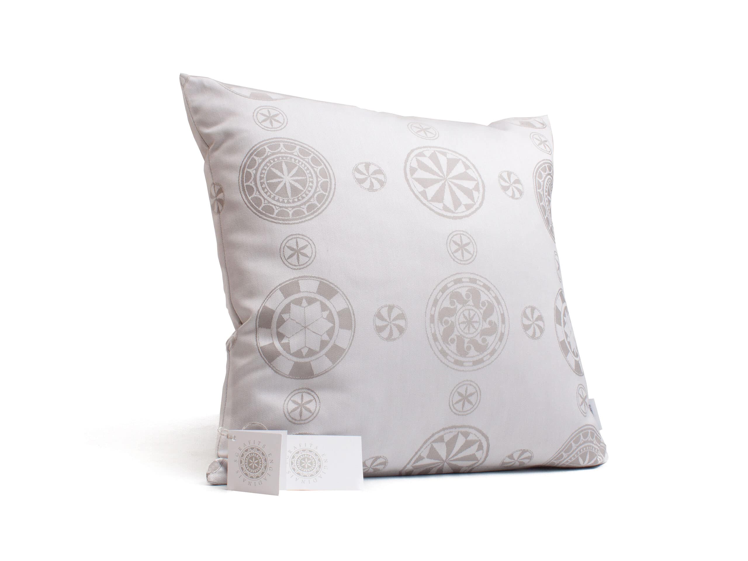 Kissenüberzug Mazzina – Die Augen schliessen und vom Engadin träumen. Auf dem Sofa, Bett oder der Sitzbank. Am besten mit dem Dekokissen, gewoben mit Engadiner Sgraffitomotiven. Der Überzug ist für Kissen in der Grösse 40x40cm.