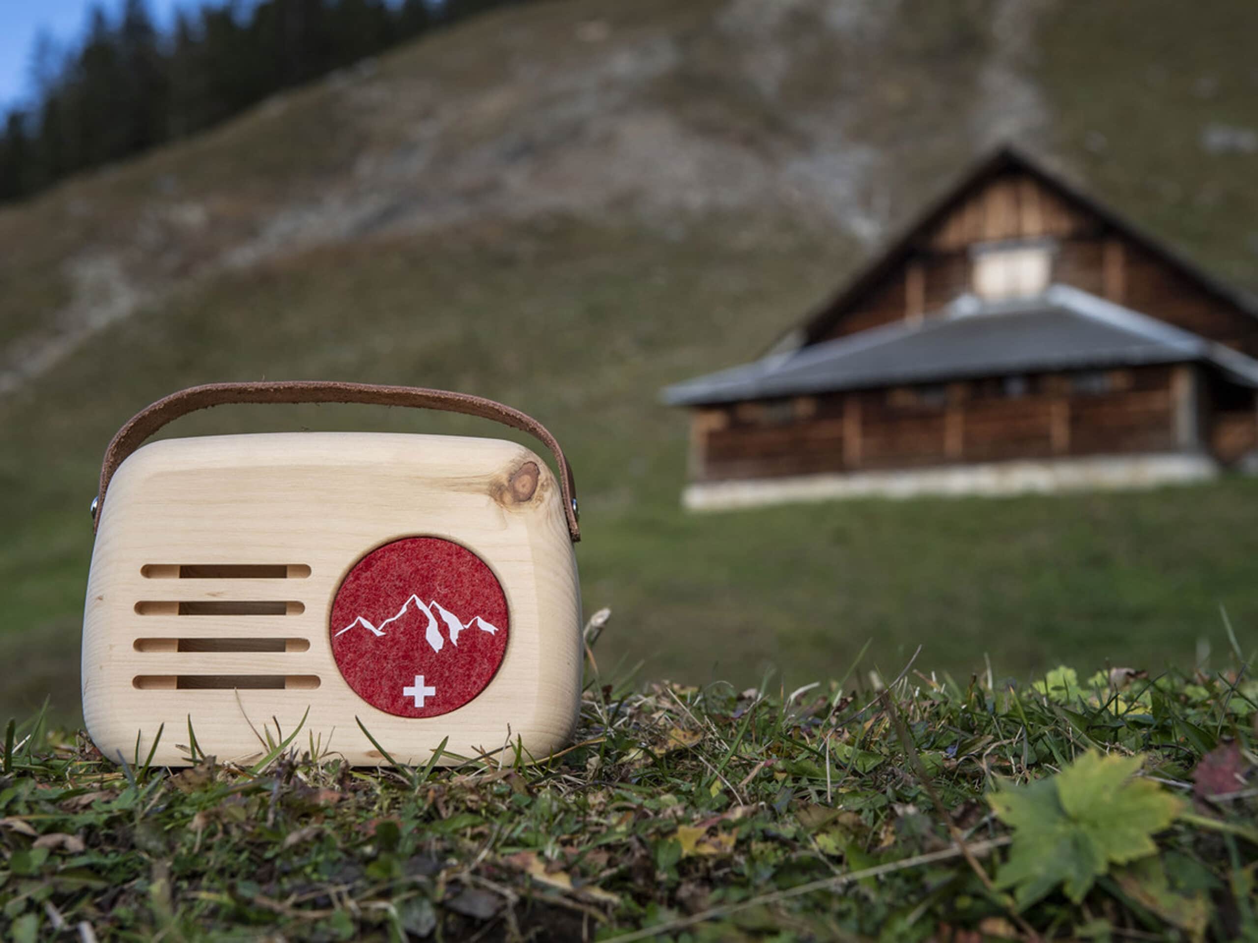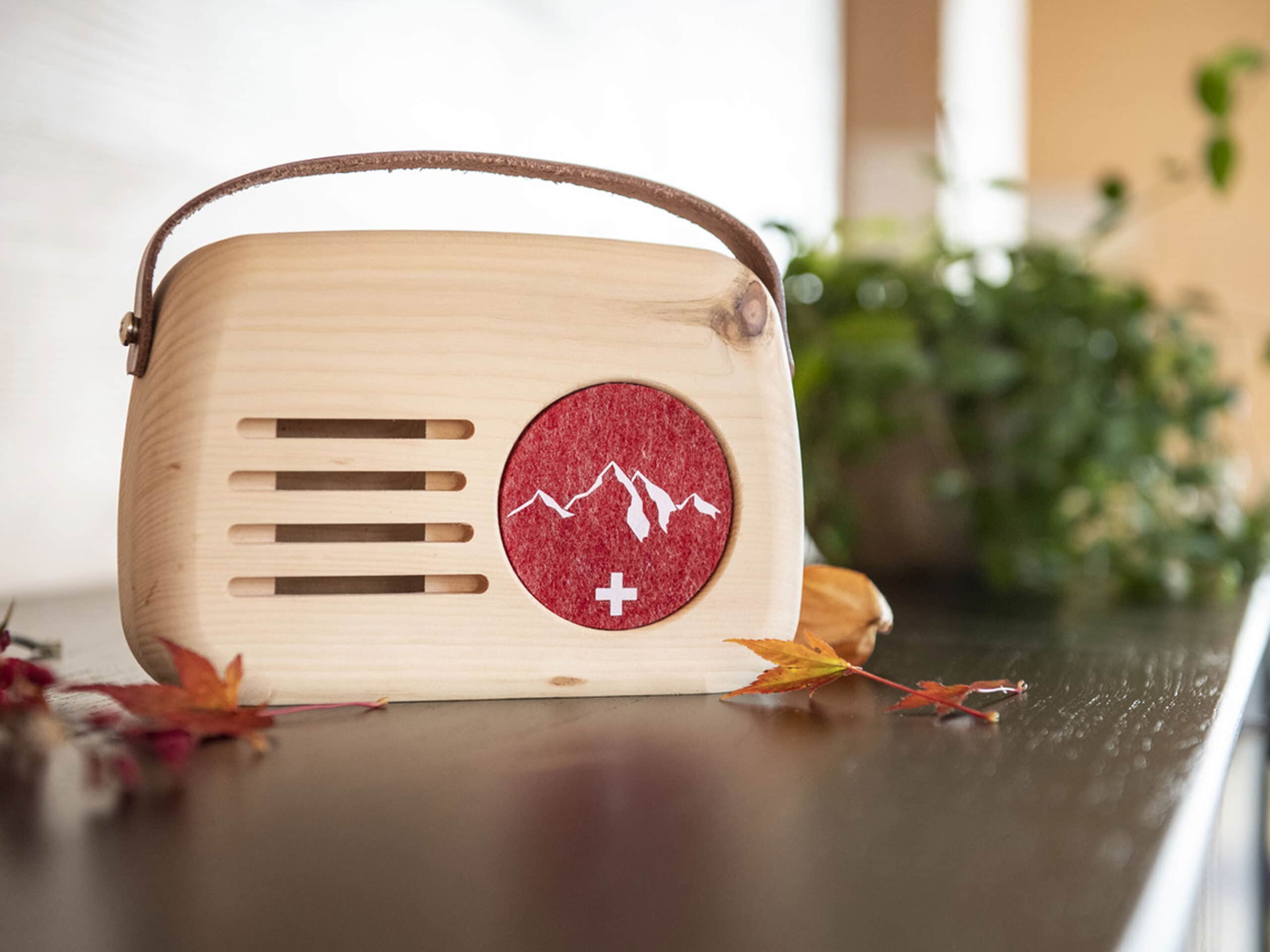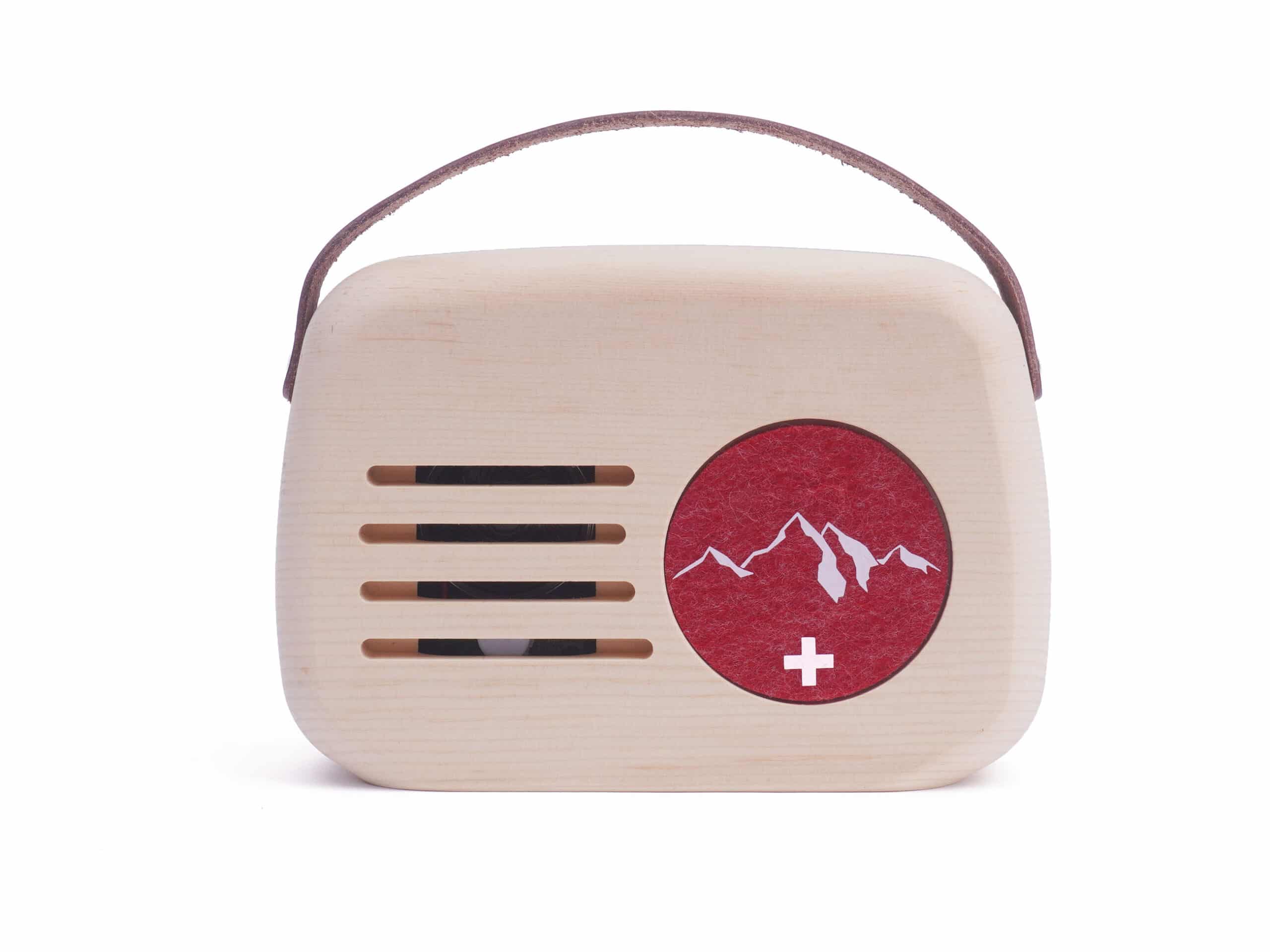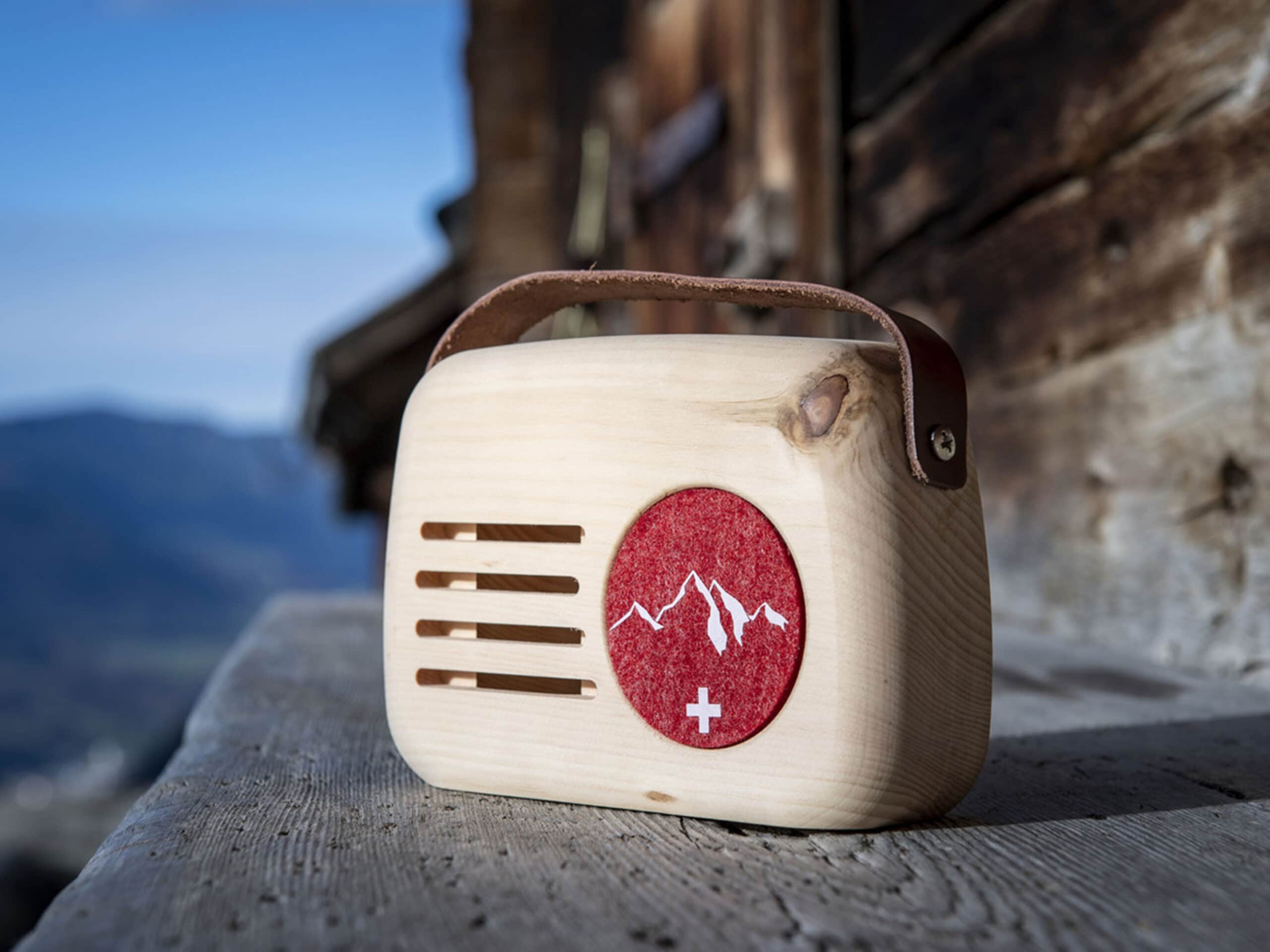 Klangbox aus Schweizer Arvenholz mit Bewegungsmelder. Mit entspannenden Schweizer Klängen wie nostalgische Kuhglocken, Alphorn oder Naturjutze. Für etwas Entschleunigung im Alltag.