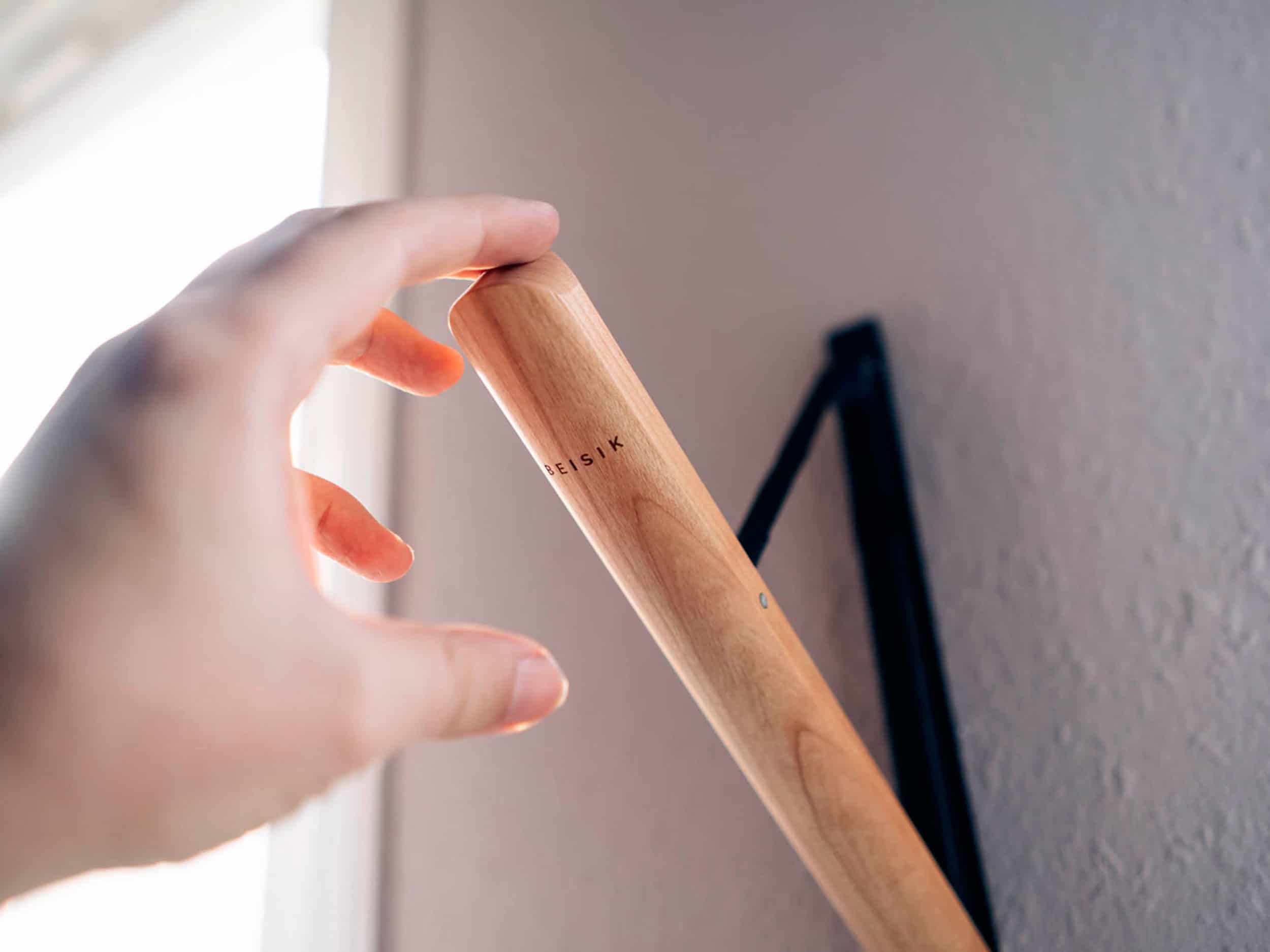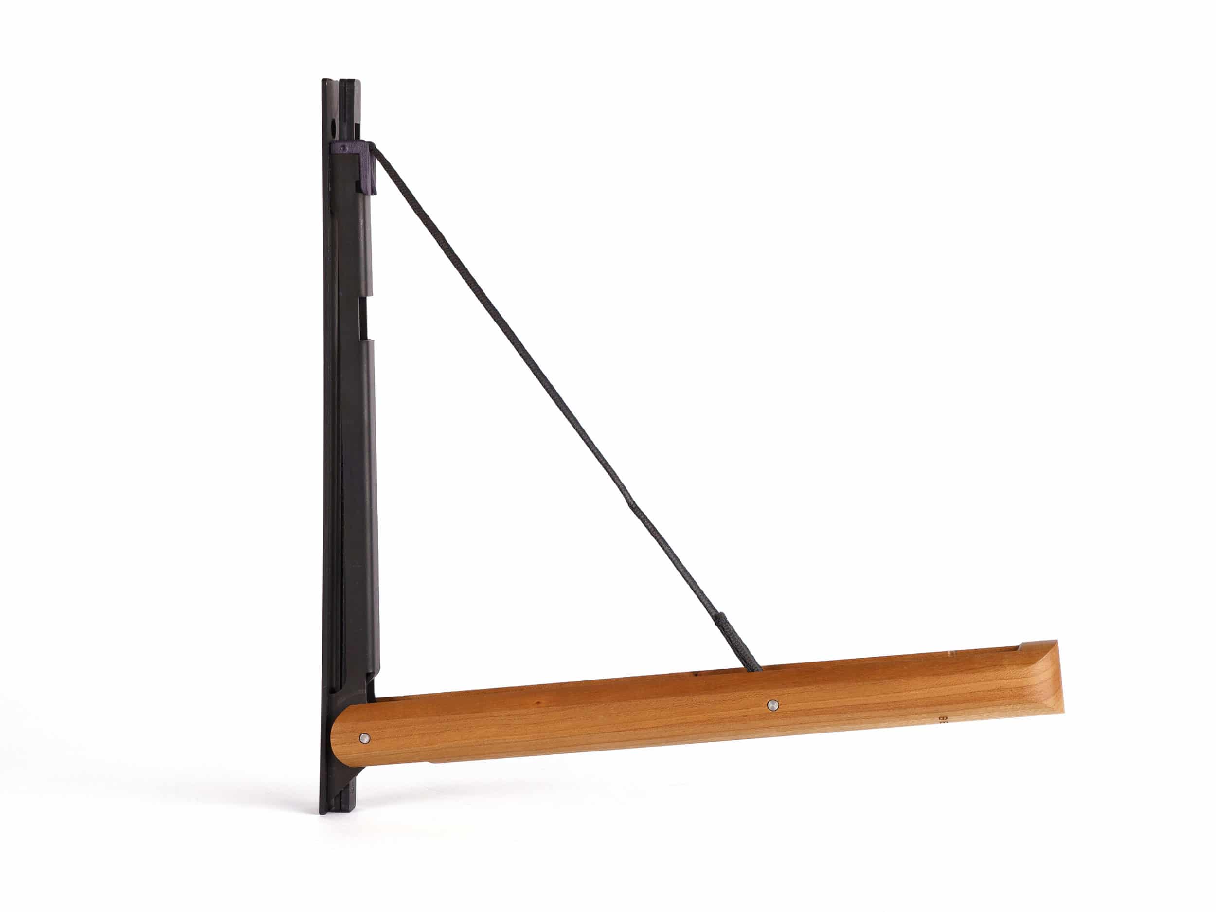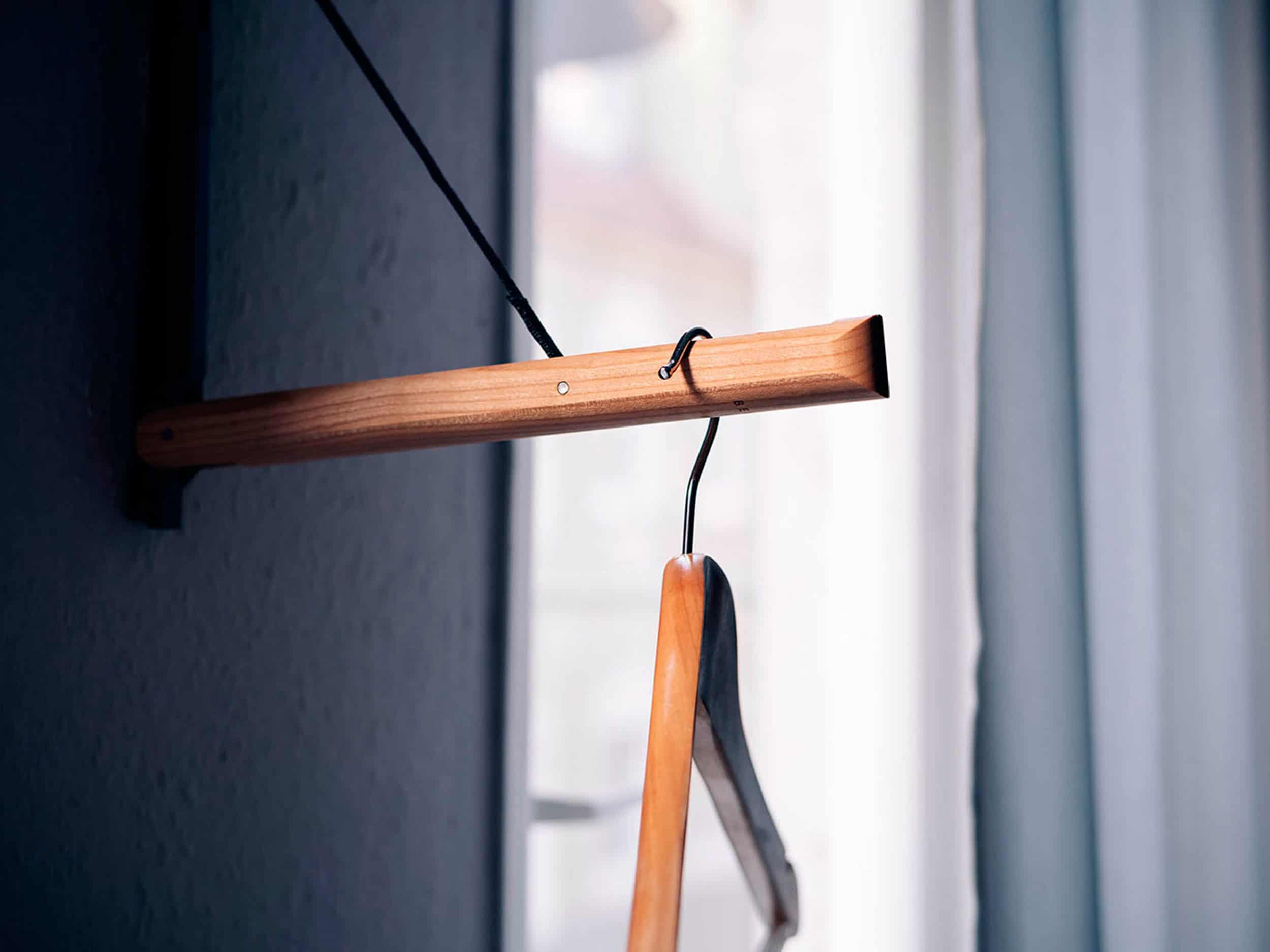 Elegante, hochwertige Kleiderstange aus Kirschbaumholz, dank raffiniertem Klappmechanismus ganz besonders für knappe Platzverhältnisse. Entwickelt und produziert in der Schweiz.