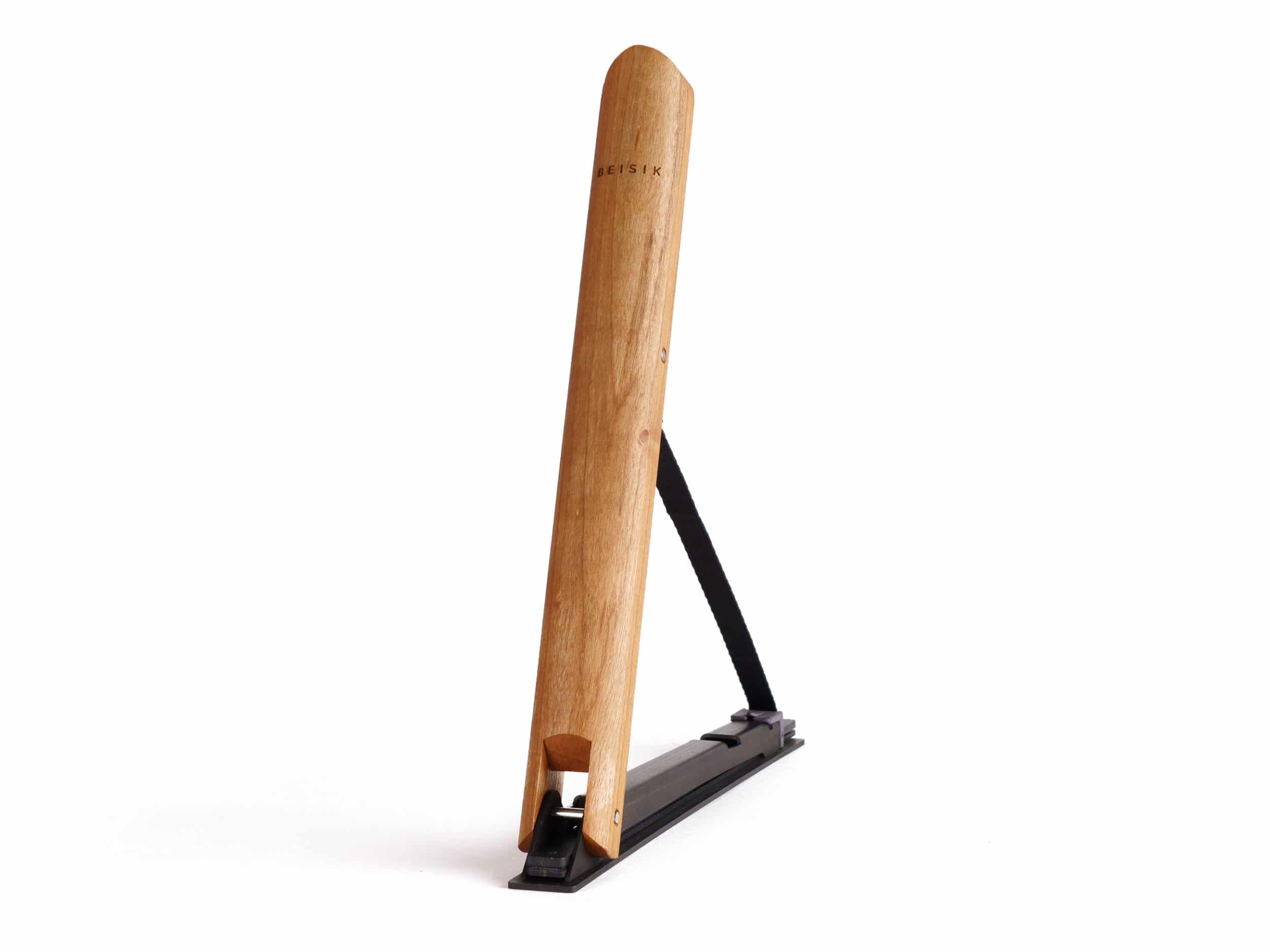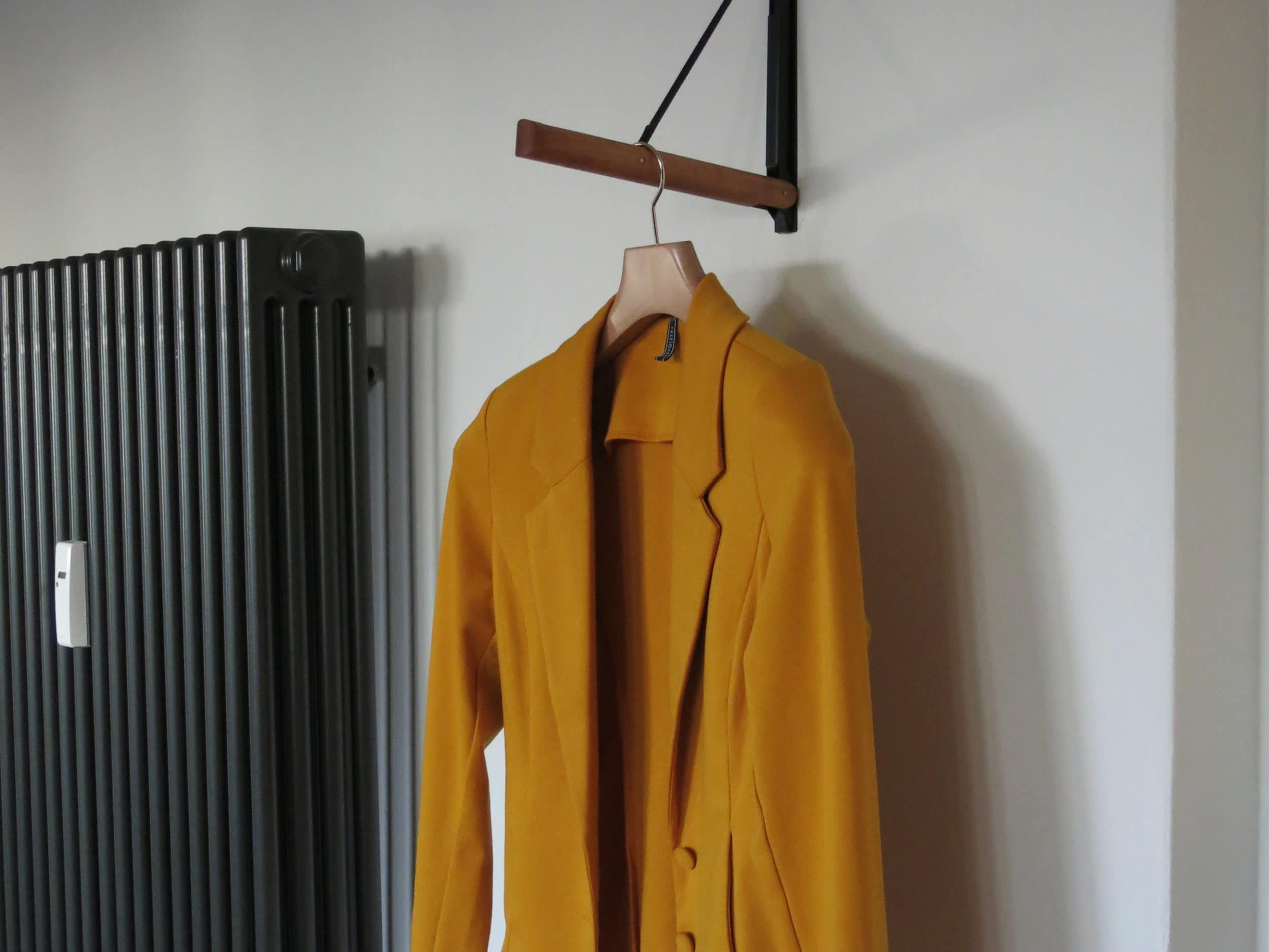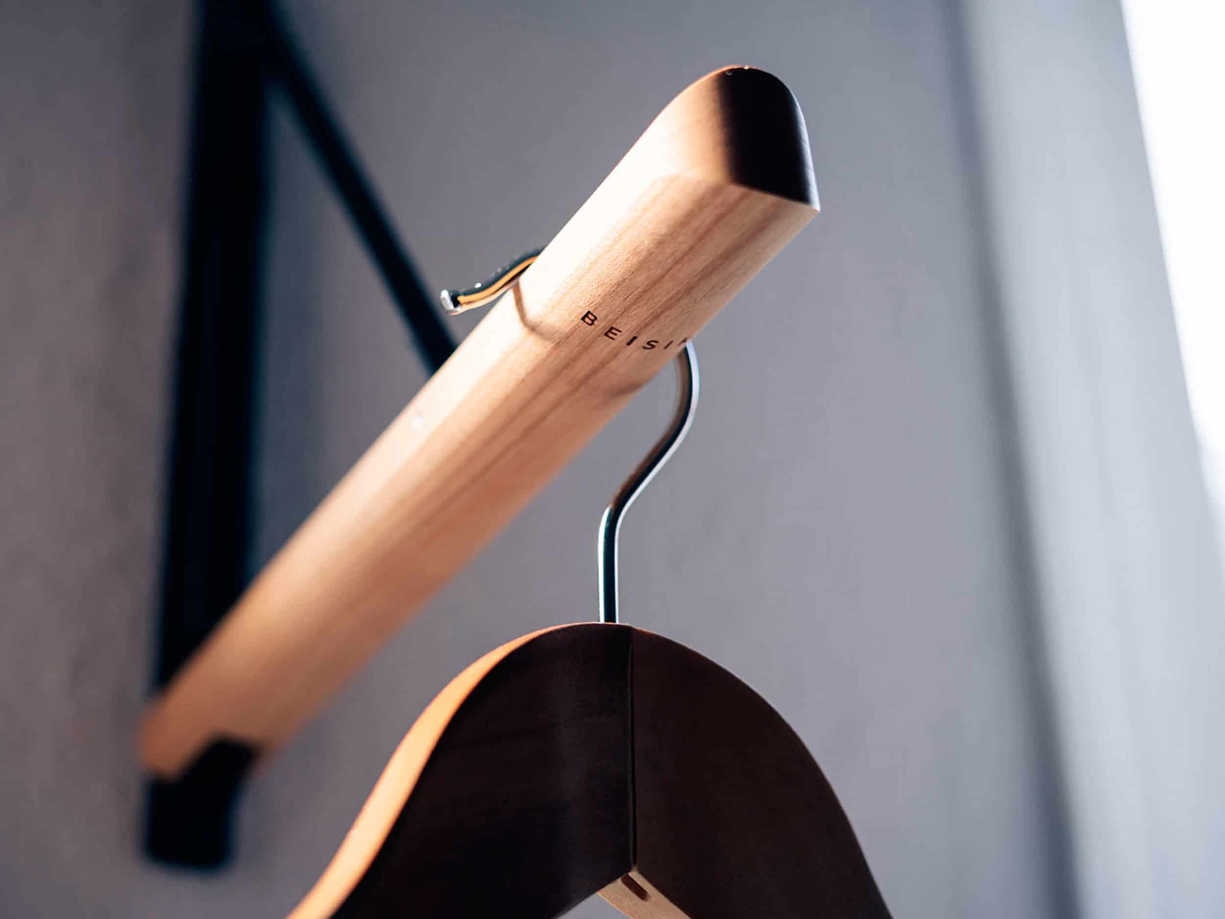 Elegante, hochwertige Kleiderstange aus Kirschbaumholz, dank raffiniertem Klappmechanismus ganz besonders für knappe Platzverhältnisse. Entwickelt und produziert in der Schweiz.
