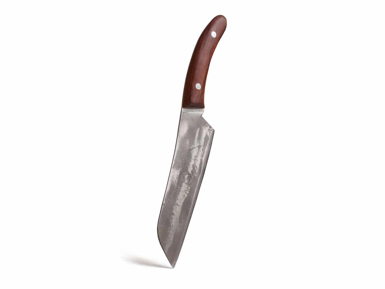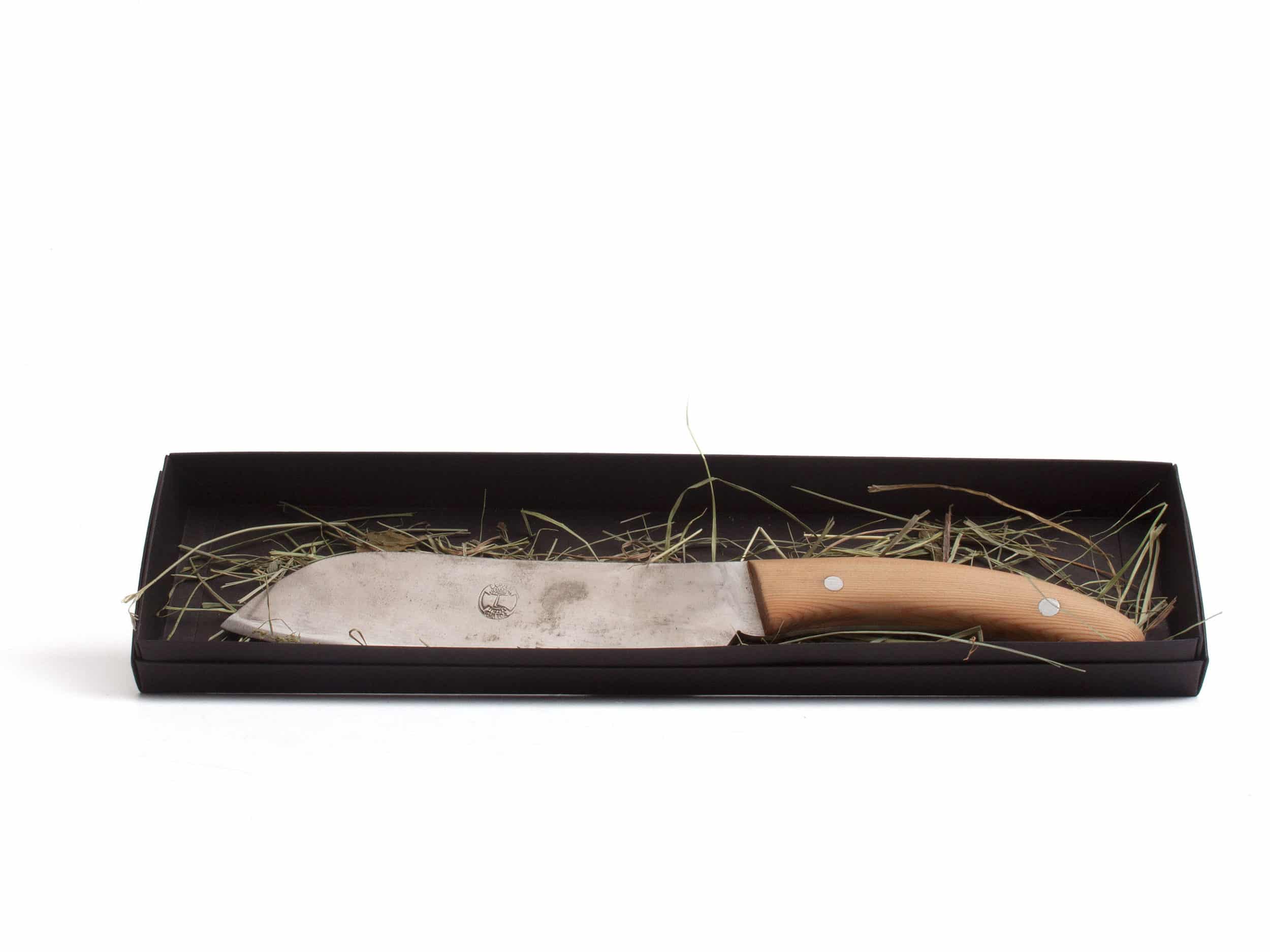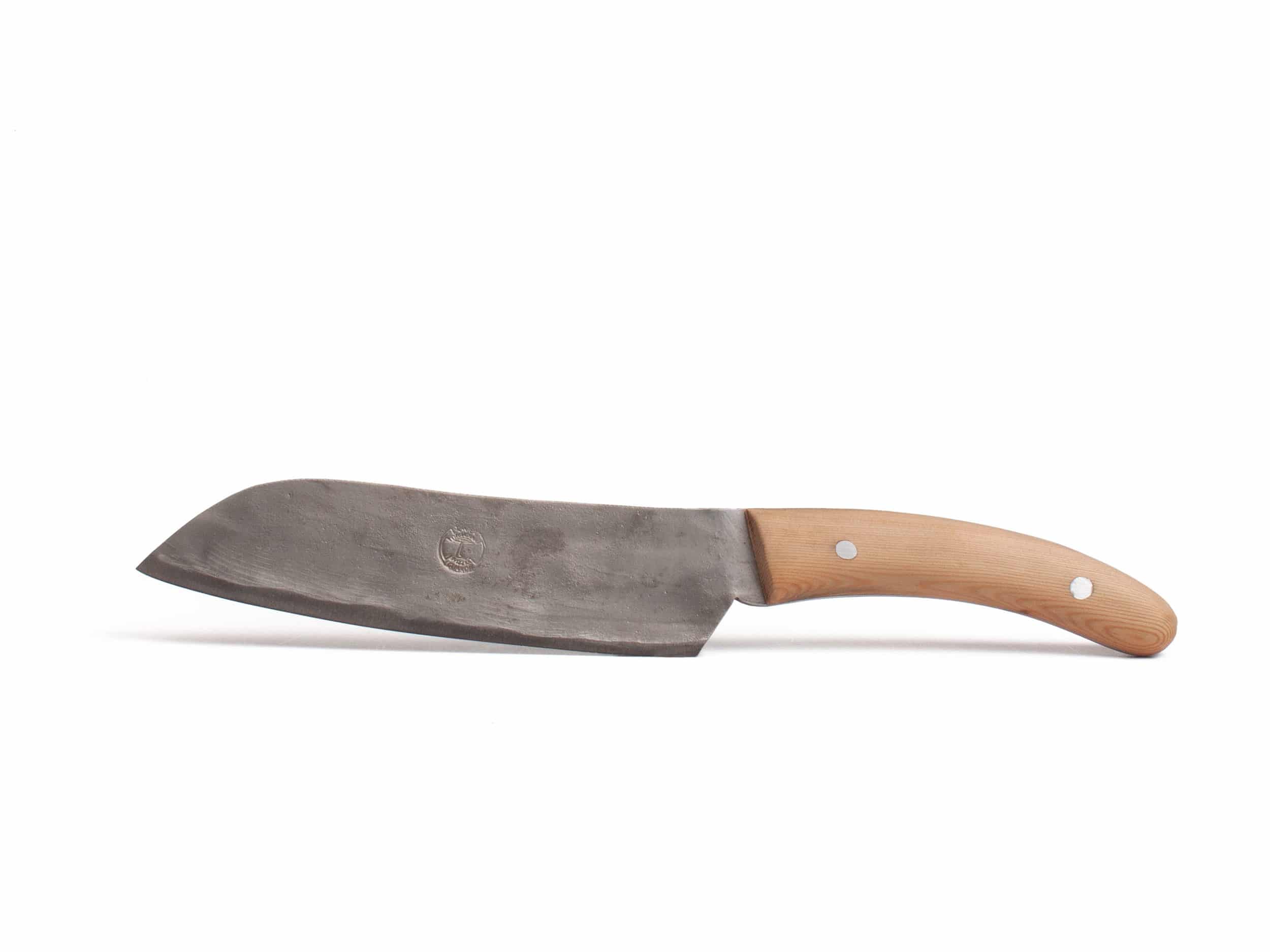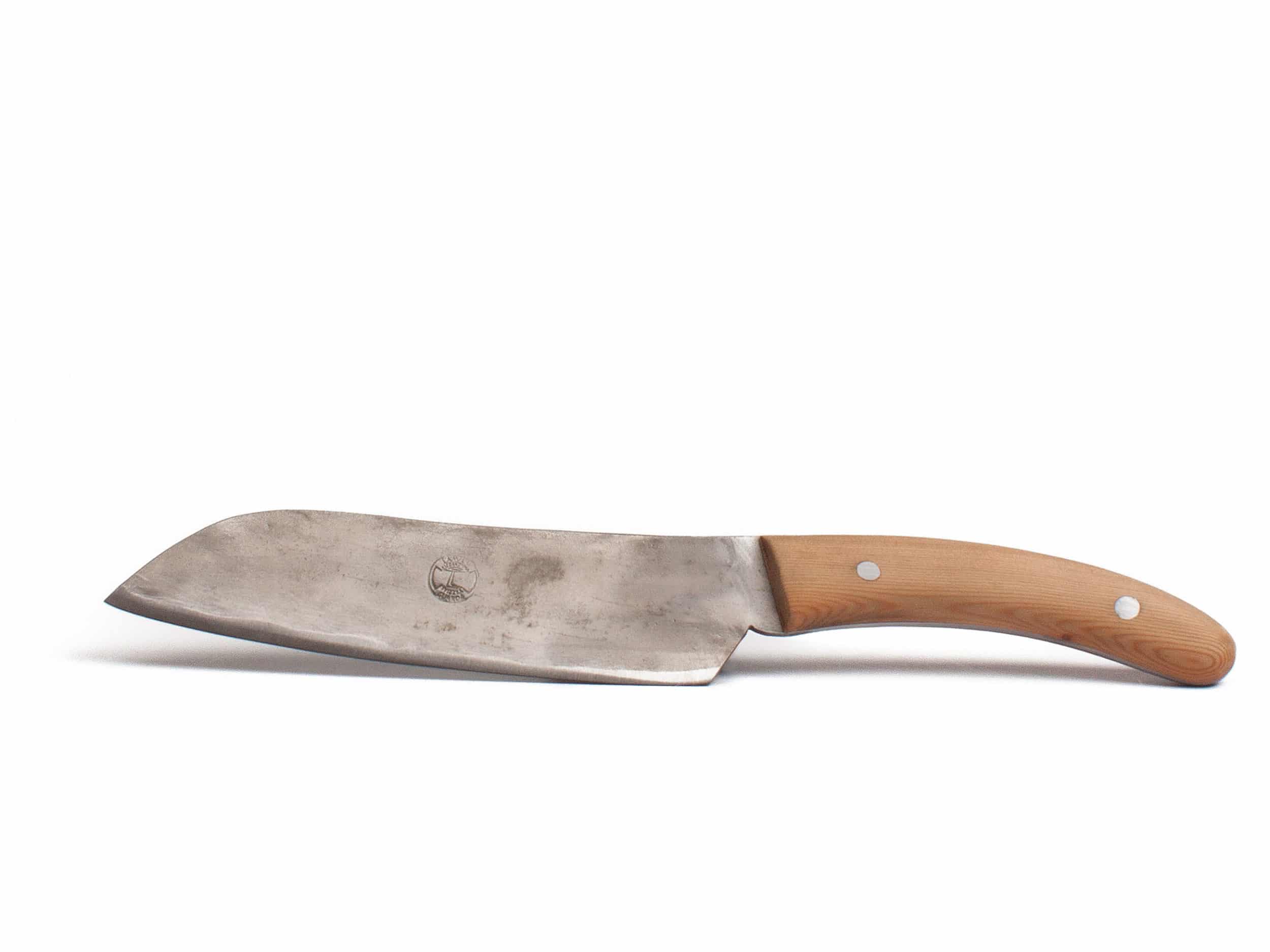 Ein Schweizer Küchenmesser mit Charakter. Handgeschmiedet, gebürstet und geschliffen und mit einem Griff aus altem Lärchenholz.
