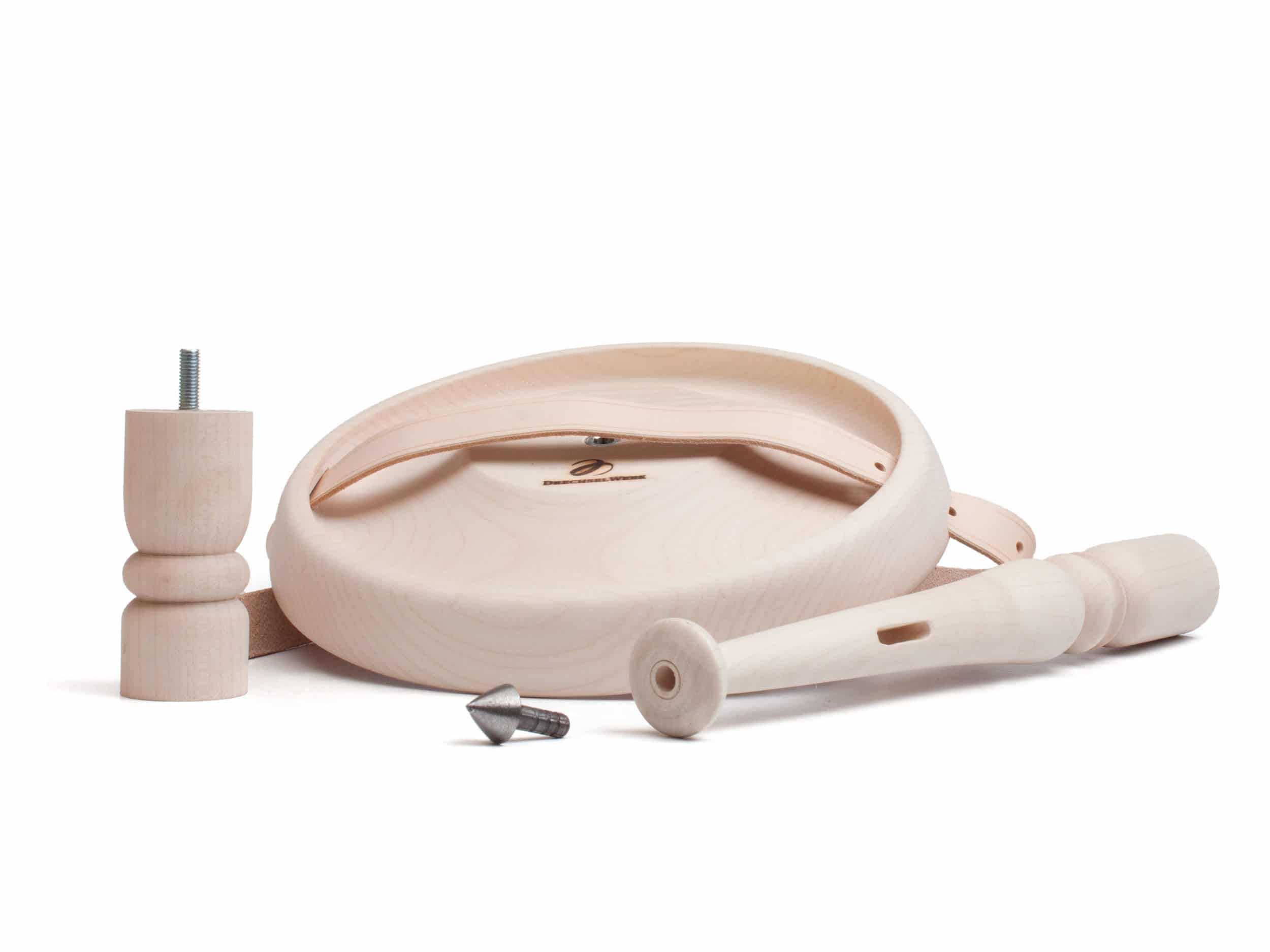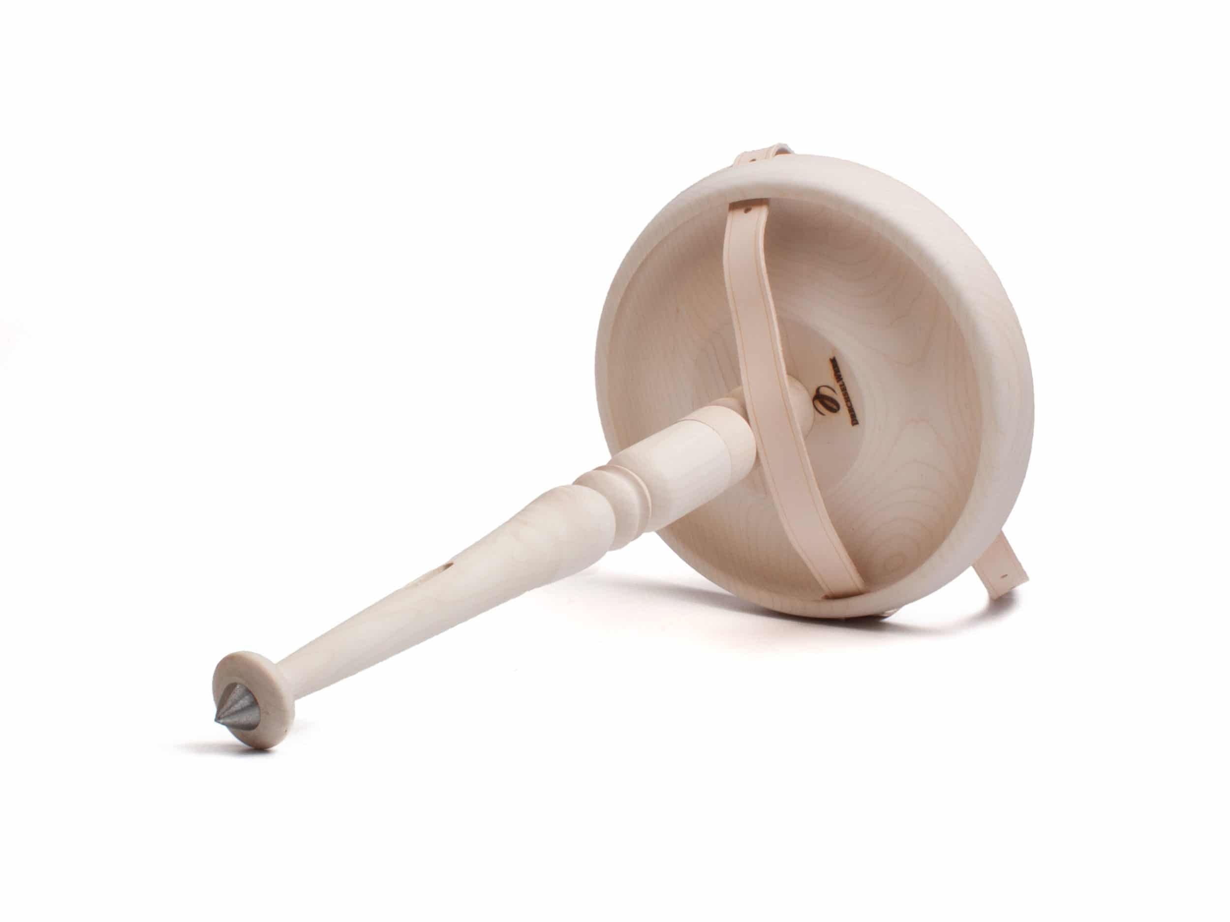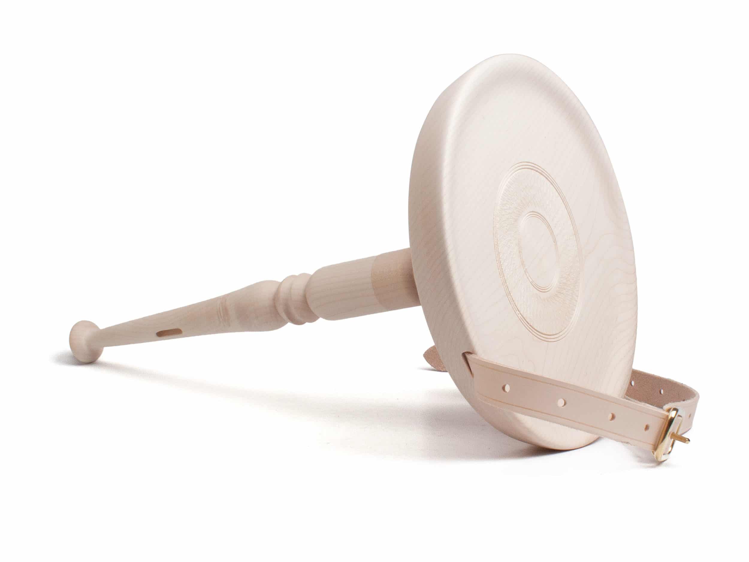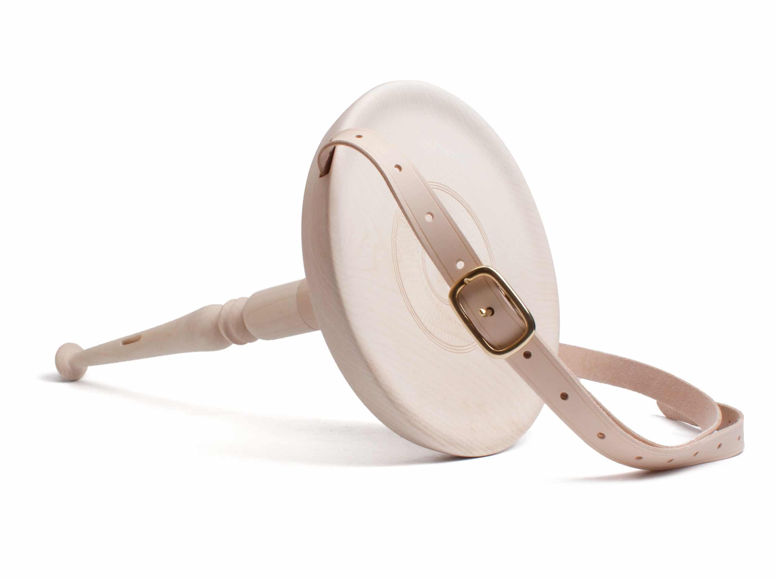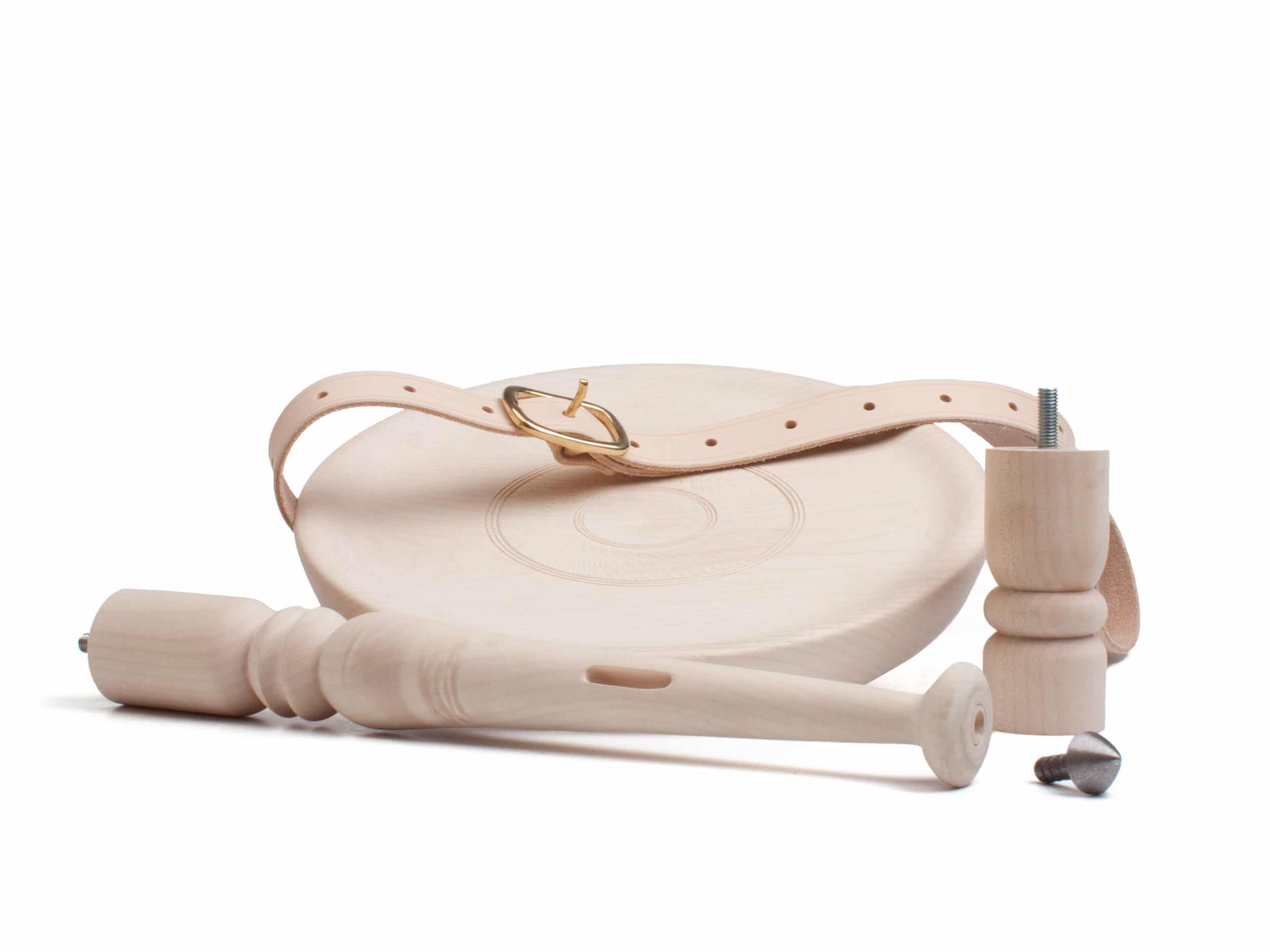 Das gedrechselte Bein (zwei Sitzhöhen einstellbar) kann ganz einfach von der Sitzfläche abgeschraubt, mit dem Naturledergurt verschlauft und als Ganzes umgehängt werden.