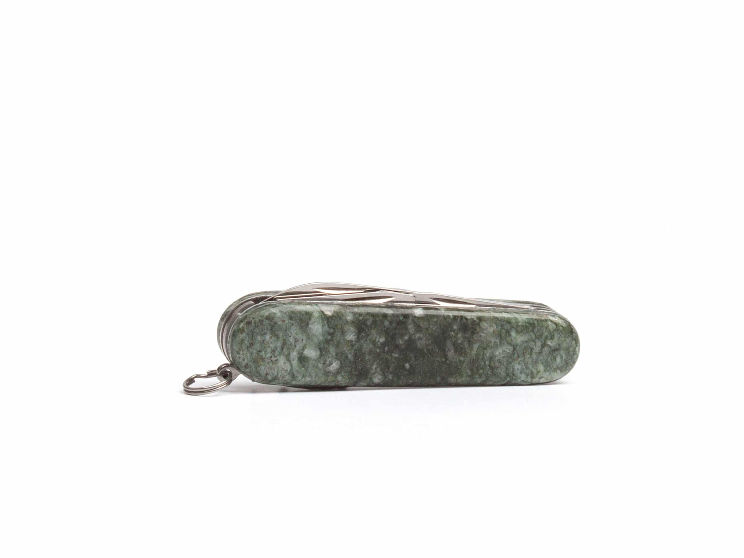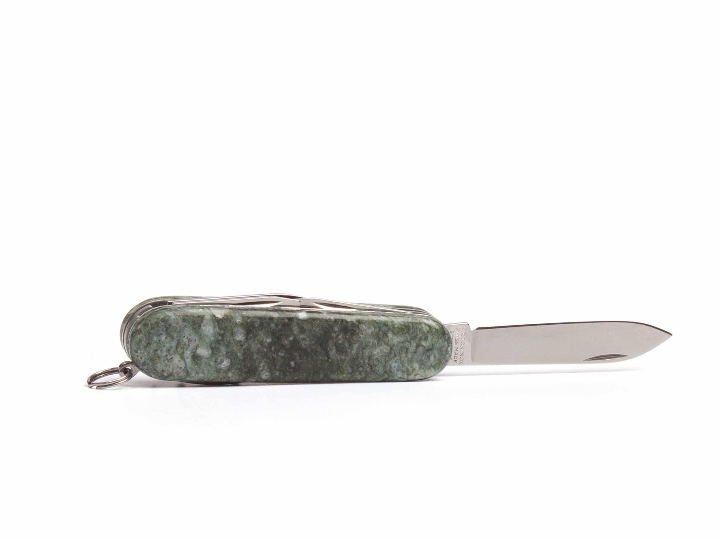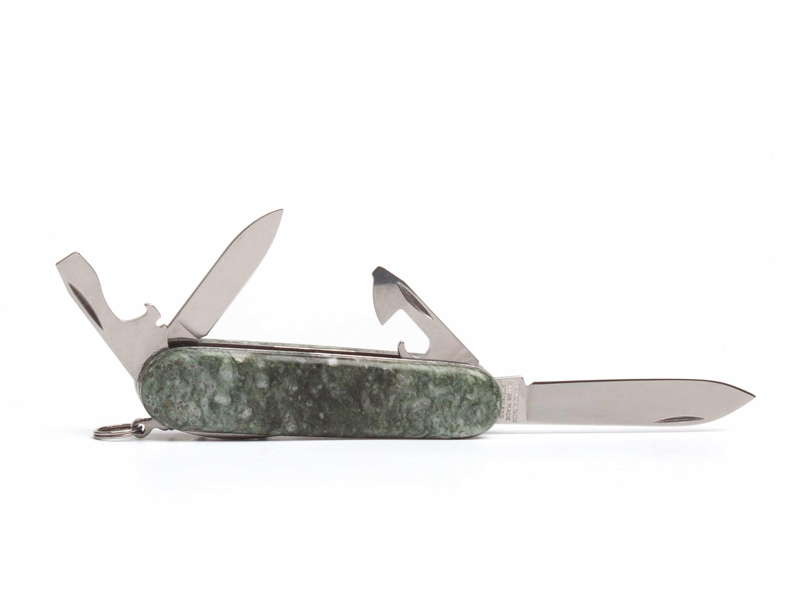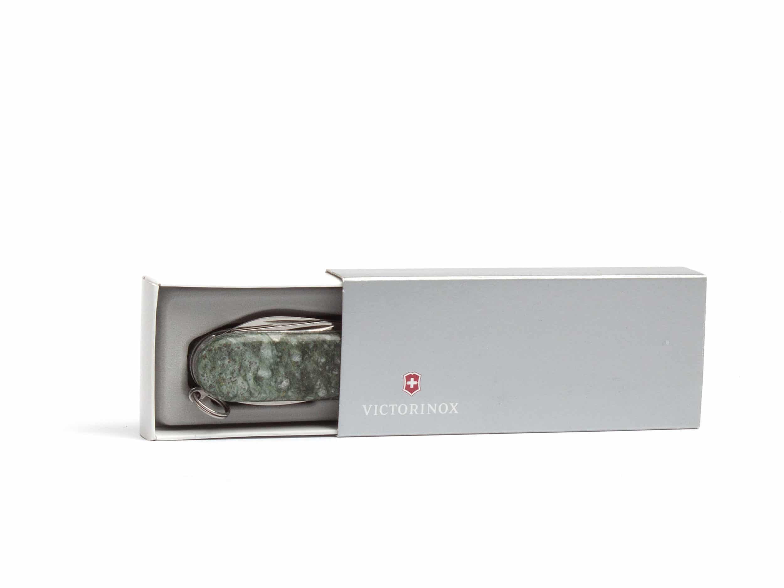 Dieses wunderschöne Victorinox-Messer ist von einer Schale aus Andeerer Granit umgeben und enthält allerlei Funktionen.