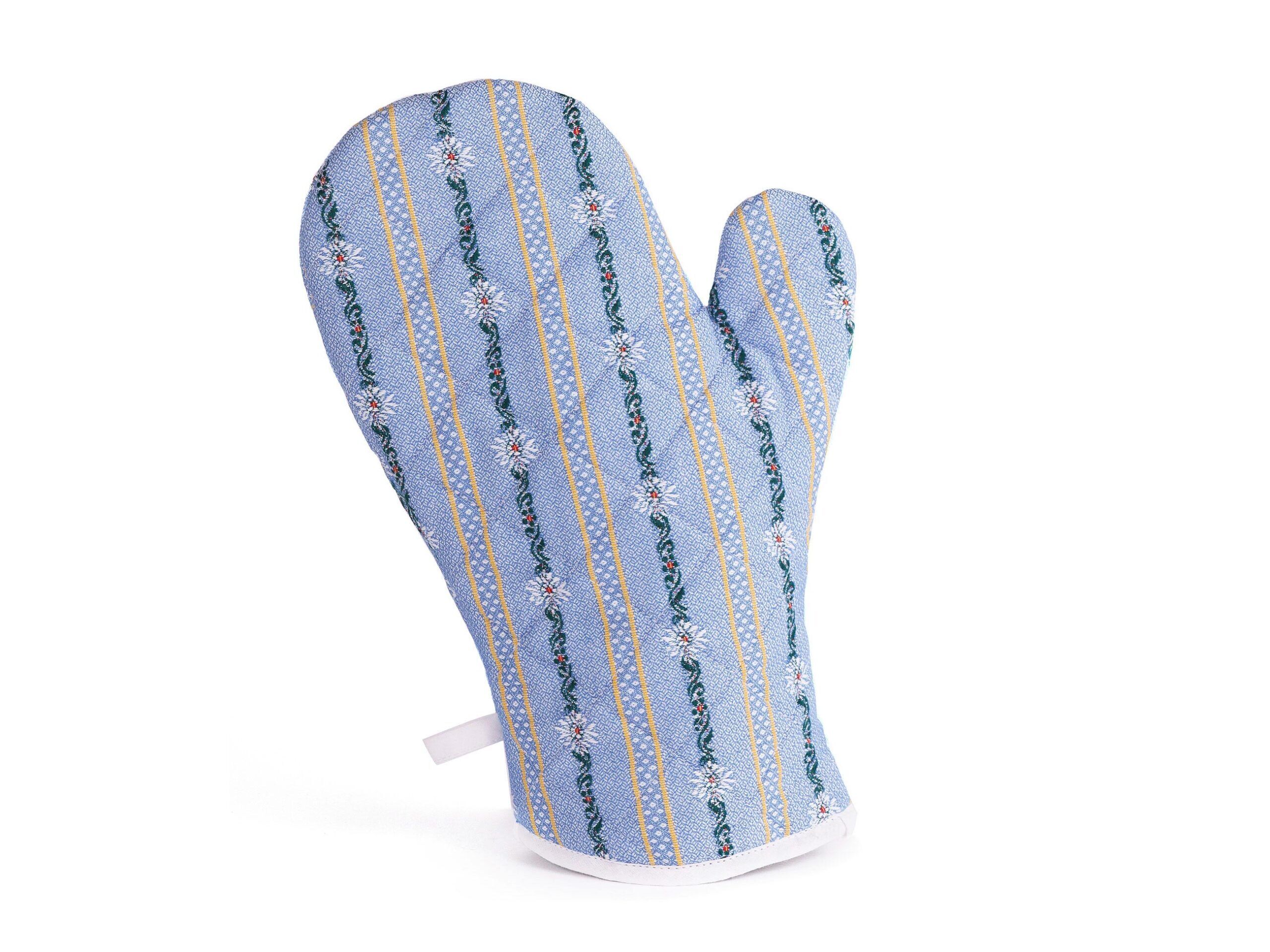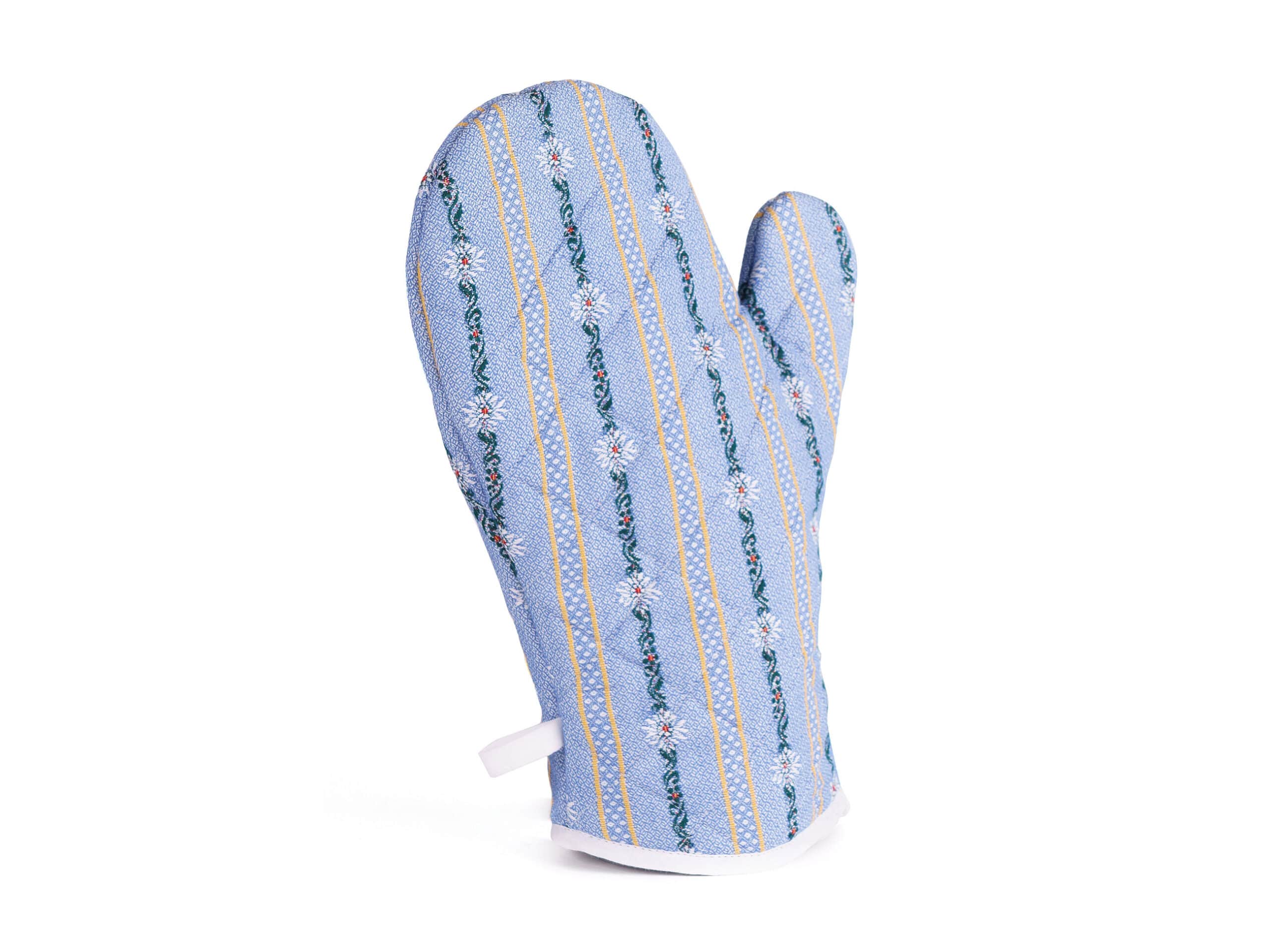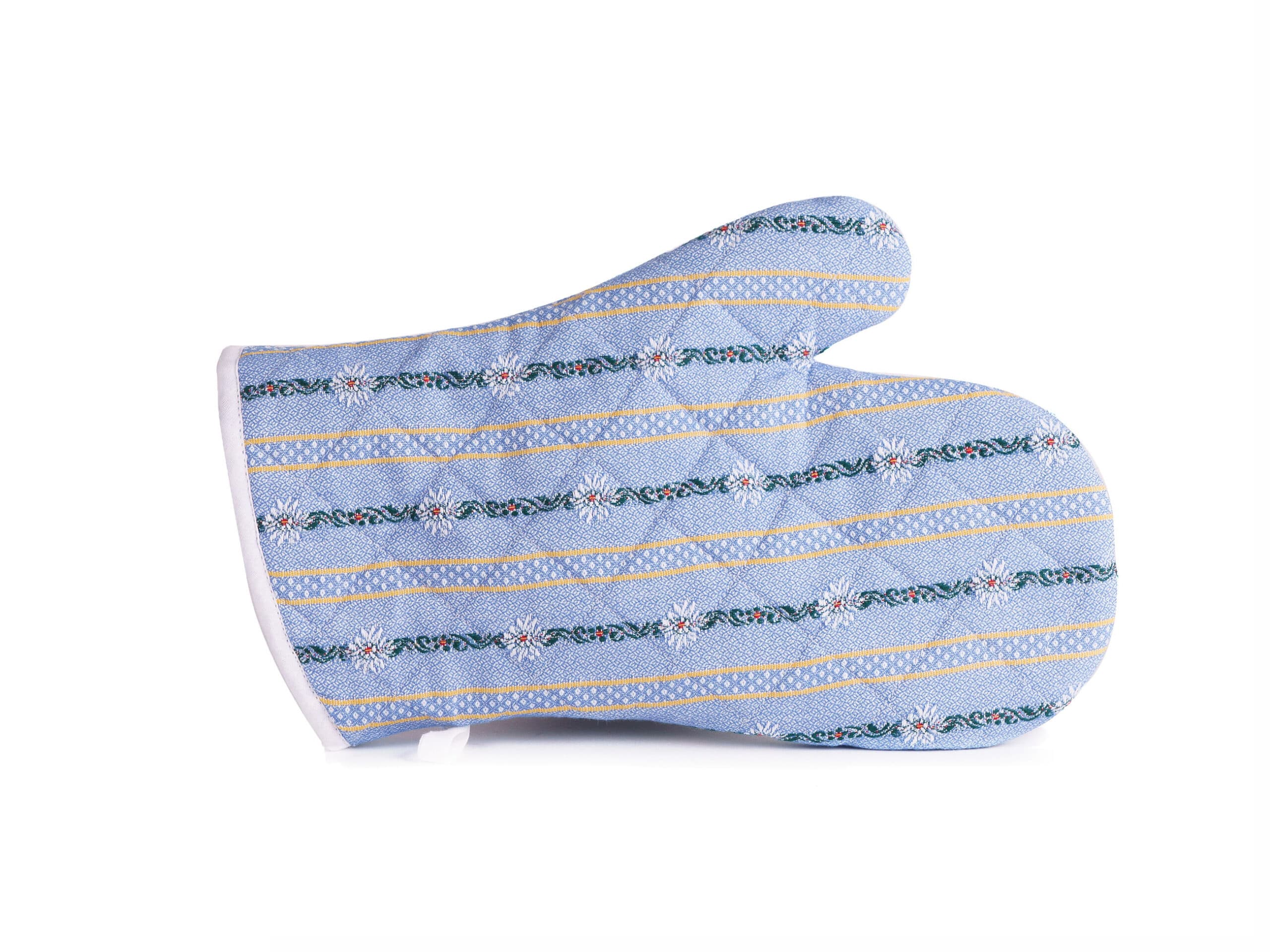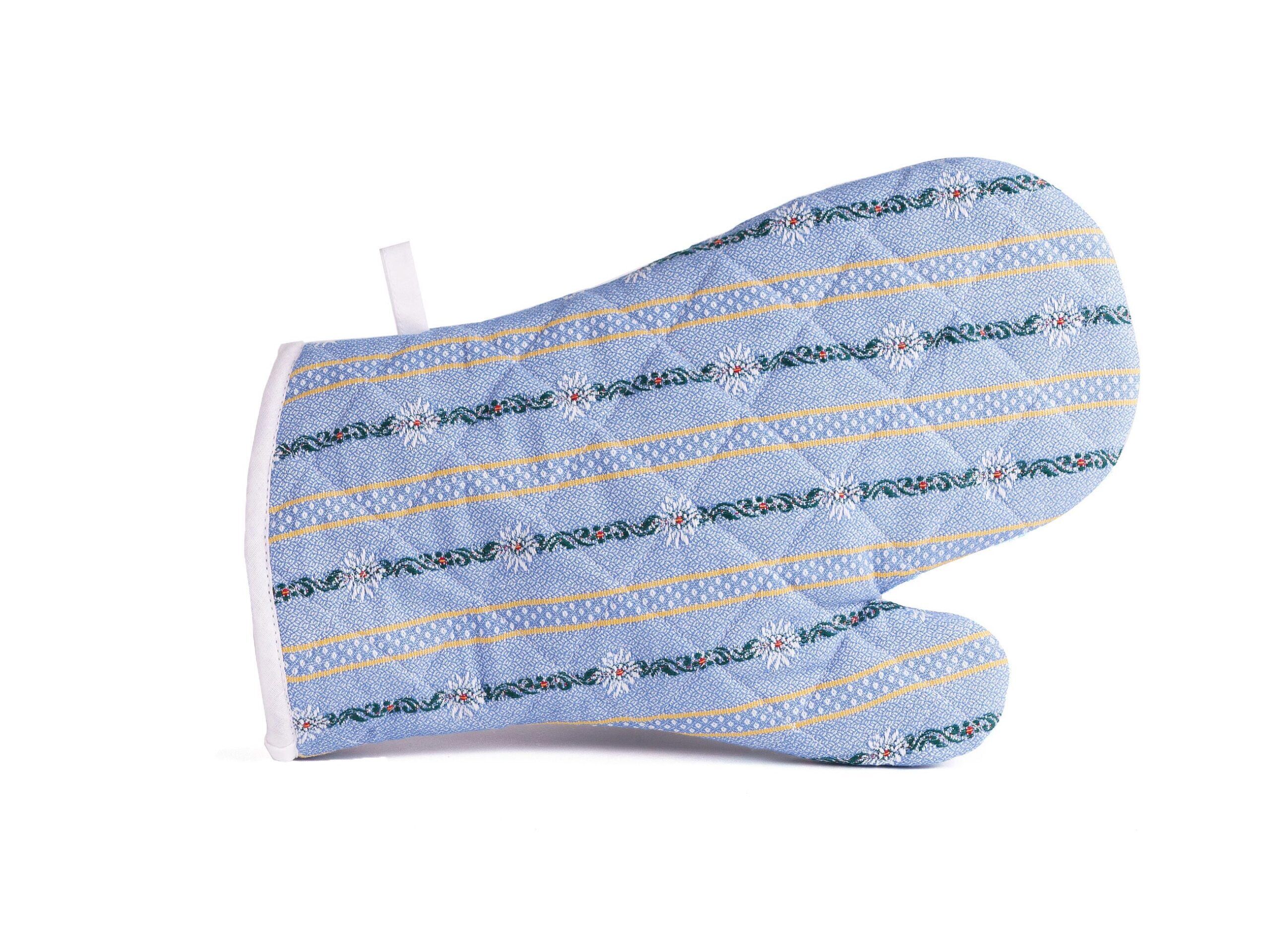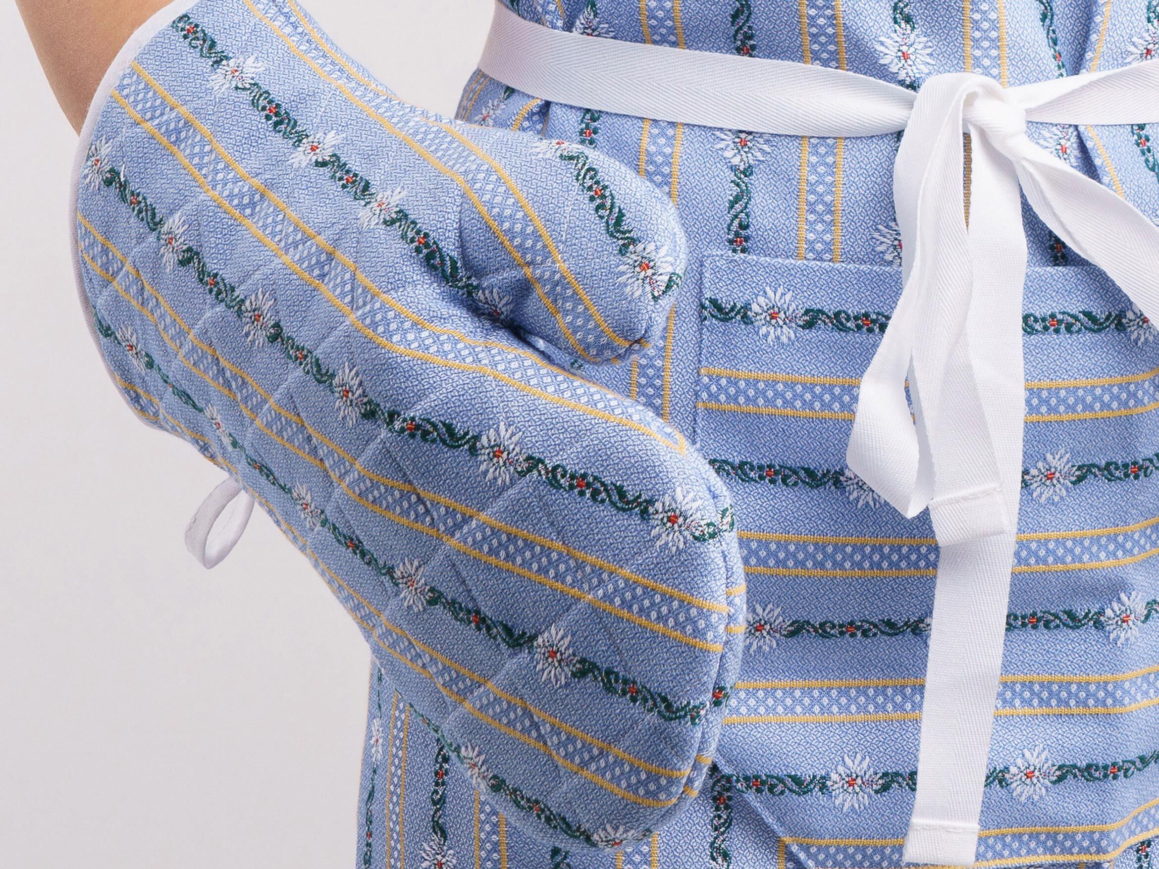 Schweizer Ofenhandschuh Edelweiss Original für Heimatgefühl in der Küche. Gefärbt, gewebt und genäht in der Schweiz (swiss label).