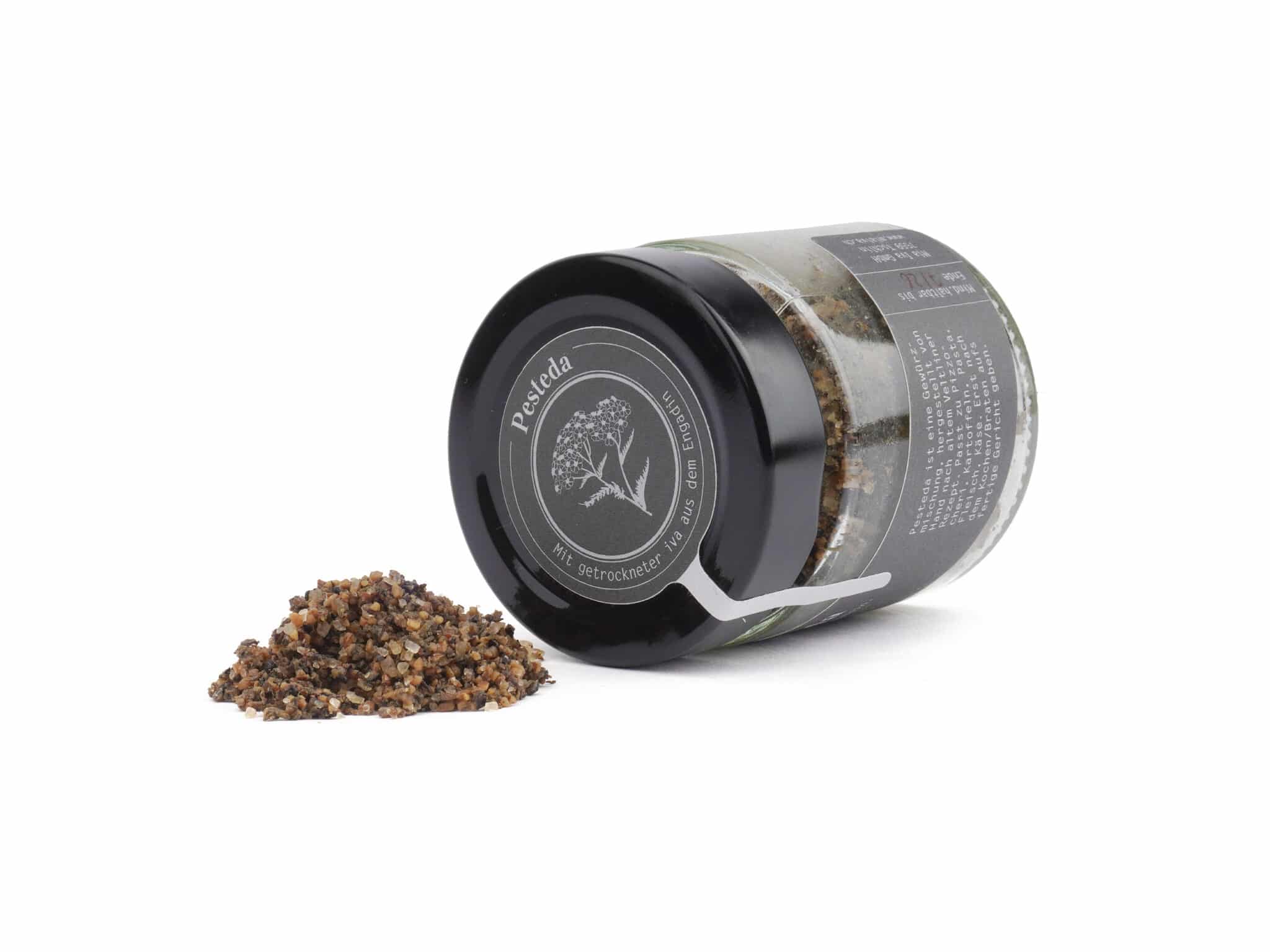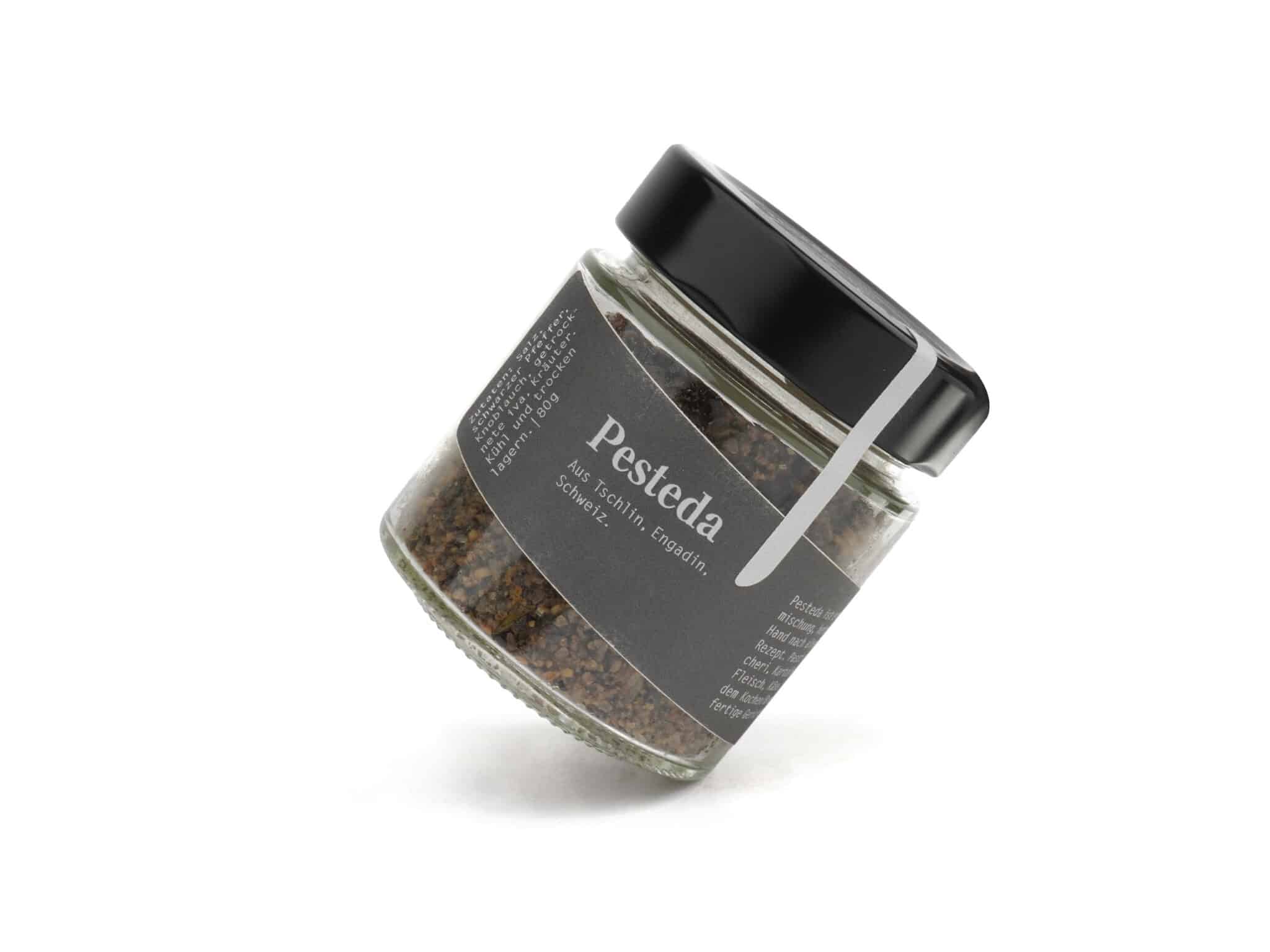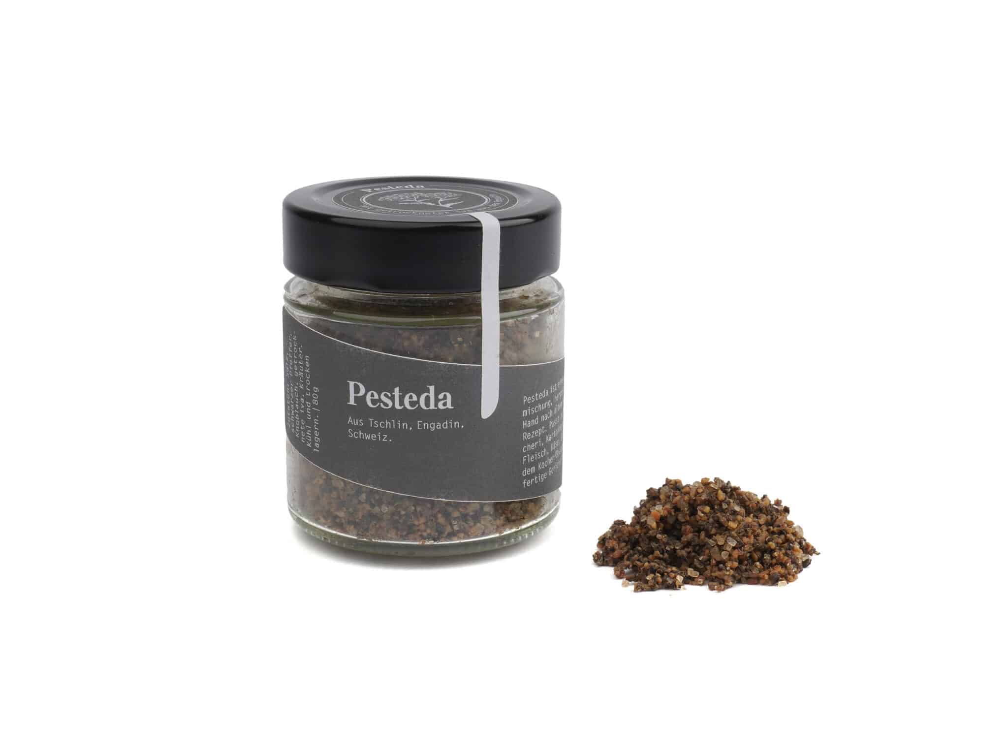 Pesteda ist eine Gewürzmischung, welche vor allem aus dem Puschlav und dem Veltlin bekannt ist. Sie besteht aus Salz, Pfeffer, Knoblauch, getrockneter iva (Engadin) und Kräutern. Hergestellt von Hand nach altem Rezept in Tschlin.