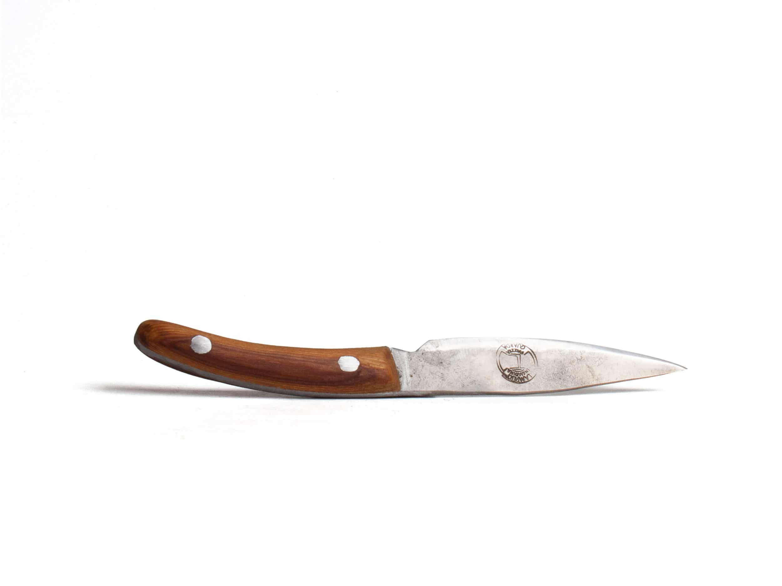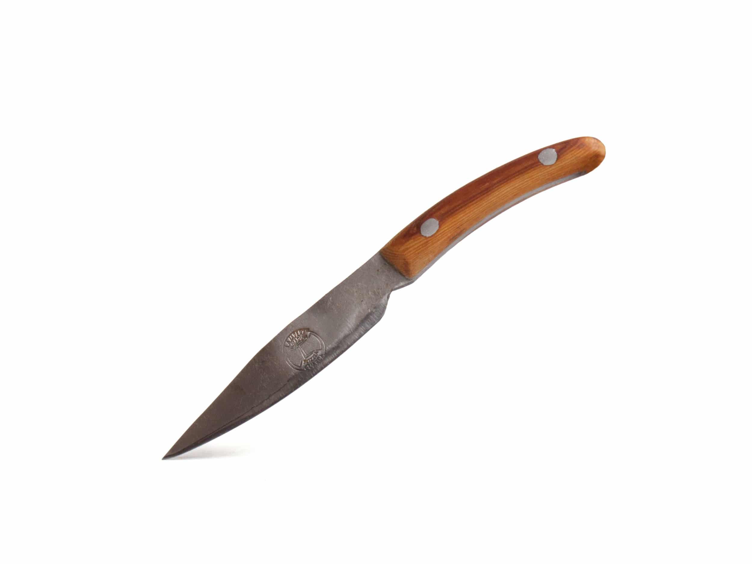 Das schöne und sehr scharfe Rüstmesser mit Holzgriff aus altem Lärchenholz für Deine Küche. Das Messer wird in Guarda von Thomas Lampert handgeschmiedet, gebürstet und geschliffen.