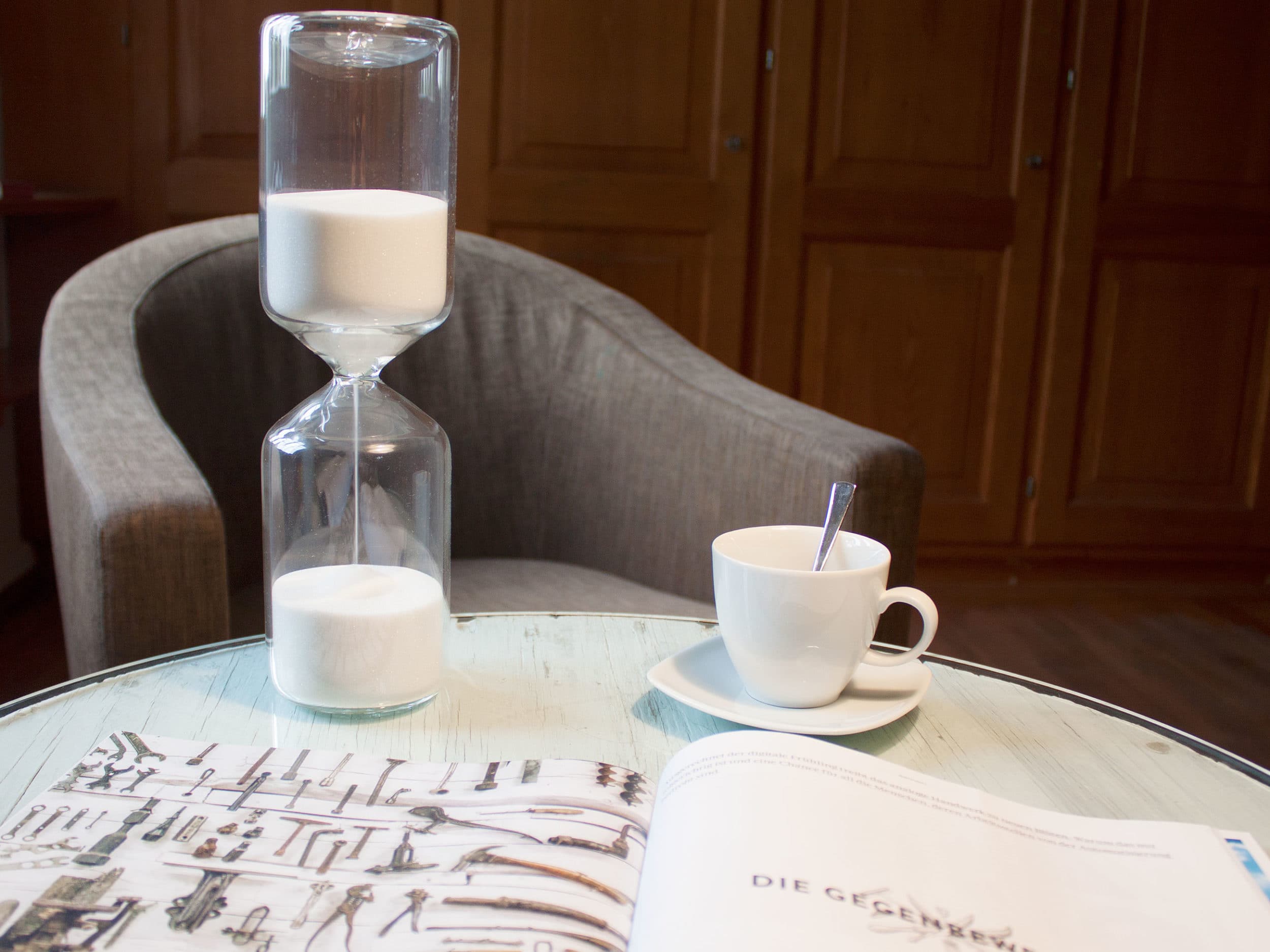 Die handgemachte, starkwandige Schweizer Sanduhr (Gewicht 1.3kg) mit einer Rinndauer von 30 Minuten ist ein Qualitätsprodukt. Mit Glasperlen gefüllt.
