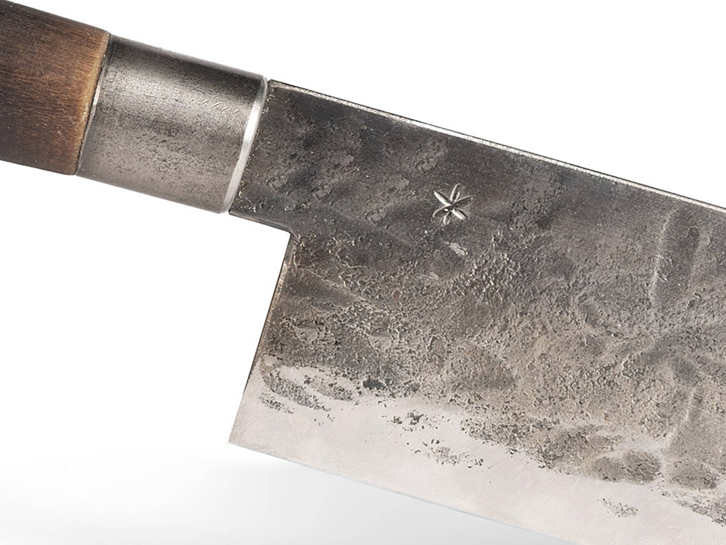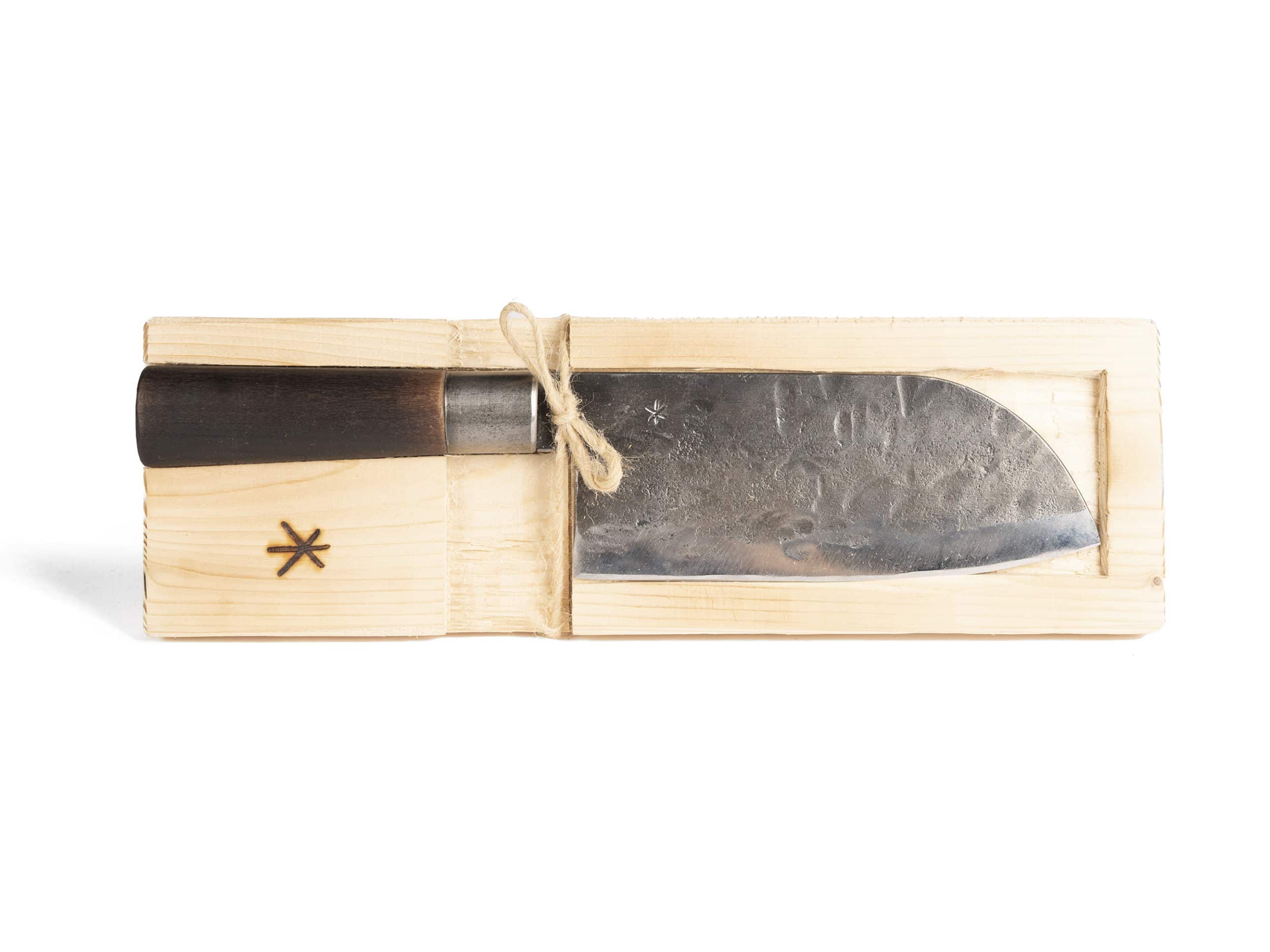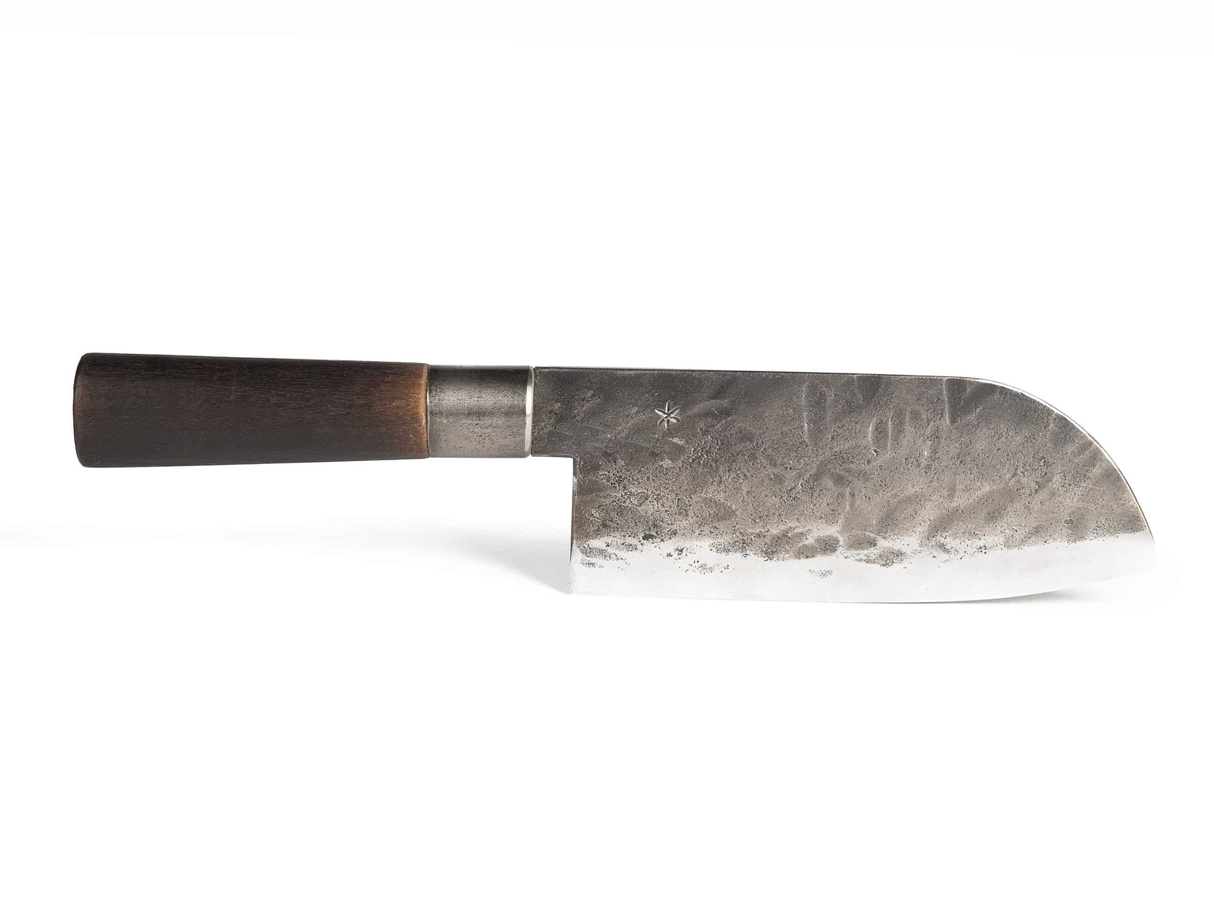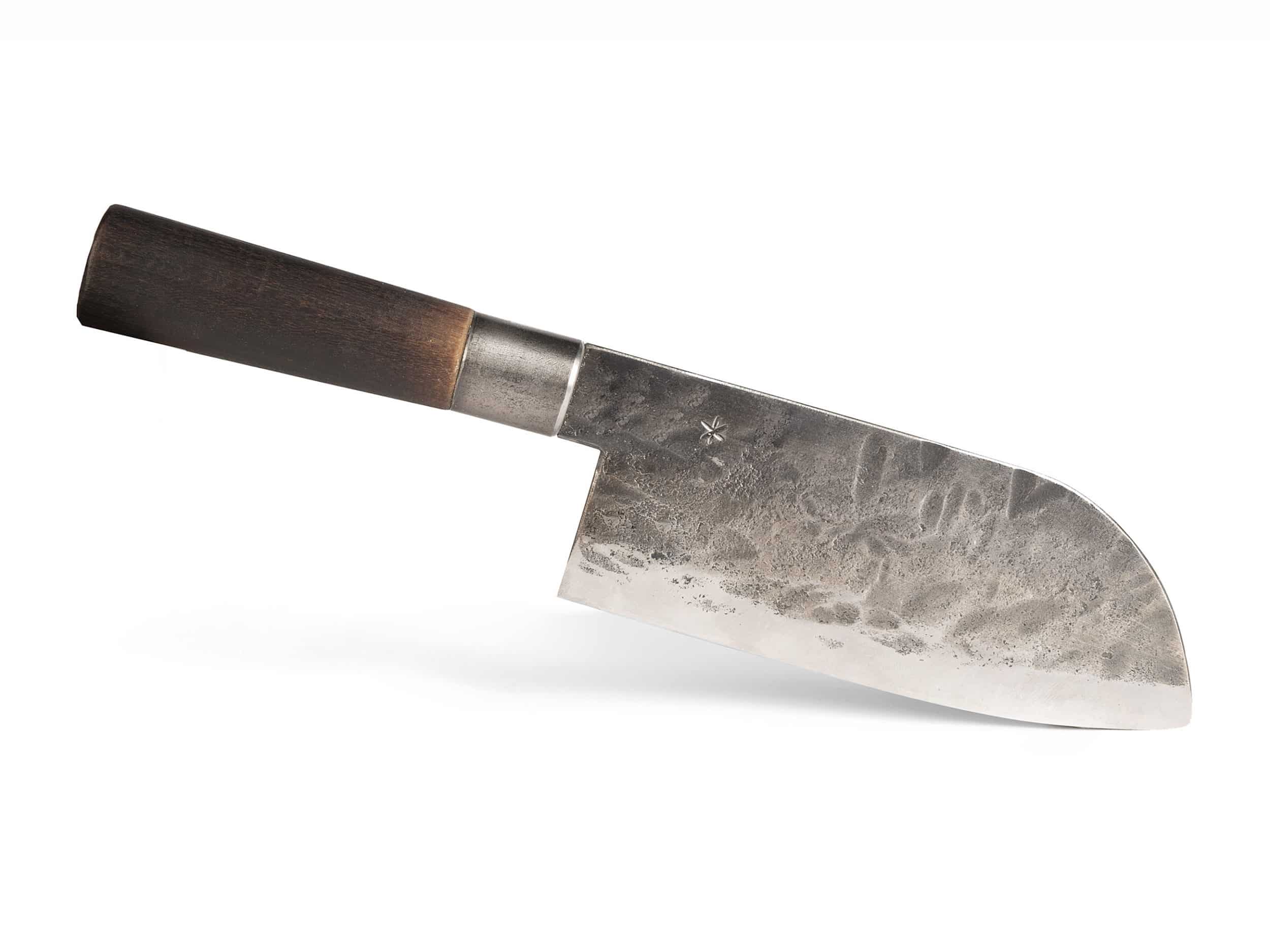 Das wunderschöne, handgeschmiedete Allzweck-Küchenmesser mit der traditionellen Santoku-Form (ursprünglich eine japanische Klingenform) steckt voll Charakter und Geschichte.