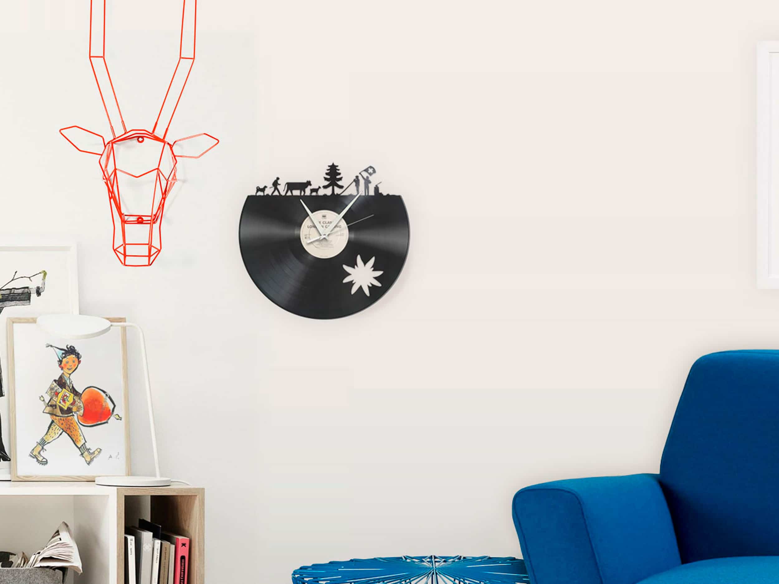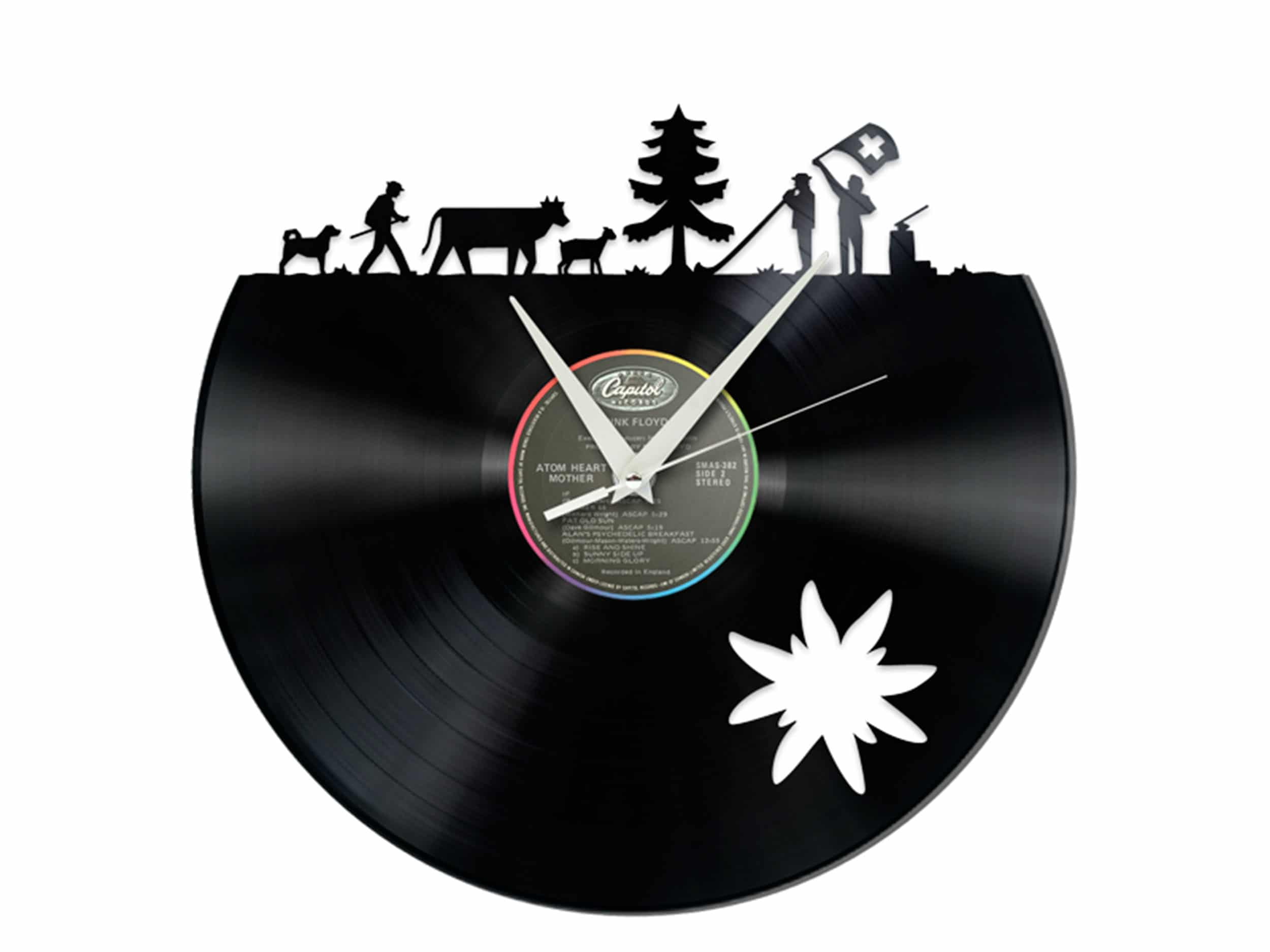 Schallplattenuhr Alpaufzug – Die einzigartige Wanduhr aus alten Schallplatten (Vinyl) wird in der Schweiz designt und hergestellt.