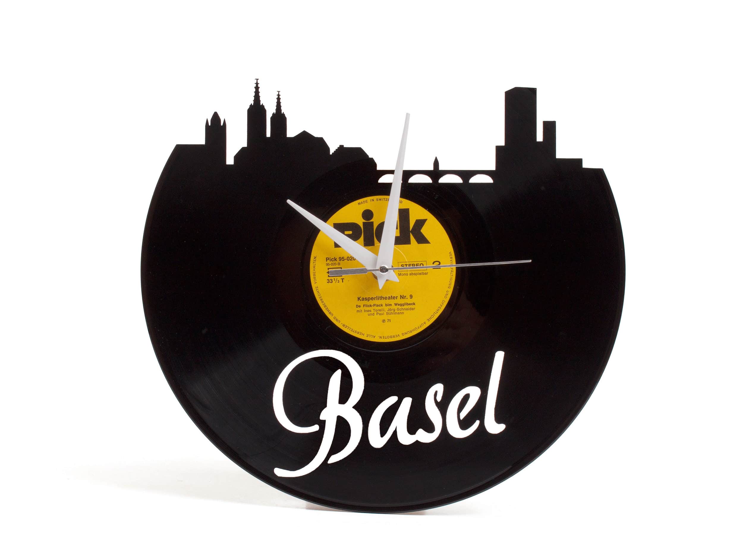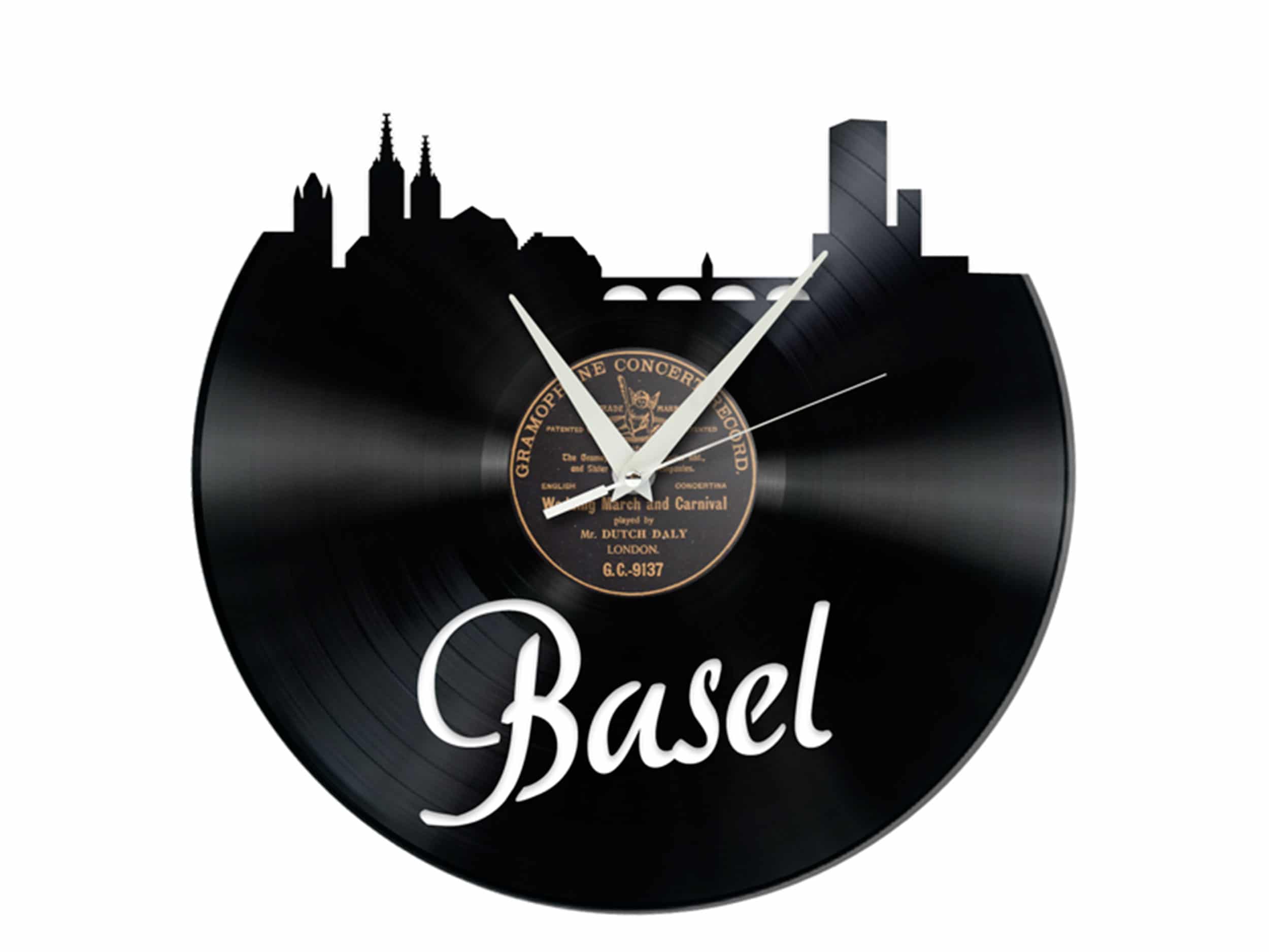 Schallplattenuhr Basel – Z Basel am mym Ryy, jo dert mecht y syy!» Eine Uhr mit der unverkennbaren Silhouette von Basel? Ein Muss für jeden Bebbi und Basel-Liebhaber! Mit der Basel-Schallplattenuhr hat man einen herrlichen Ausblick auf den Basler Marktplatz mit Rathaus, das Münster und die Mittlere Brücke. Wer genau hinschaut, kann über dem Rhein auch noch den Messeturm sehen.