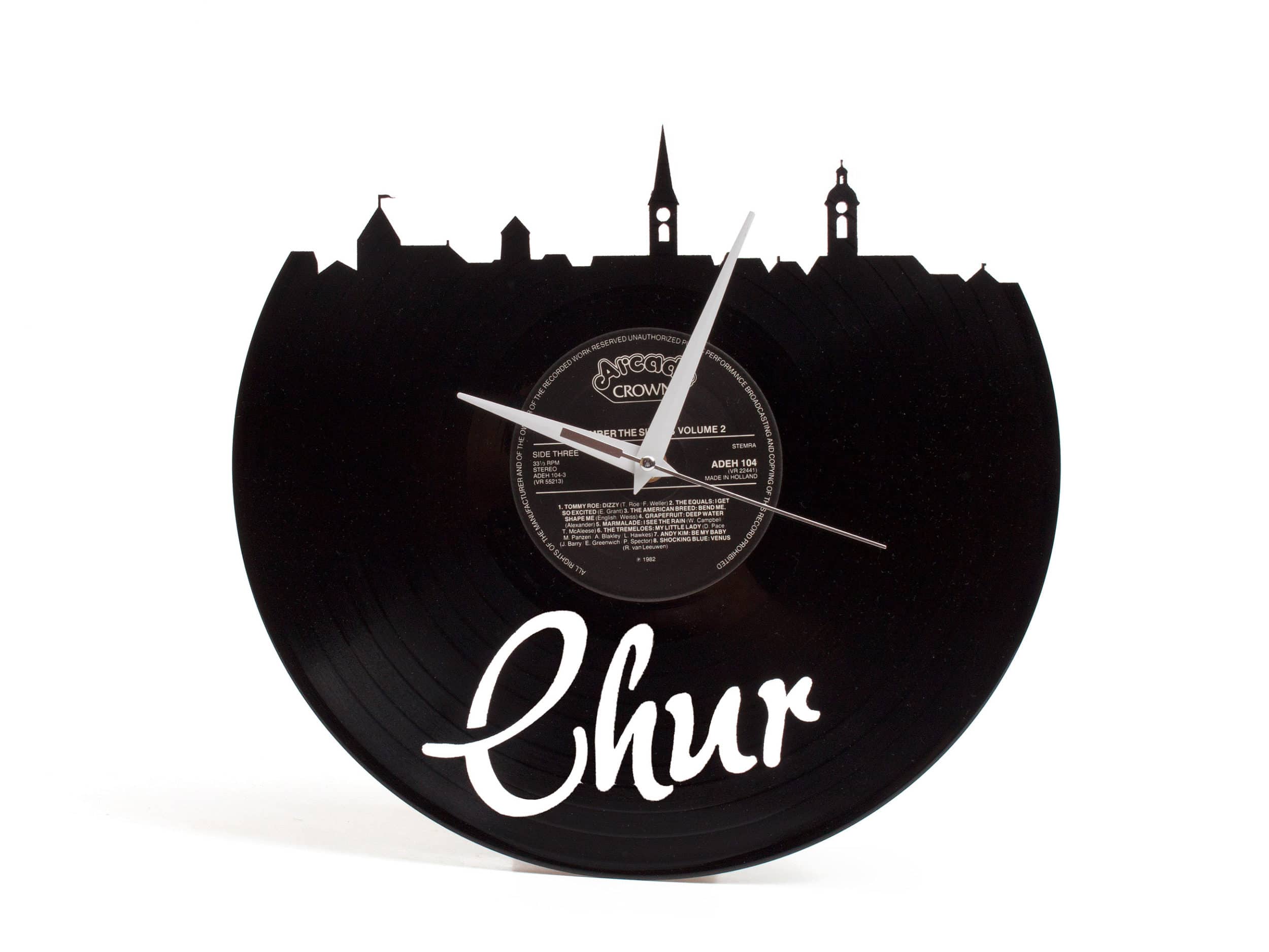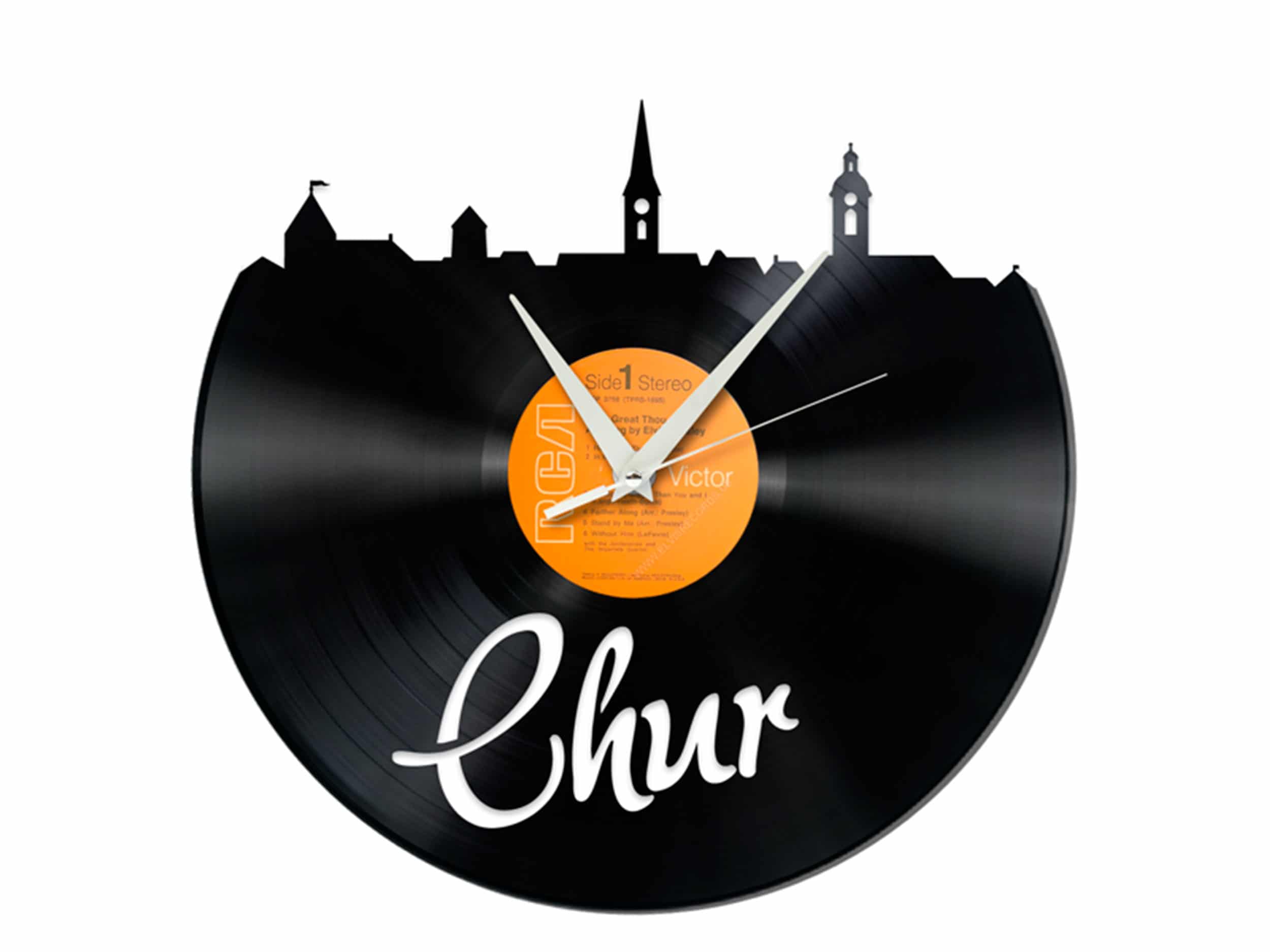 Schallplattenuhr Chur – «An echta Khurer!» Die älteste Stadt der Schweiz gibt es natürlich ebenfalls als Schallplattenuhr. Die charakteristischen Türme von City West und des Rheinquarties findet man auf der Uhr nicht. Die Aussicht auf die historische Altstadt macht das aber wieder wett. Mit dem Obertor, dem Malteserturm, dem Churer Hof und dem hochaufragenden Martinskirche ist die Uhr ein hübscher Blick.