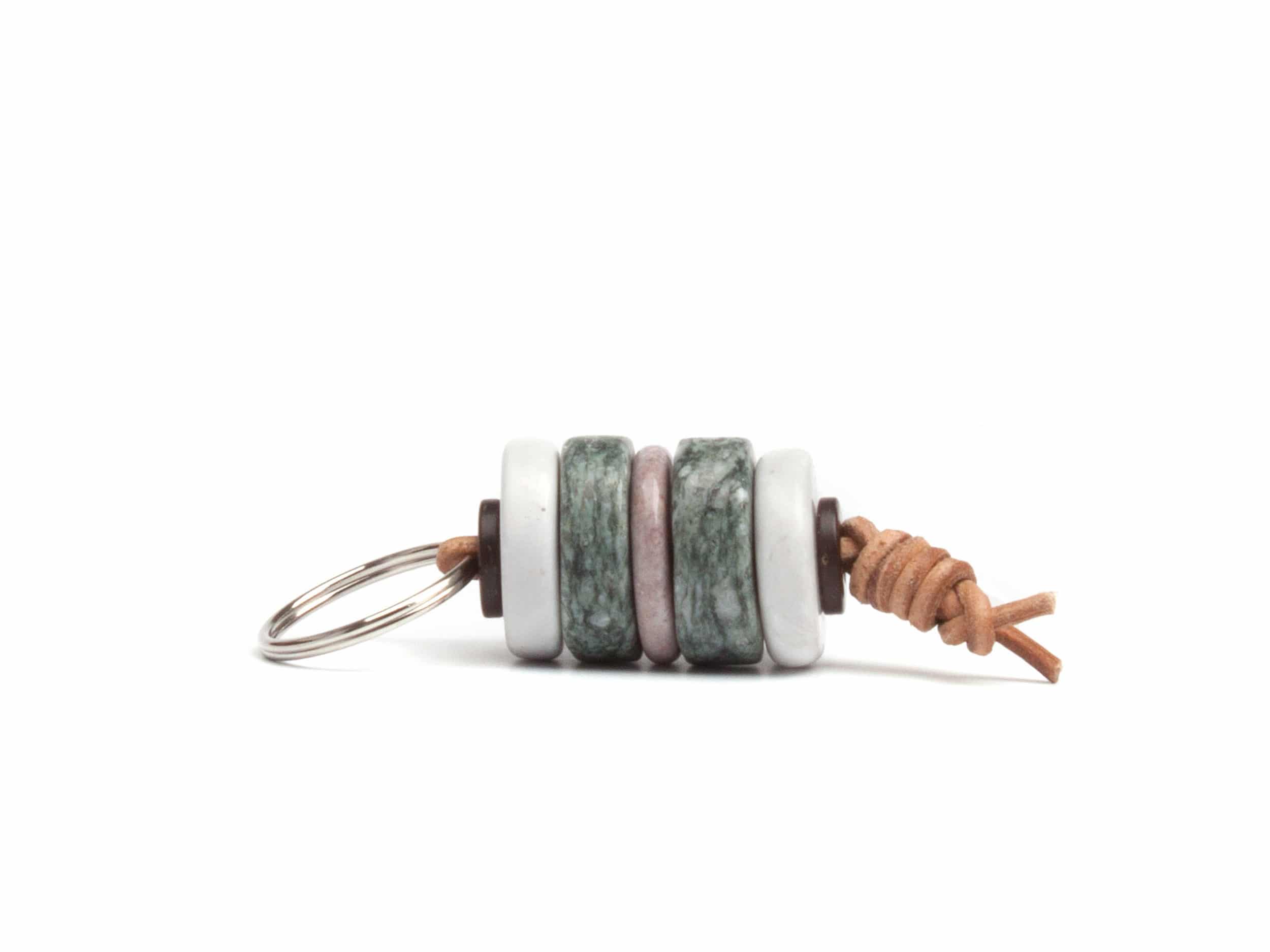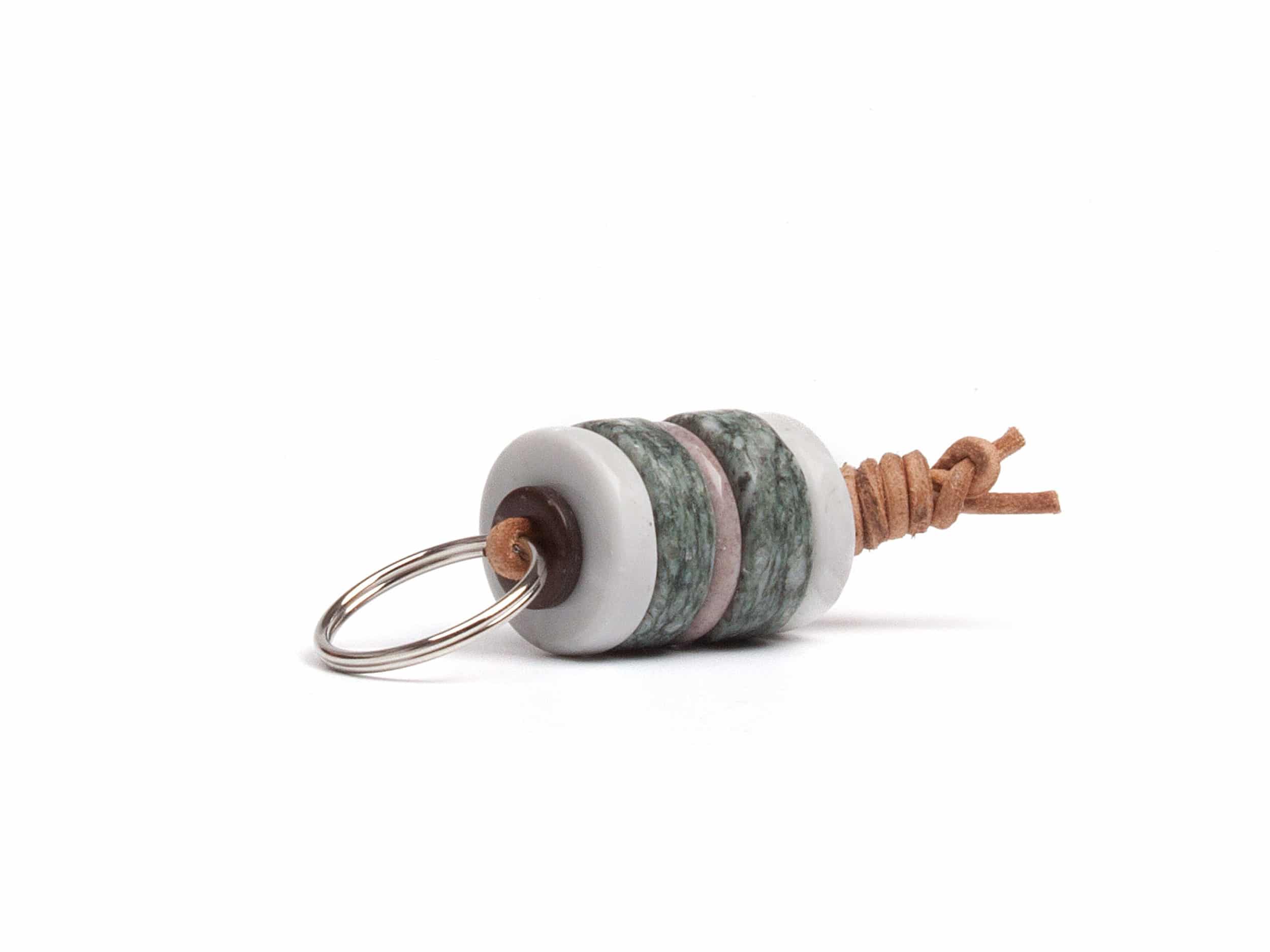 Jeder handgemachte Schlüsselanhänger besteht aus fünf Büdner Steinscheiben. Schlicht aber wirkungsvoll!