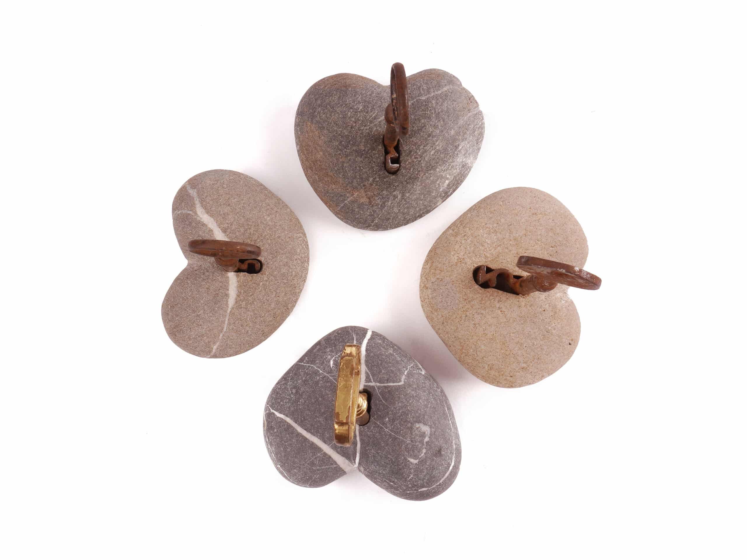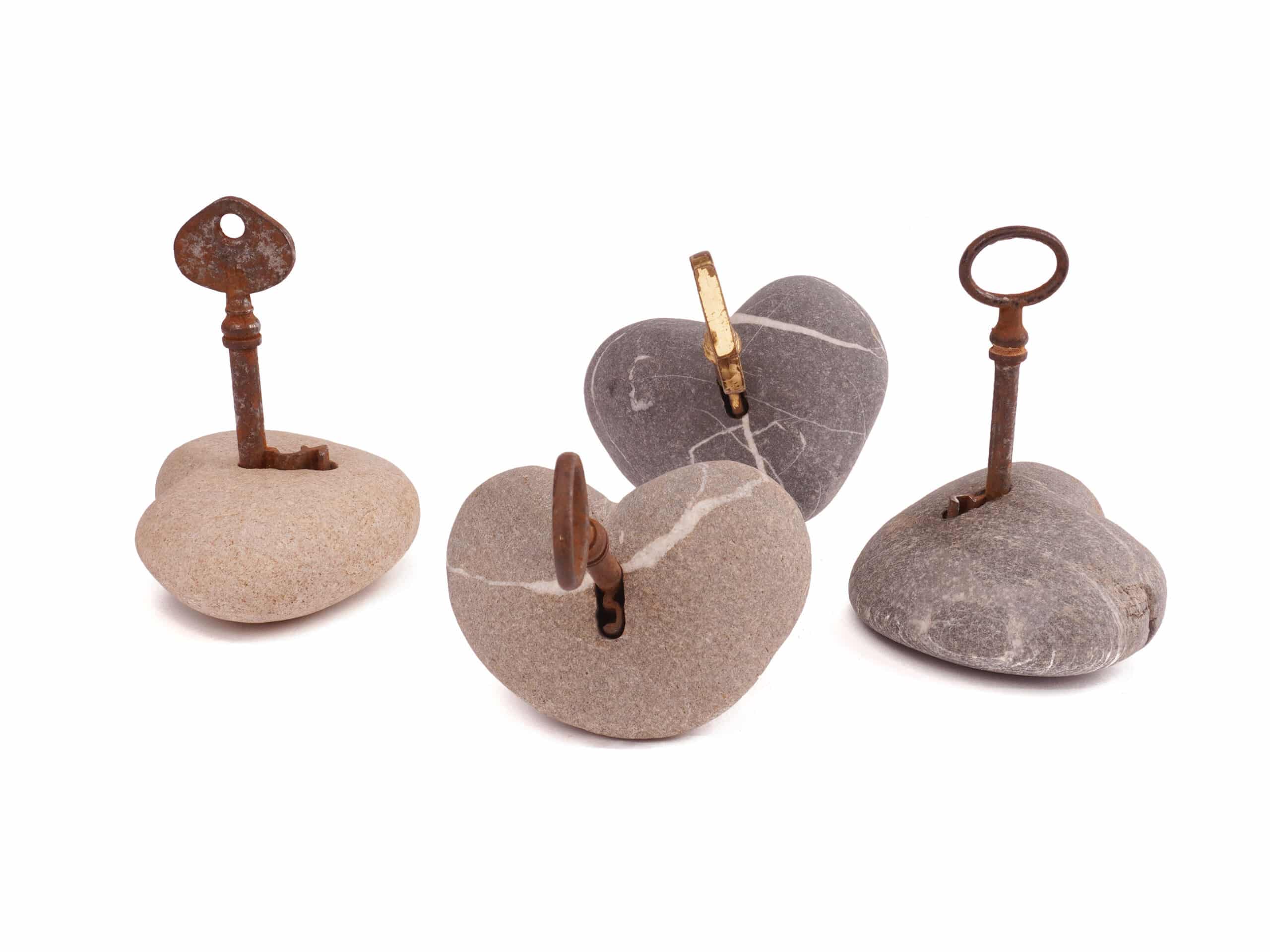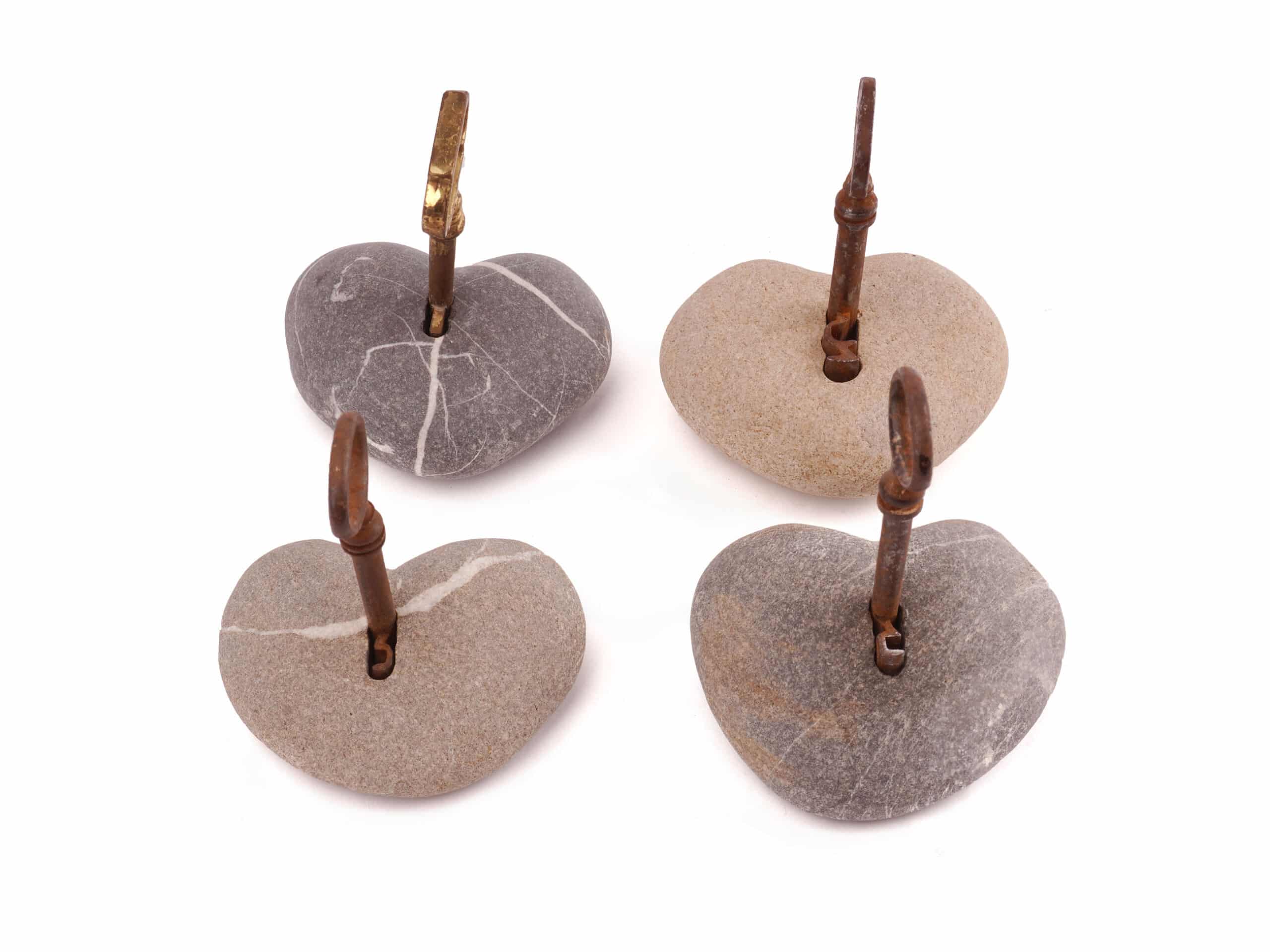 Schlüsselherz Stein. Die niedlichen Steinherzen aus Schweizer Flüssen (Markus findet diese auf seinen Erkundungstouren in der Emme und Maggia) werden gebohrt und mit alten Schlüsseln versehen.