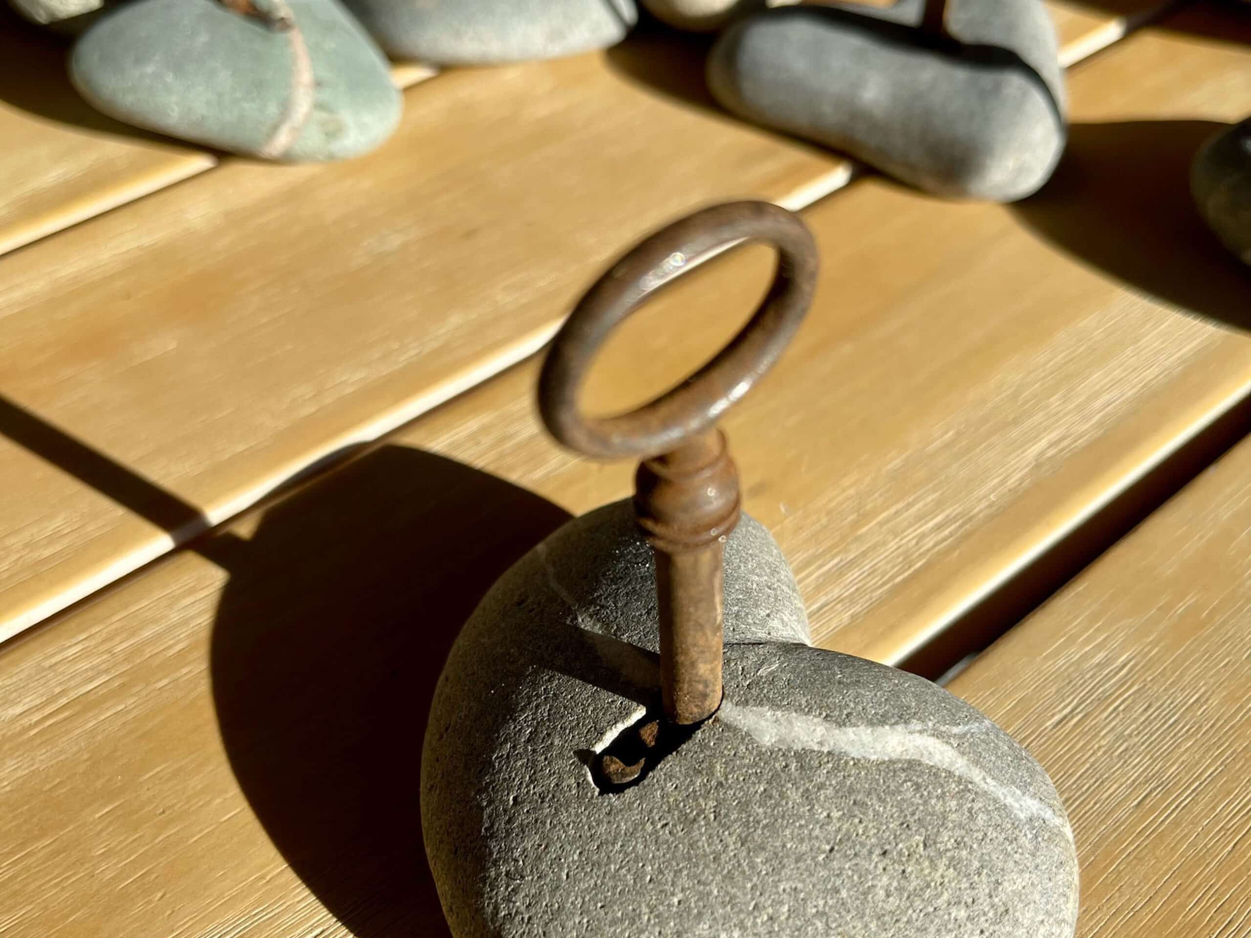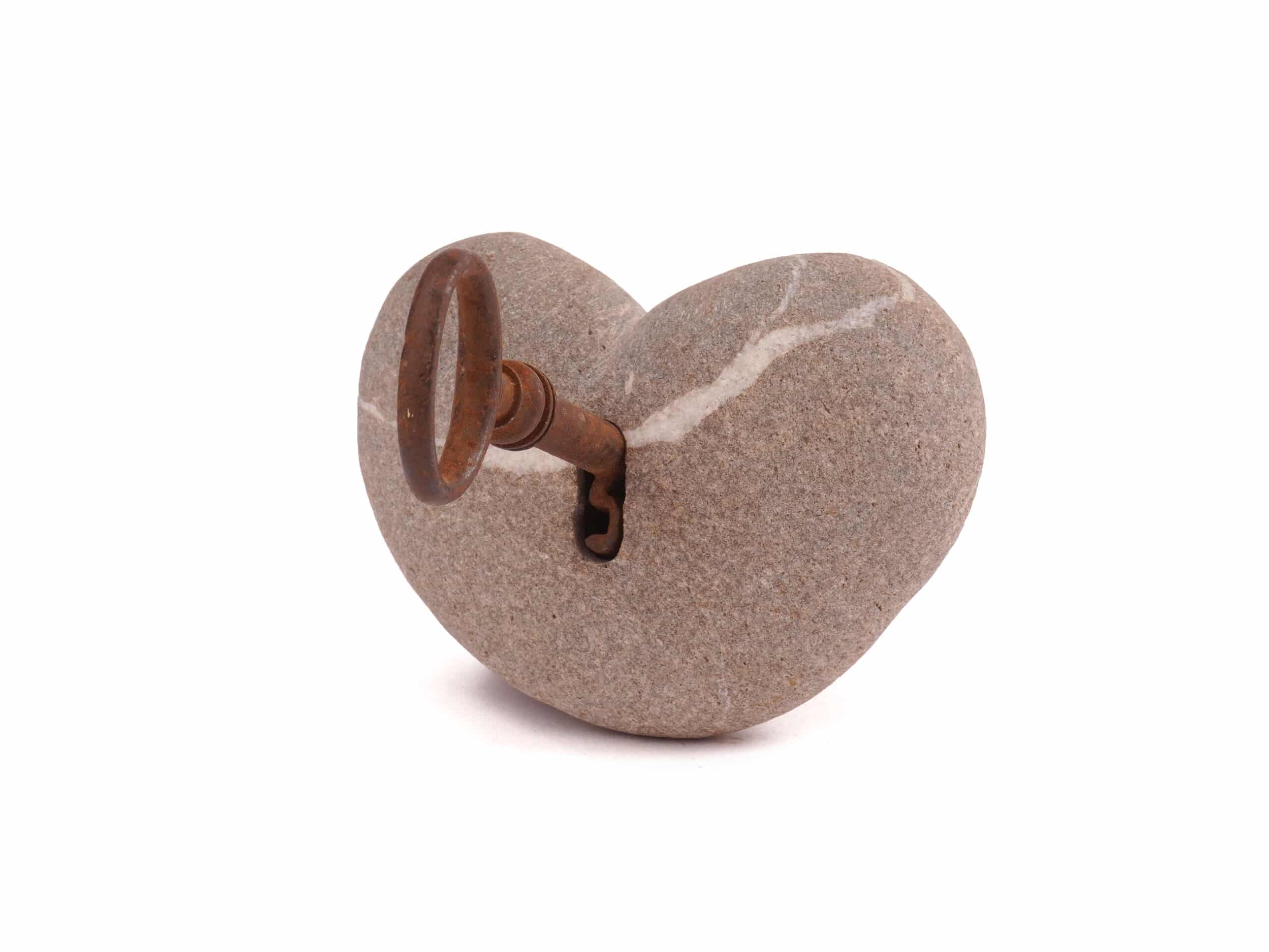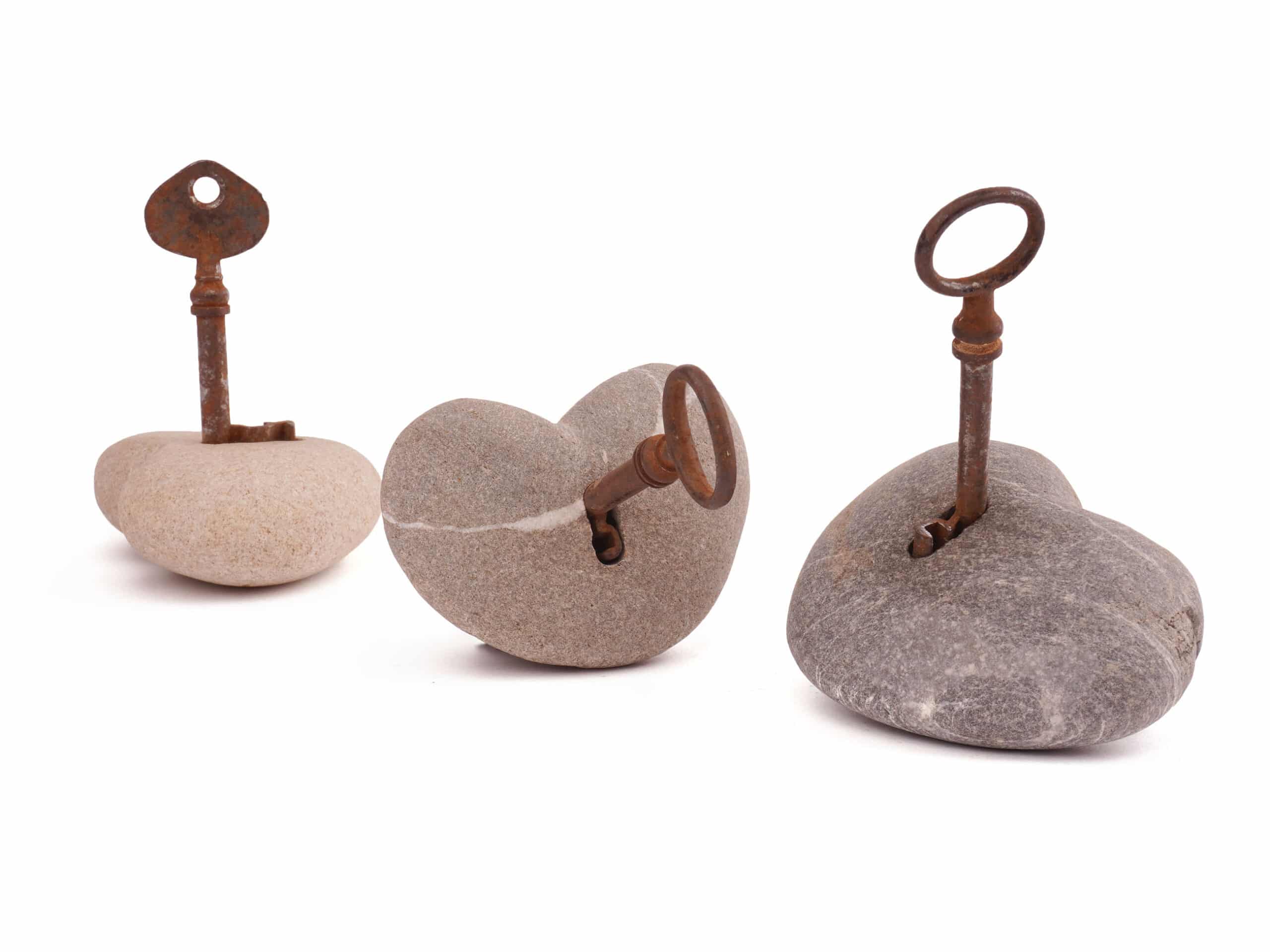 Schlüsselherz Stein. Ein schönes, schlichtes Dekorationsobjekt mit viel Symbolkraft, dass sich auch gut als Briefbeschwerer eignet. Oder um (mit Magnet oder Wäscheklammer) Papier-Nachrichten daran zu klippen.