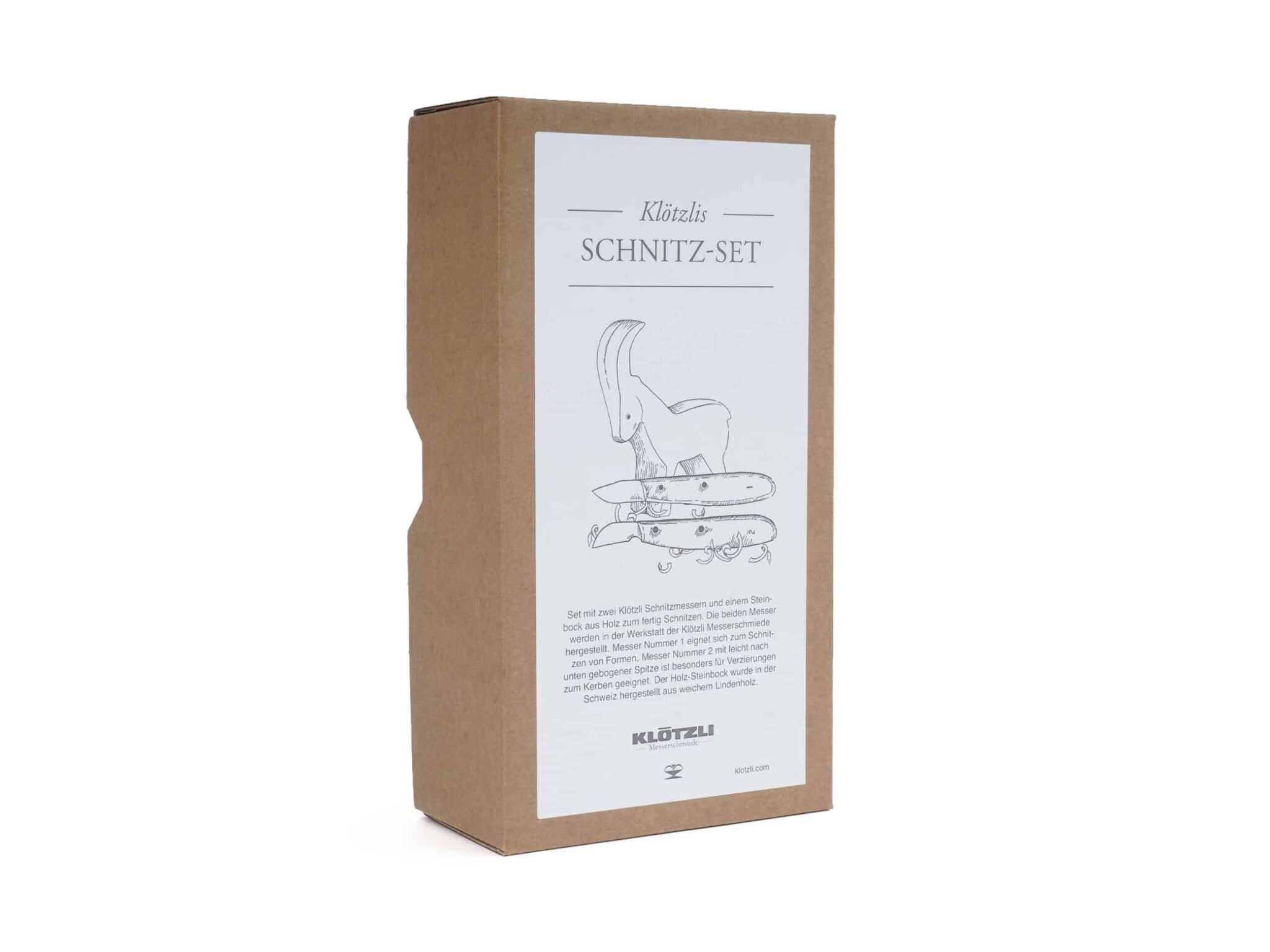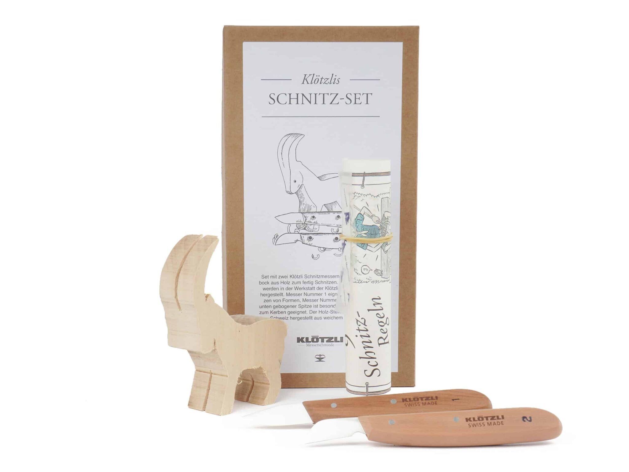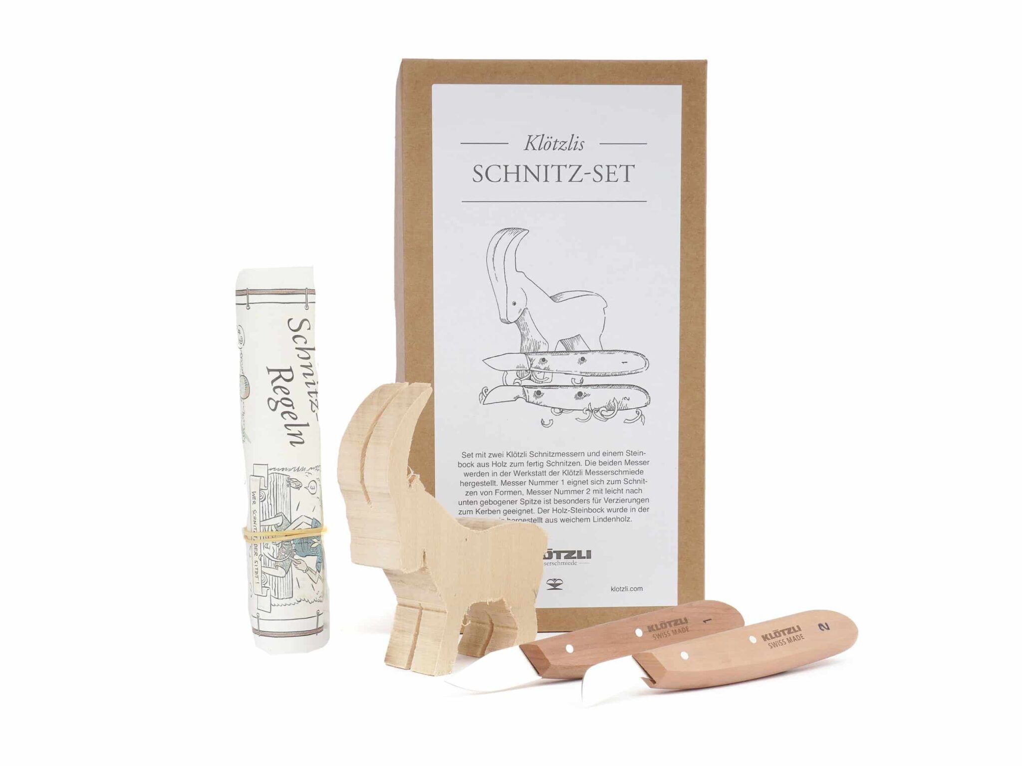 Schnitze Dir Deinen eigenen Steinbock. Mit dem Schnitzset von Klötzli hast Du alles, was Du dafür benötigst. Zwei original Klötzli Schnitz-Messer, ein Steinbock Rohling aus Schweizer Lindenholz, Schnitzregeln und ein Pflästerli.