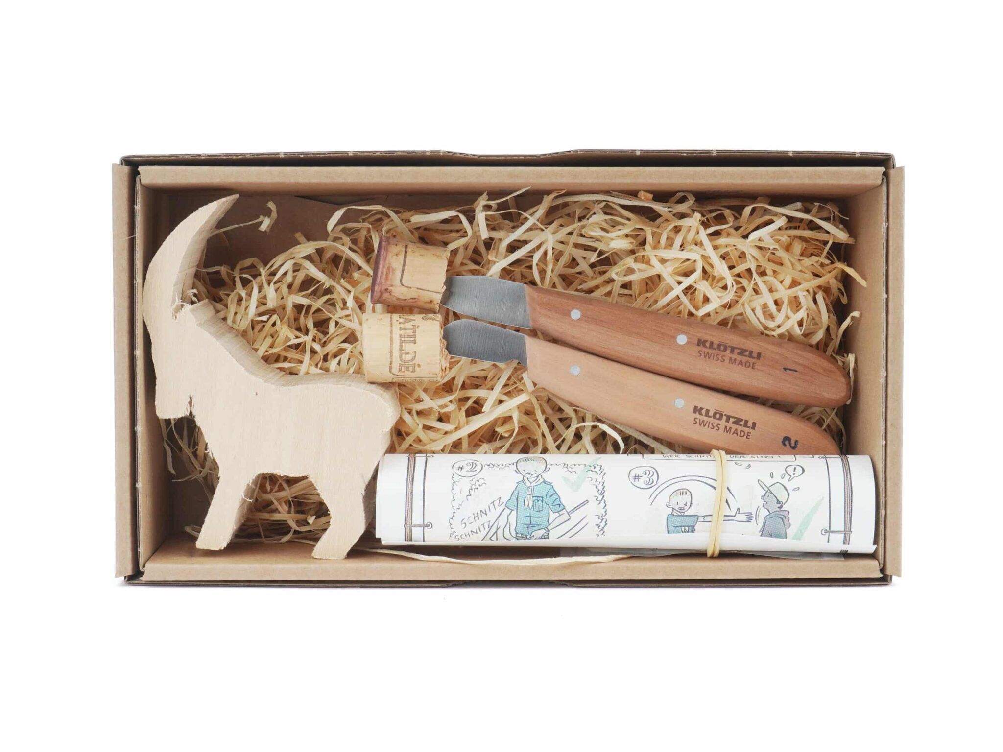 Schnitze Dir Deinen eigenen Steinbock. Mit dem Holzschnitz-Set hast Du alles, was Du dafür benötigst. Eine schöne Schweizer Geschenkidee für die ersten Berührungen mit diesem entspannenden Handwerk.