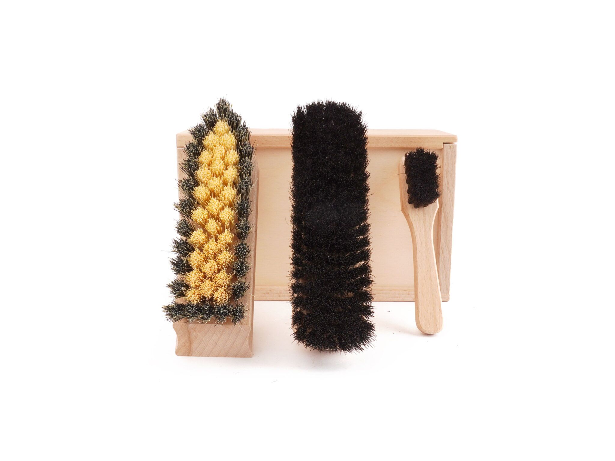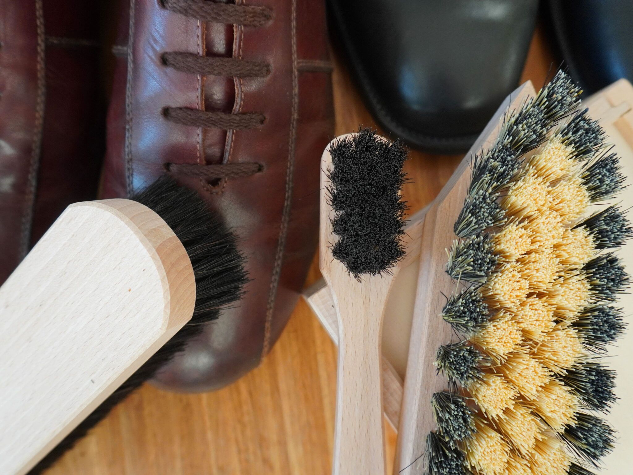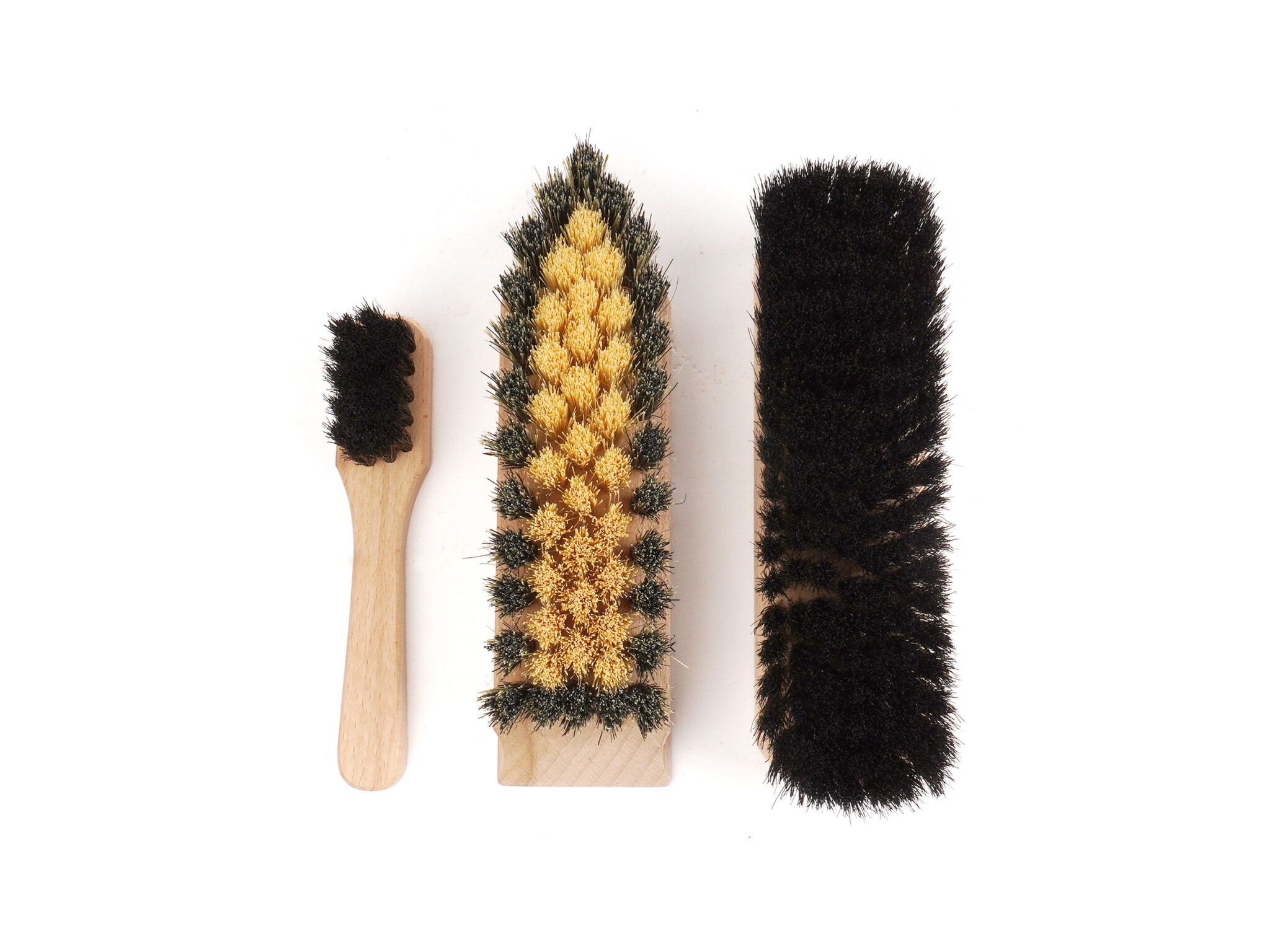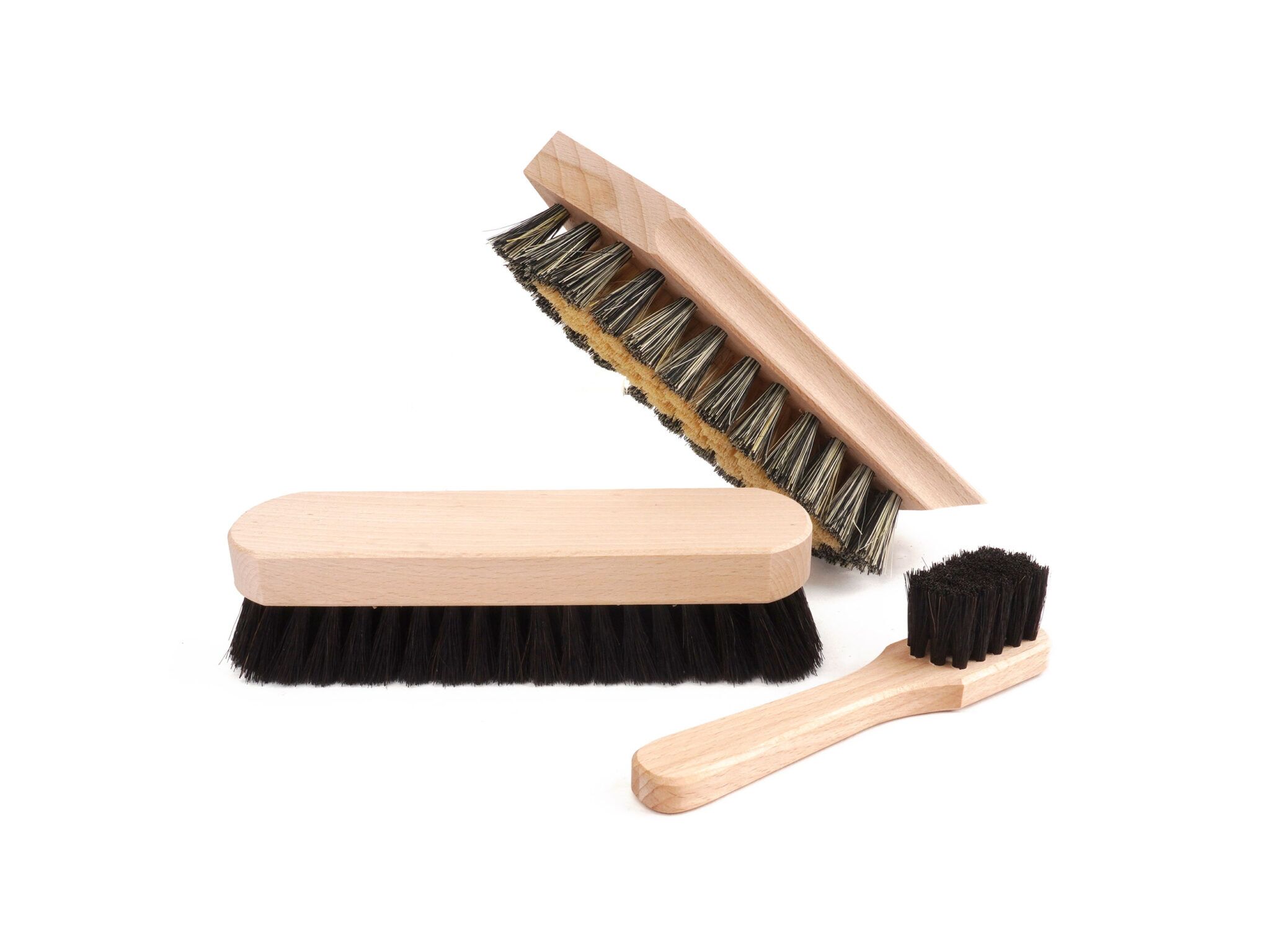 Einfache Handhabung: Eine Schuhputzbürste mit Kranz für den groben Schmutz, eine Schuhglanzbürste Rosshaar für den Glanz und eine Anstreichbürste Rosshaar für das Auftragen der Schuhcreme.