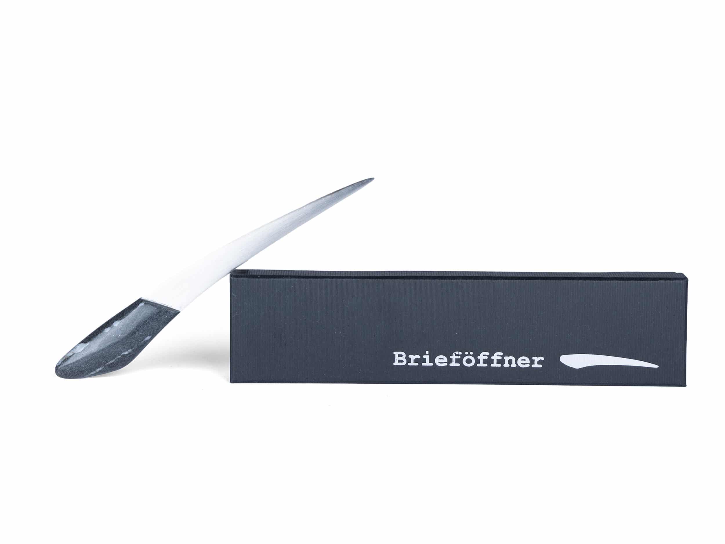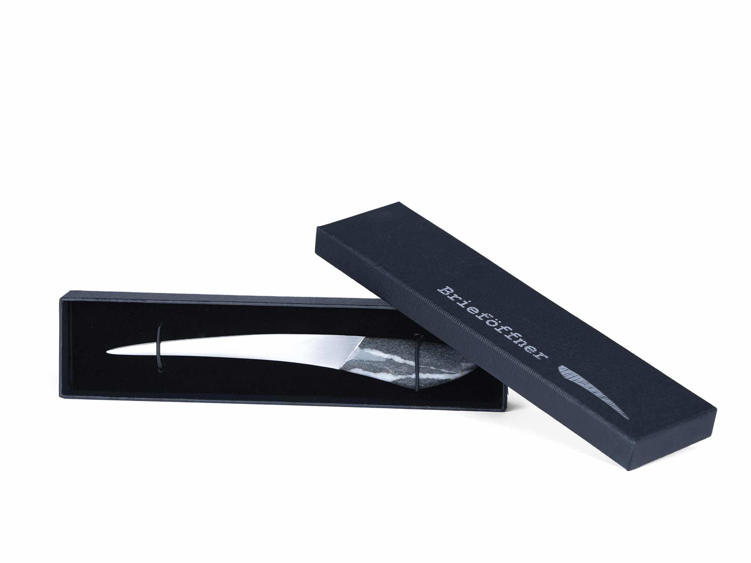 Dieser kunstvolle Brieföffner mit schönem Griff aus Domleschger Kieselschiefer hat eine formschöne, gebogene Chromstahl-Klinge und kommt in einer ästhetischen Kartonschachtel daher. Ein praktisches und langlebiges Geschenk, das unter fairen Bedingungen in Graubünden hergestellt wurde.