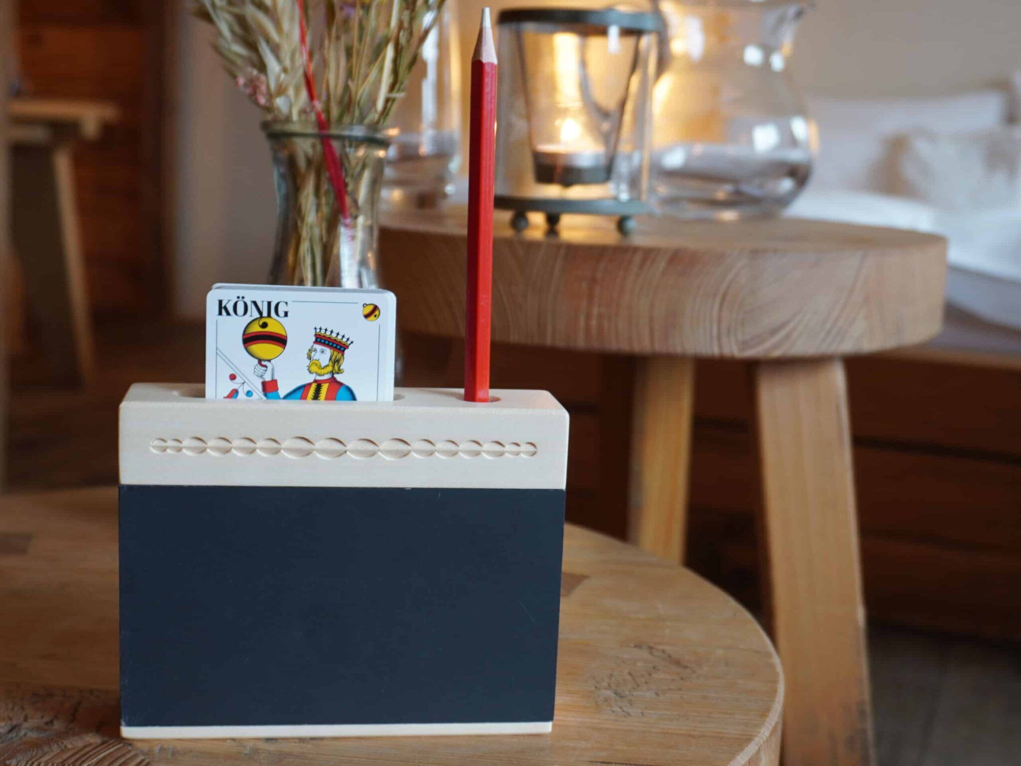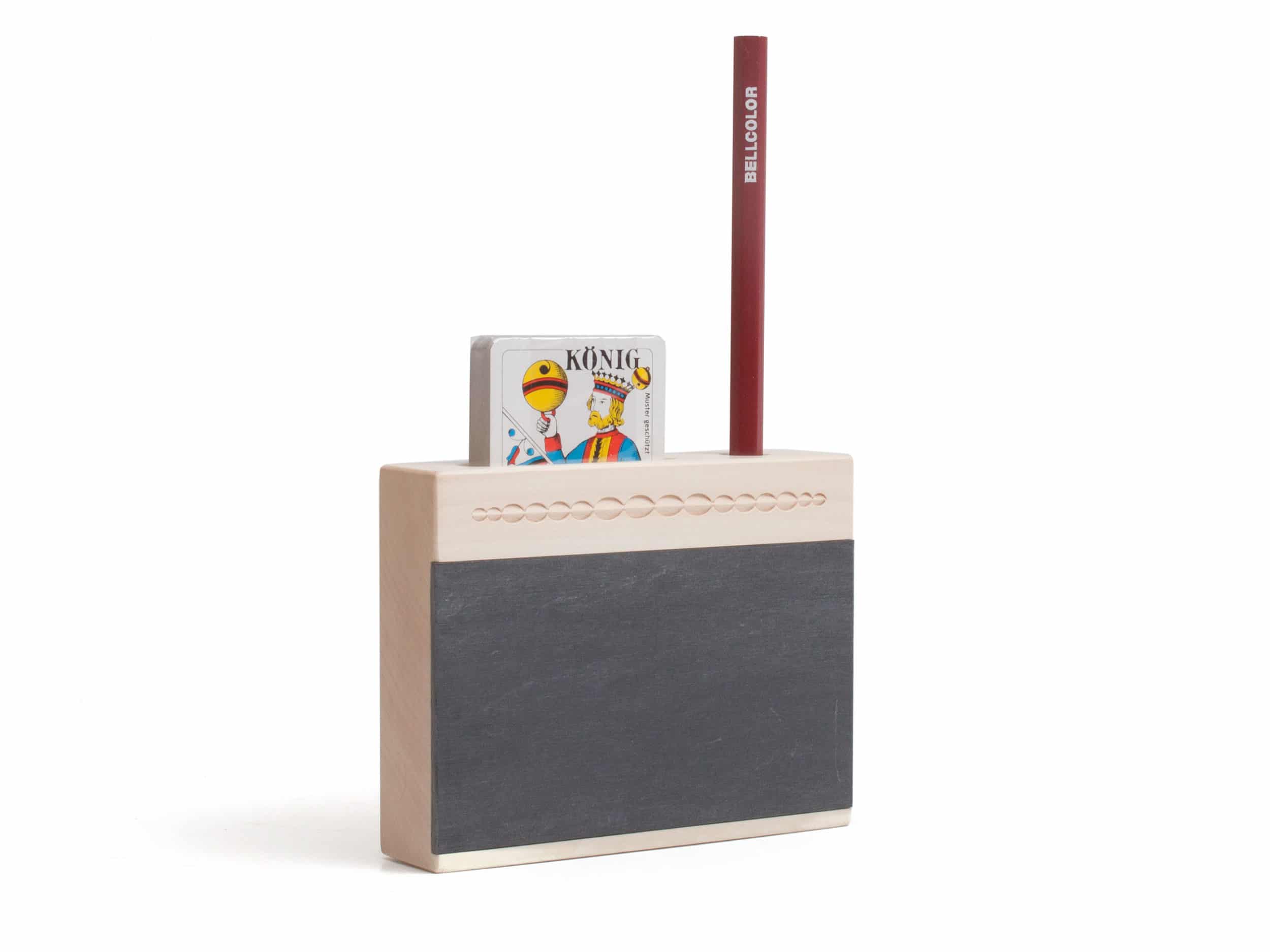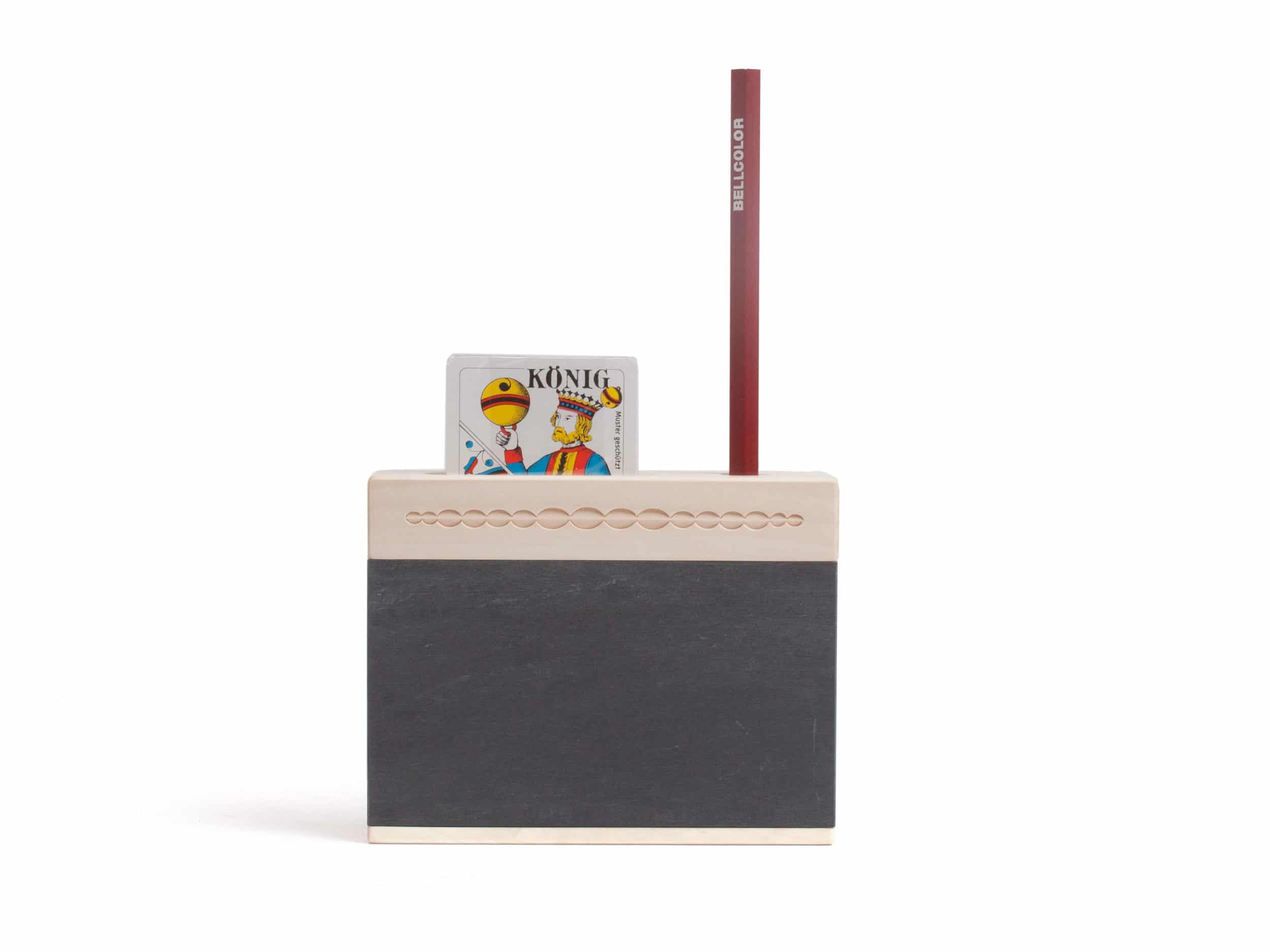 Das kompakte Set mit einer ins Holz eingelegten Schiefertafel, einem Griffel und einem Jass-Set ist ein schönes Geschenk für alle Jass-Freunde.