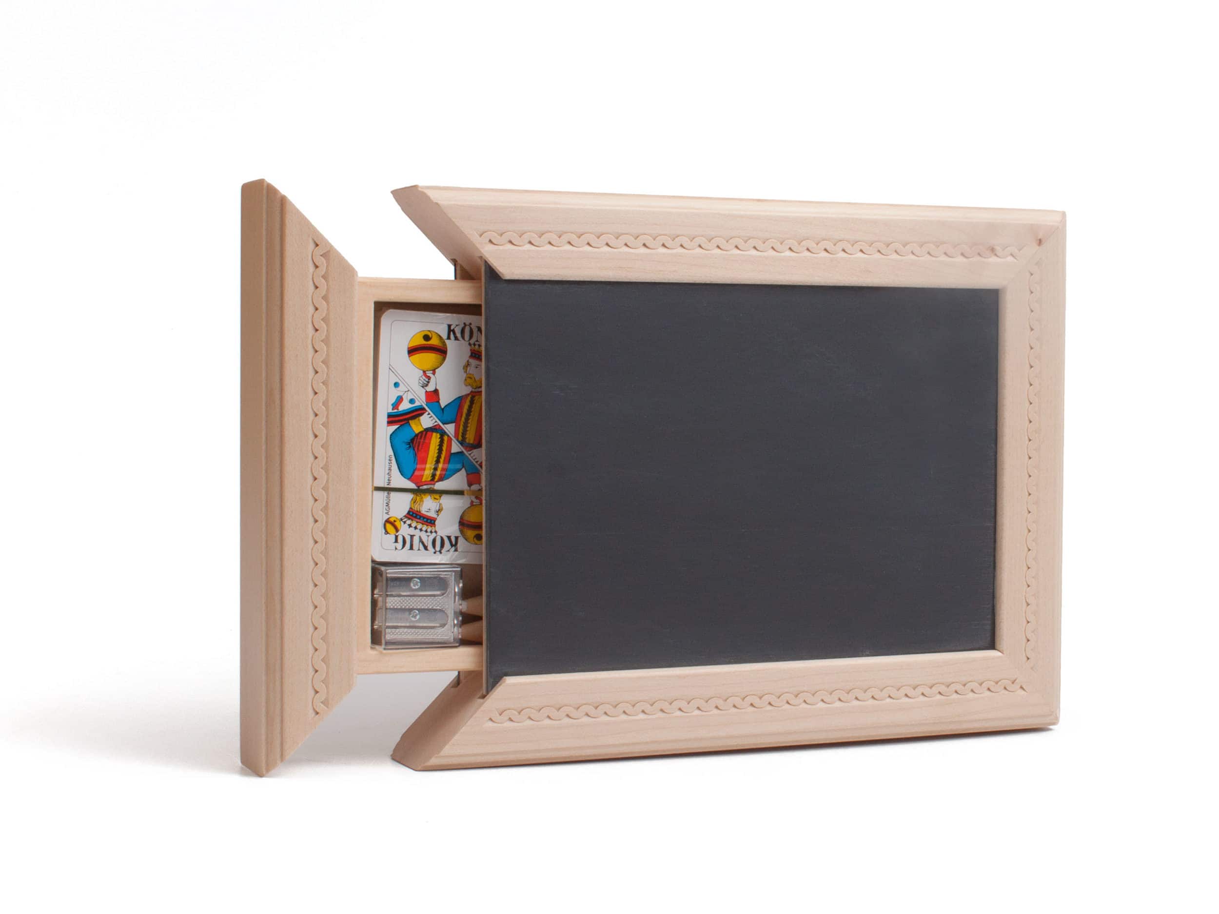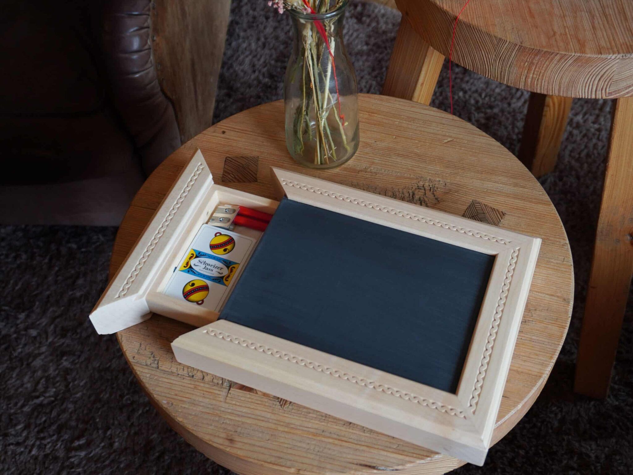 Das handliche und kompakte Jass-Set aus Bergahorn mit Schnitzerei (und beiseitiger Schiefertafel) wird von Hand gefertigt.