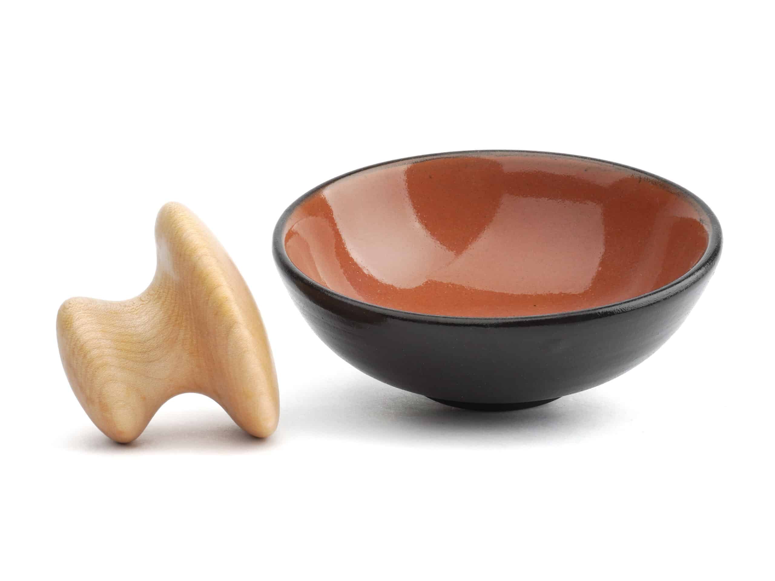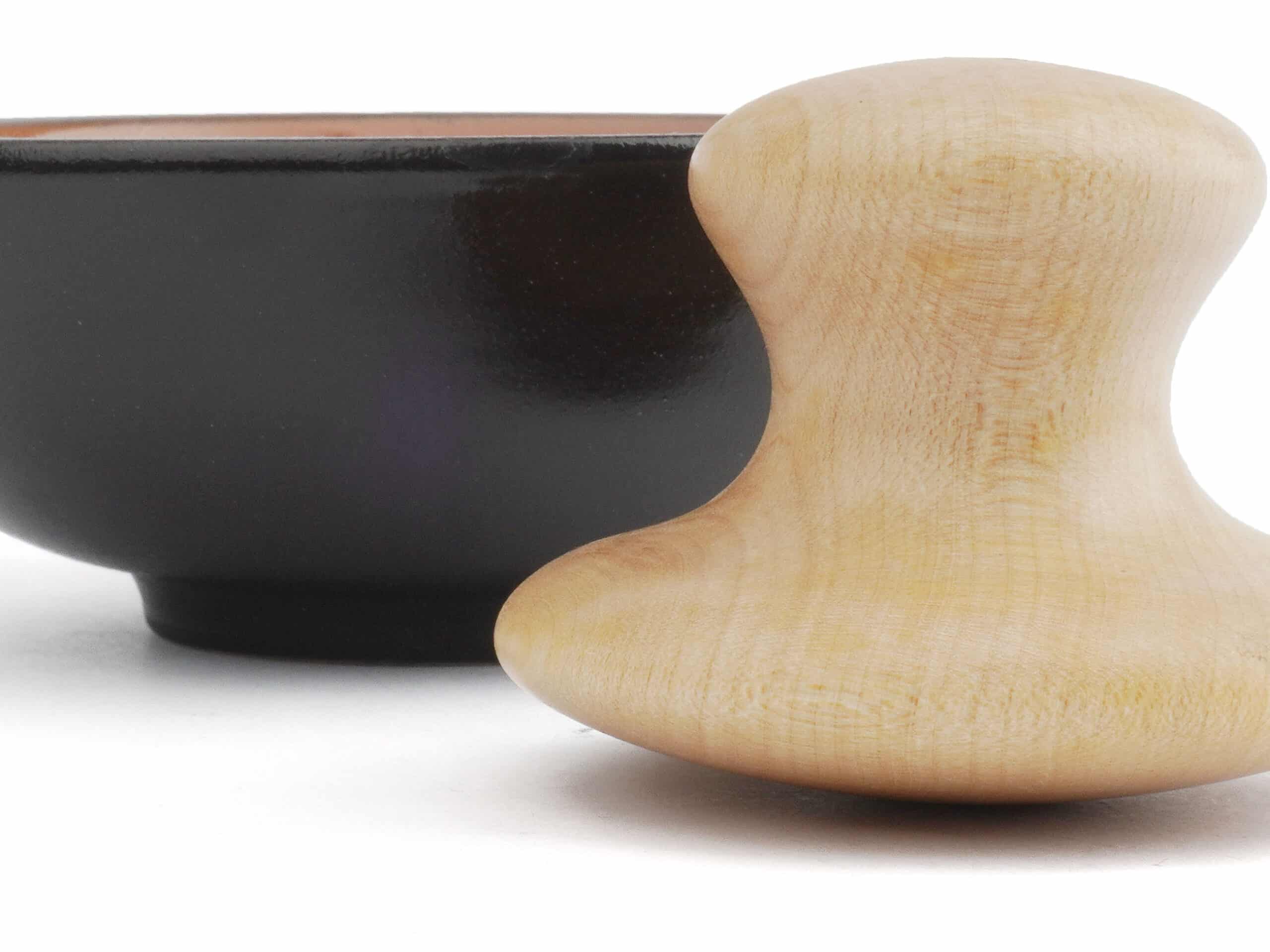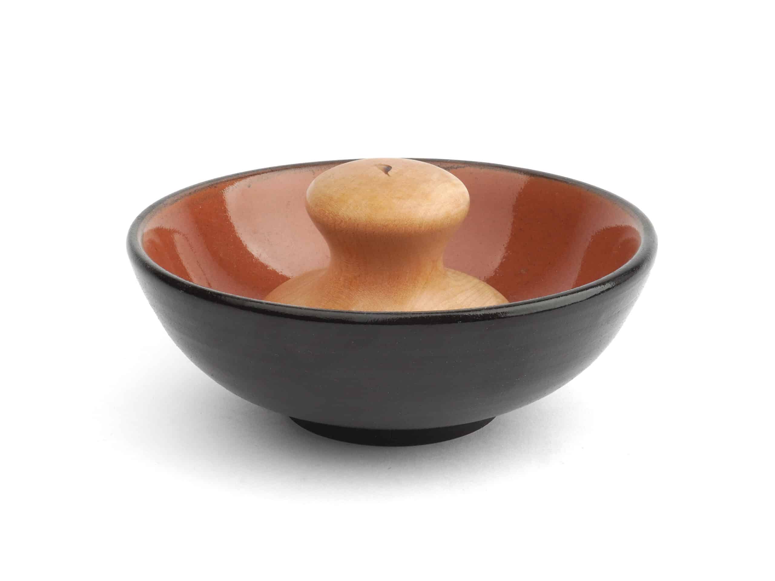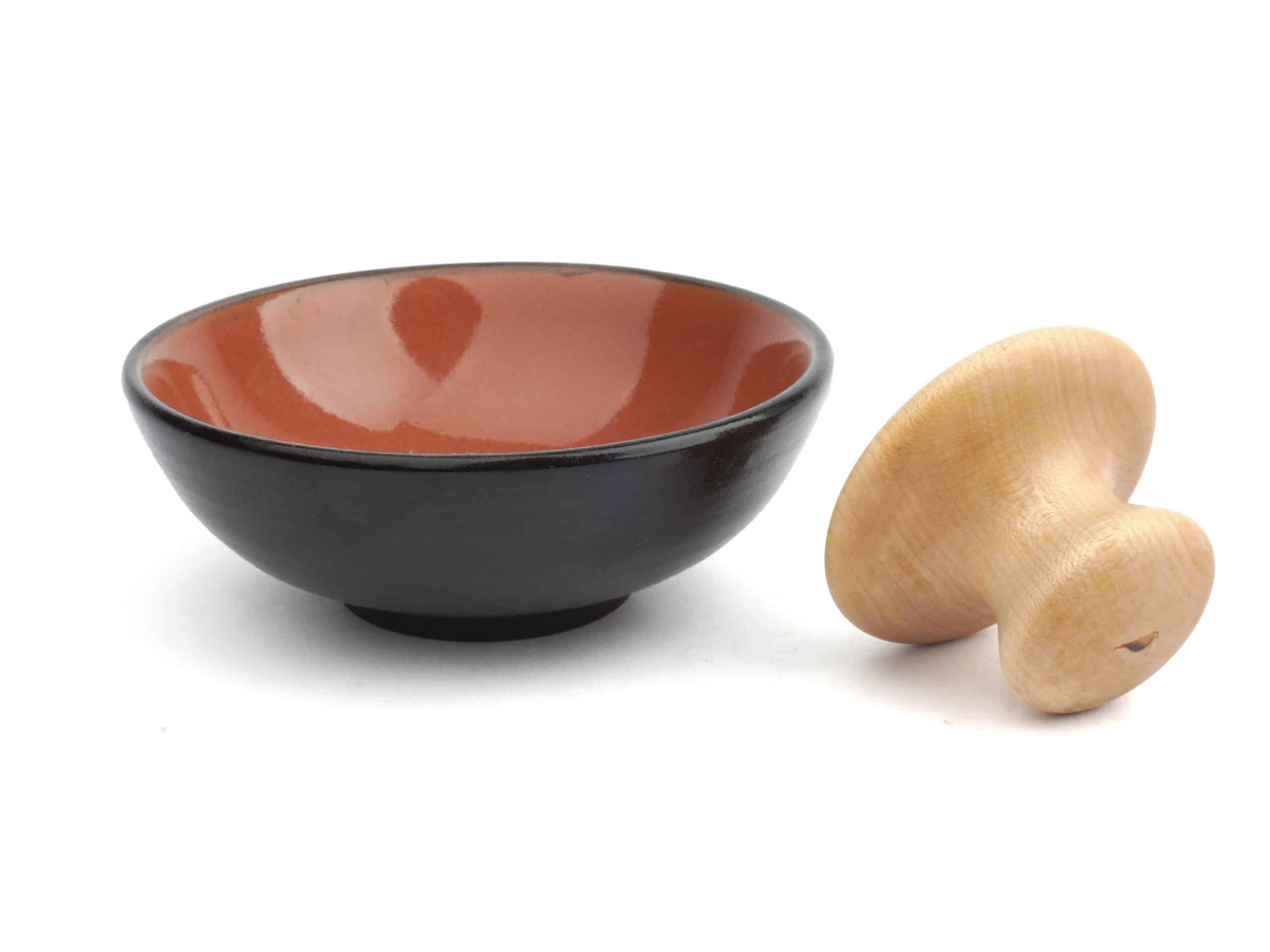 Ein formschöner Schweizer Mörser (D: 15cm) aus Keramik mit einem ergonomisch geformten Holzstössel aus Schweizer Eschenholz – handgefertigt in der Schweiz.