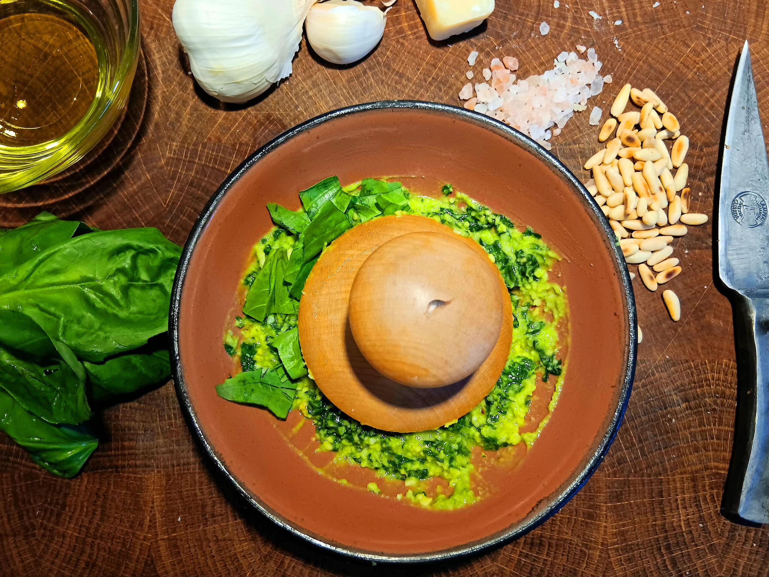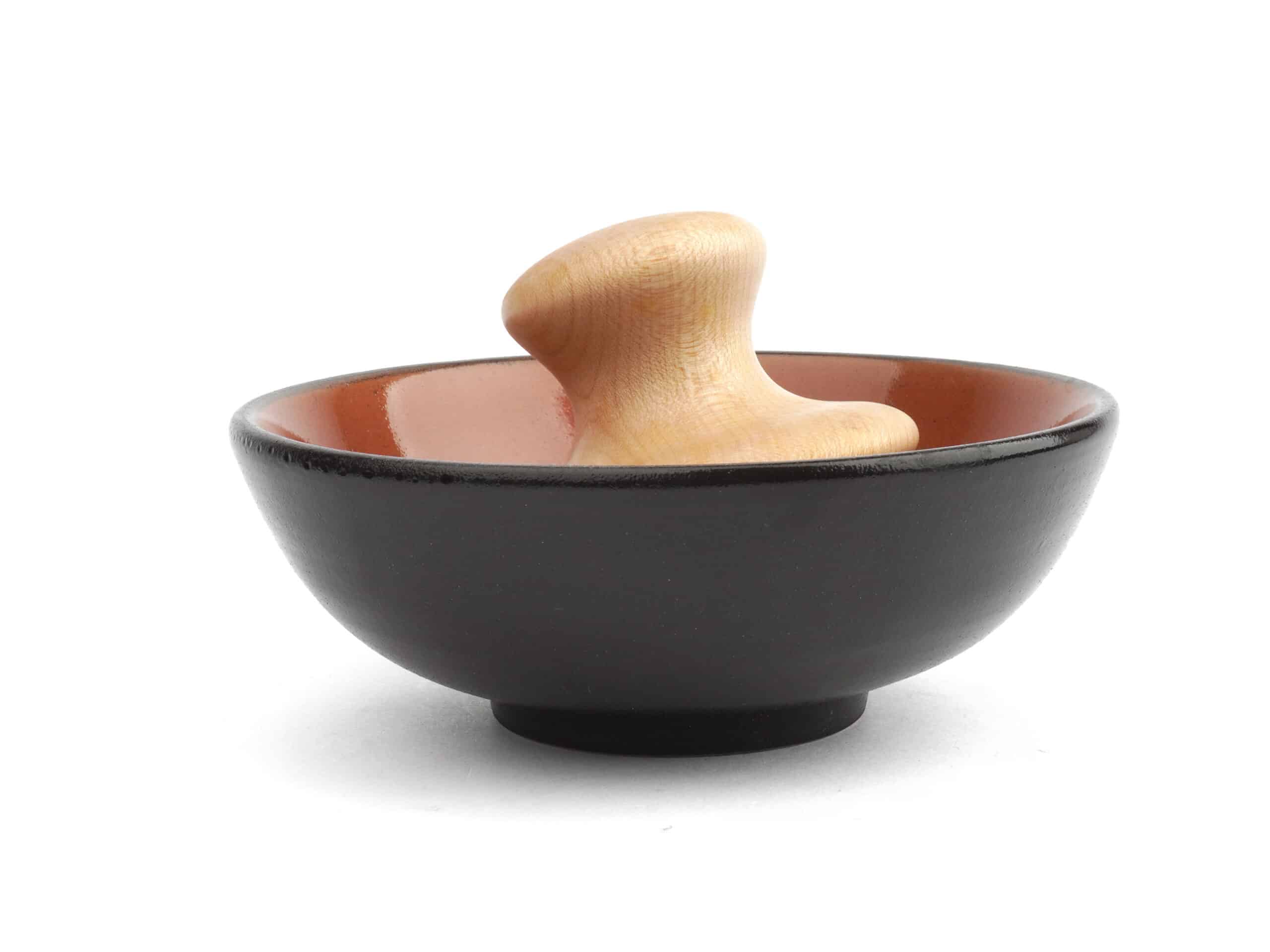Formschöner Schweizer Mörser aus Keramik mit einem ergonomisch geformten Holzstössel. Handgefertigt in der Schweiz. Für aromatische Kräuter- und Gewürzmischungen, frische Pestos, spannende Marinaden und Dips, Guacamole,… oder Currypasten.