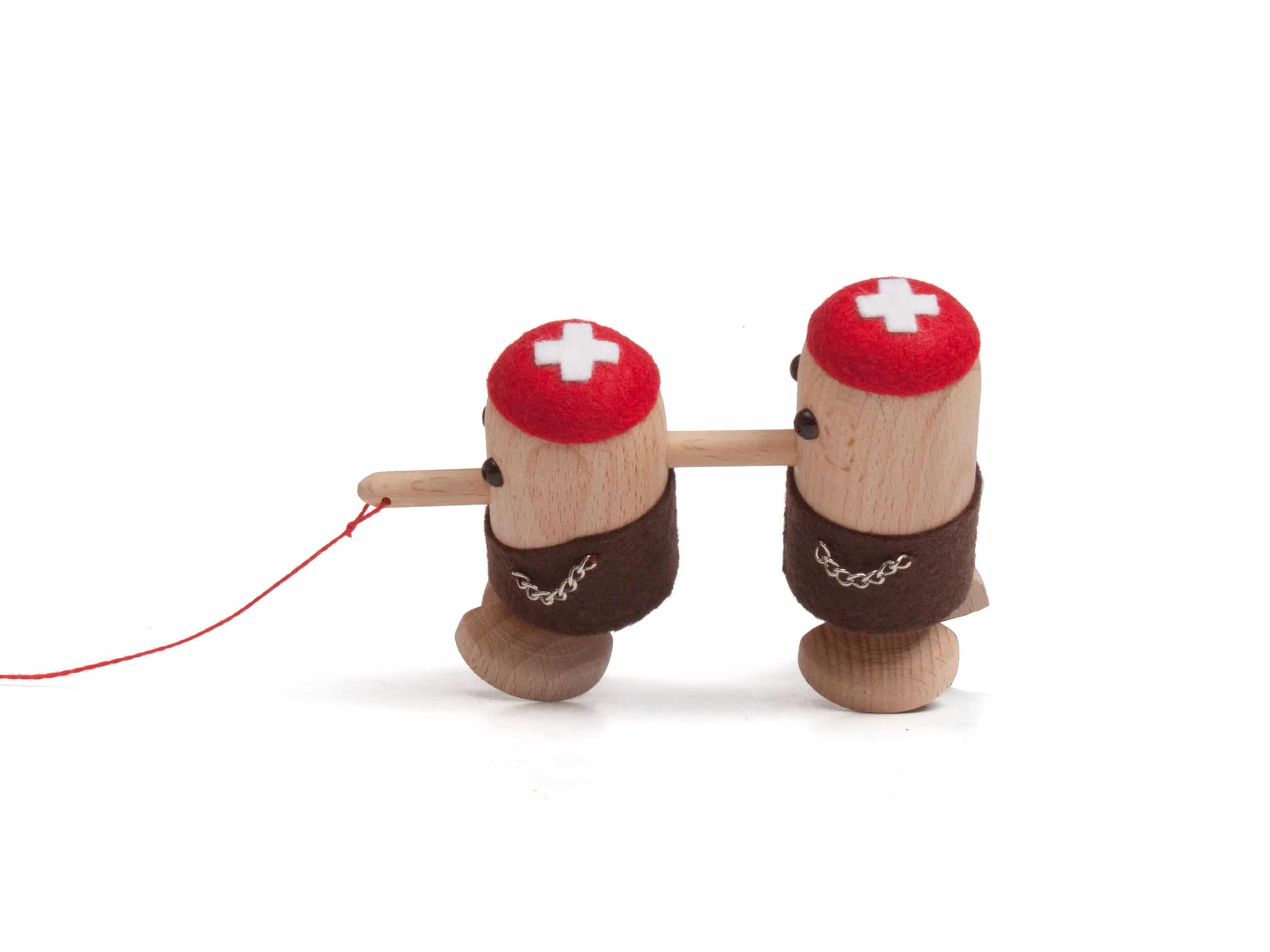 Dieses witzige, handgefertigte Wackel-Duo im Stil zweier Trachtenmännchen Toggenburgerli läuft wie von Zauberhand über den Tisch und erfreut Gross und Klein.