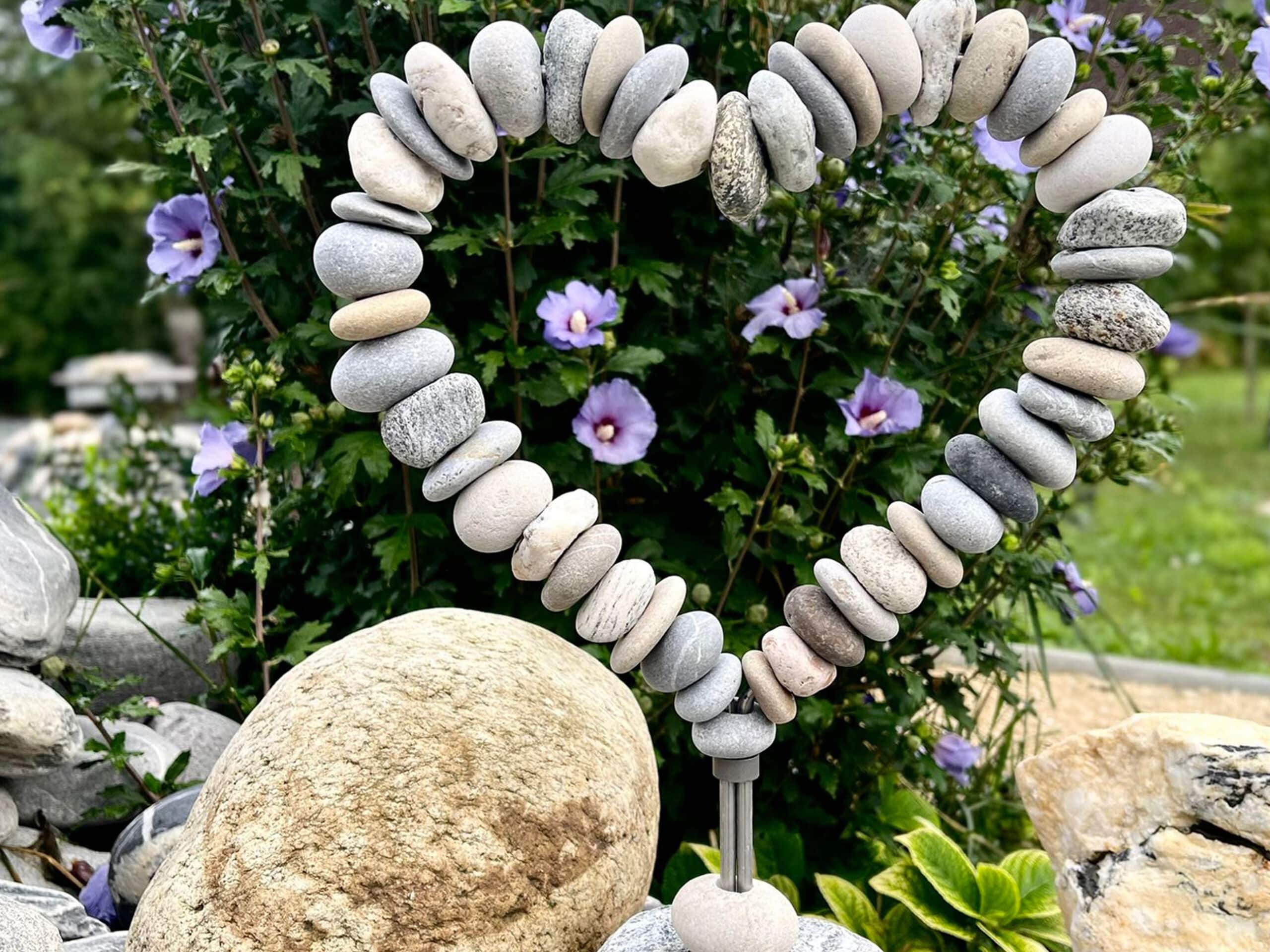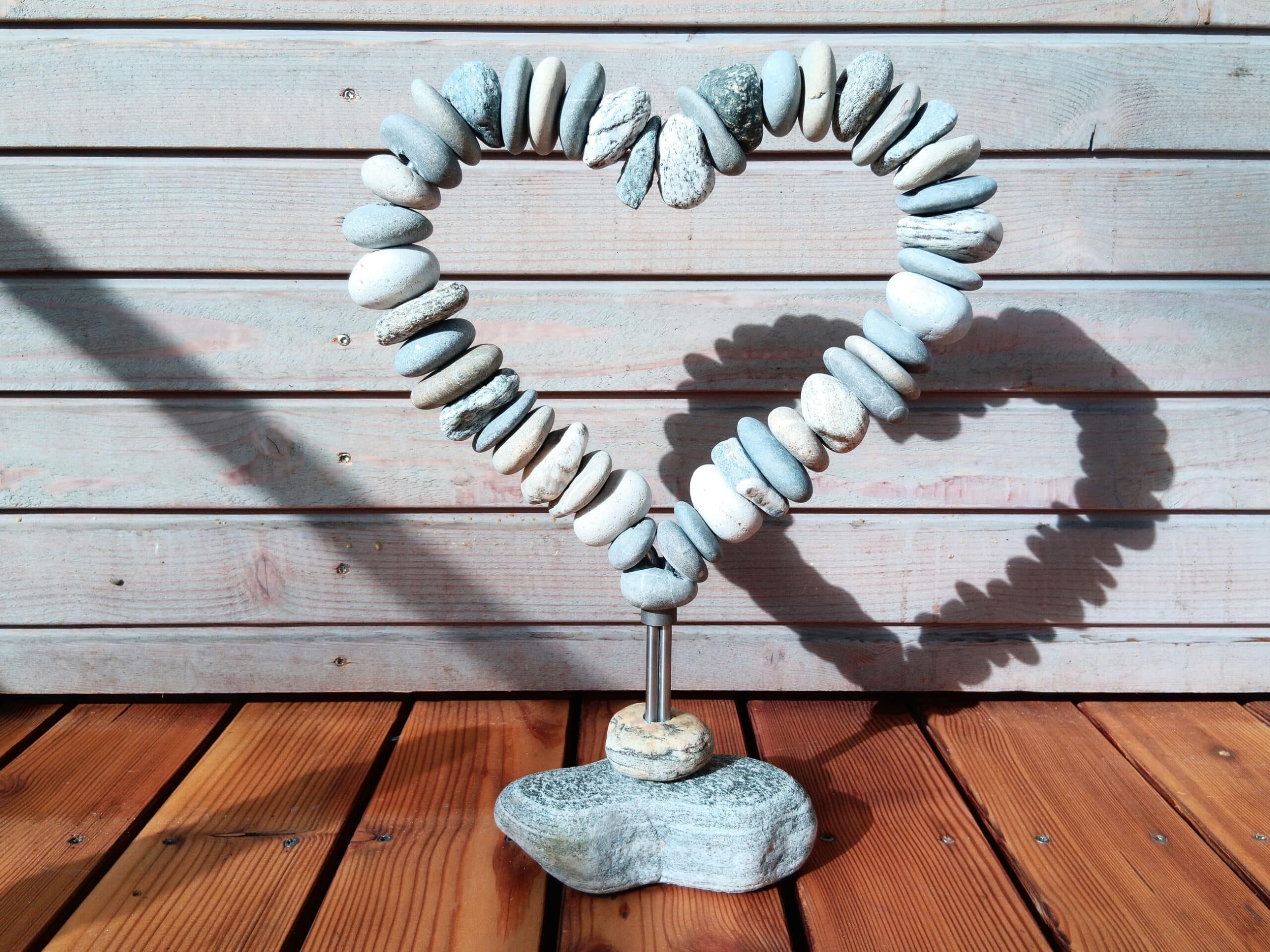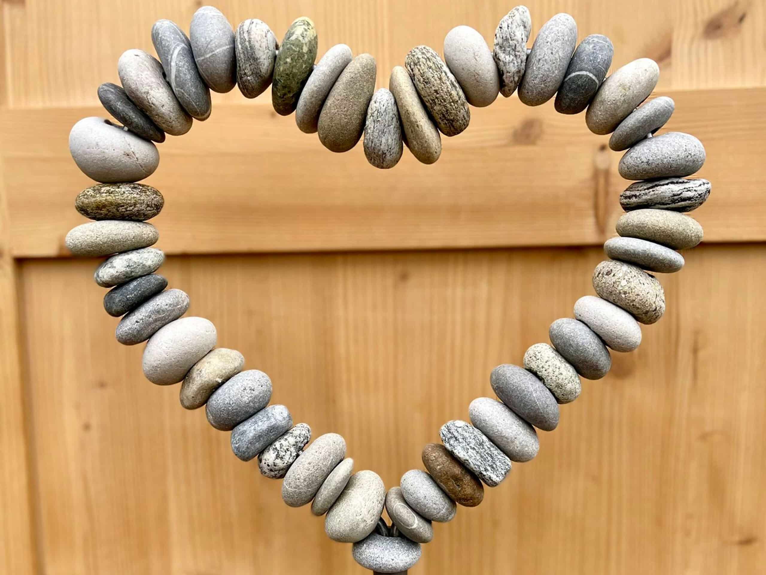 Jeder Stein stammt aus Schweizer Flüssen (Markus findet diese auf seinen Erkundungstouren in der Emme und Maggia) und wird sorgfältig getrommelt und gebohrt. Und zum Schluss auf den schön geformten, rostfreien Edelstahl zum fertigen Herzen zusammengestellt. Der Steinsockel ist unten flach geschliffen und mit Filzschonern versehen. Das Steinherz ist wetter- und winterfest, sturmsicher und hält fast ewig.