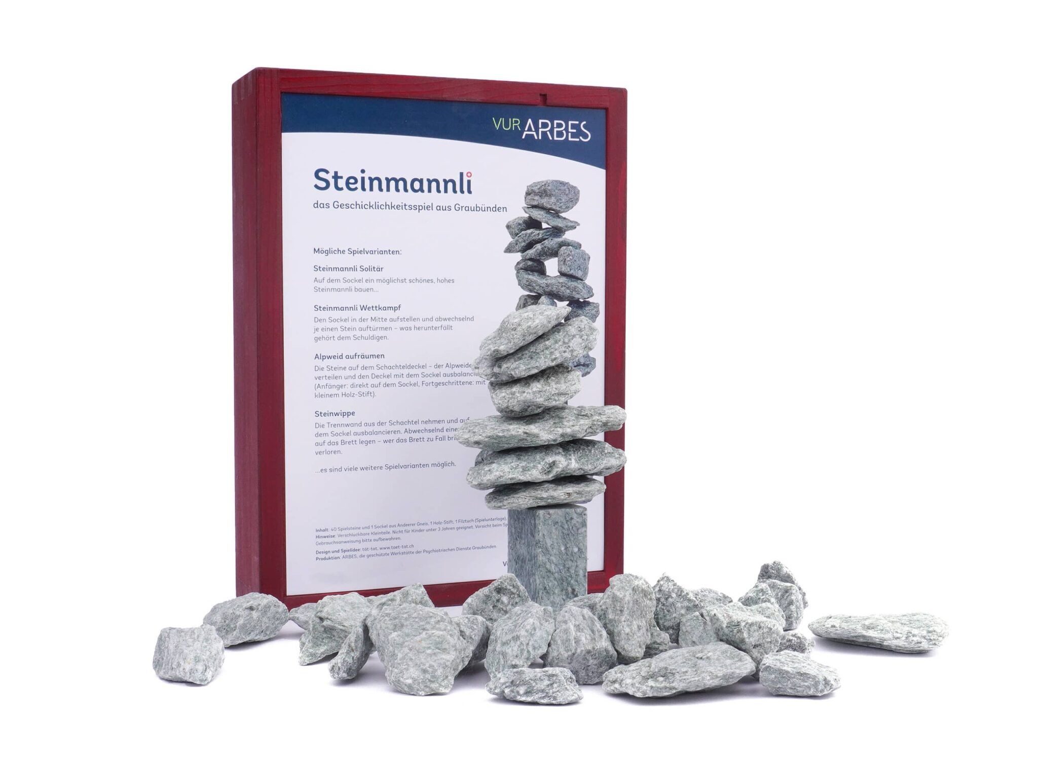 Das bekannte Bündner Geschicklichkeitsspiel Steinmannli. Egal ob alleine, zu Zweit oder zu Viert: hier kannst Du Deine Geschicklichkeit unter Beweis stellen.