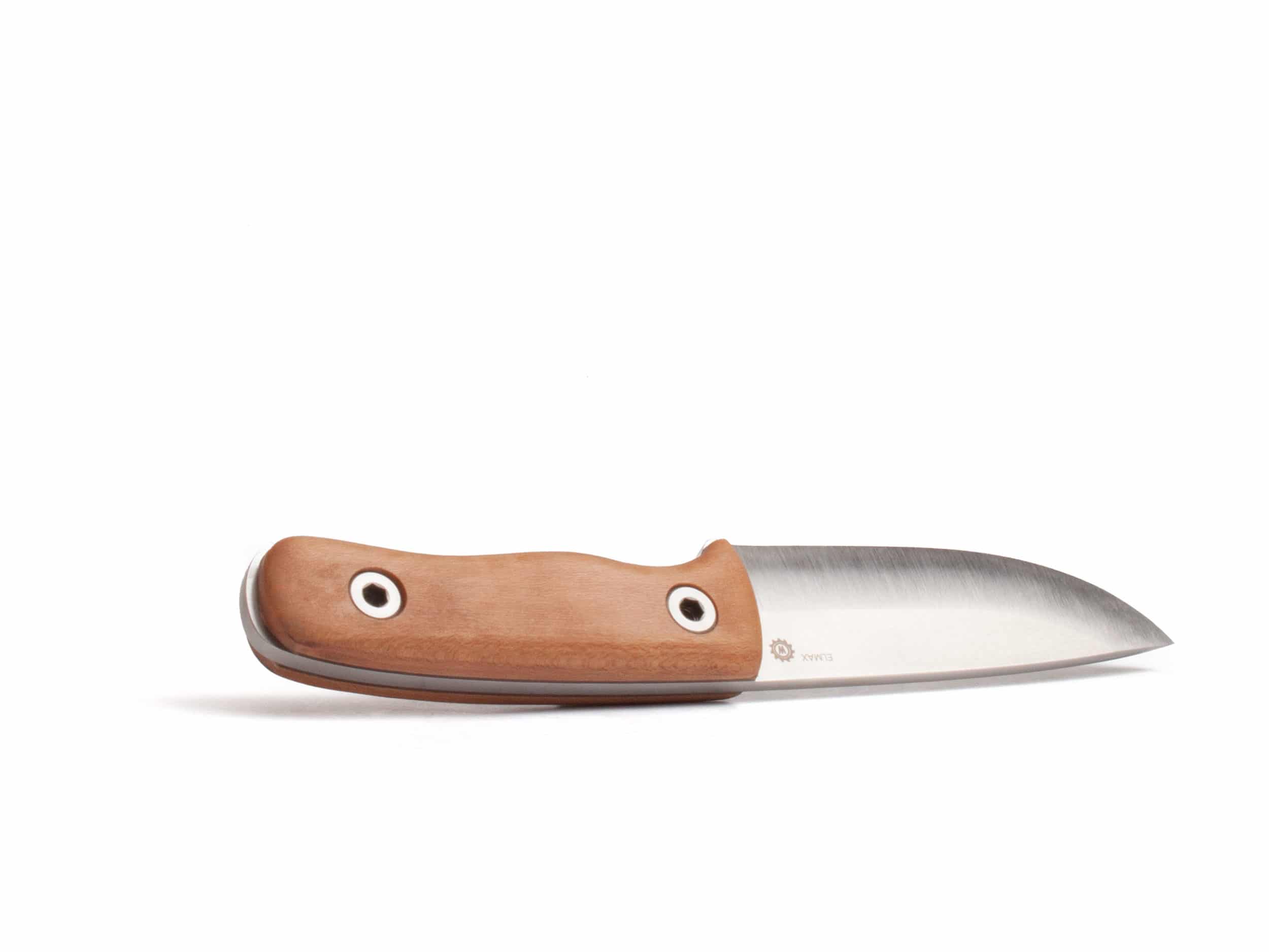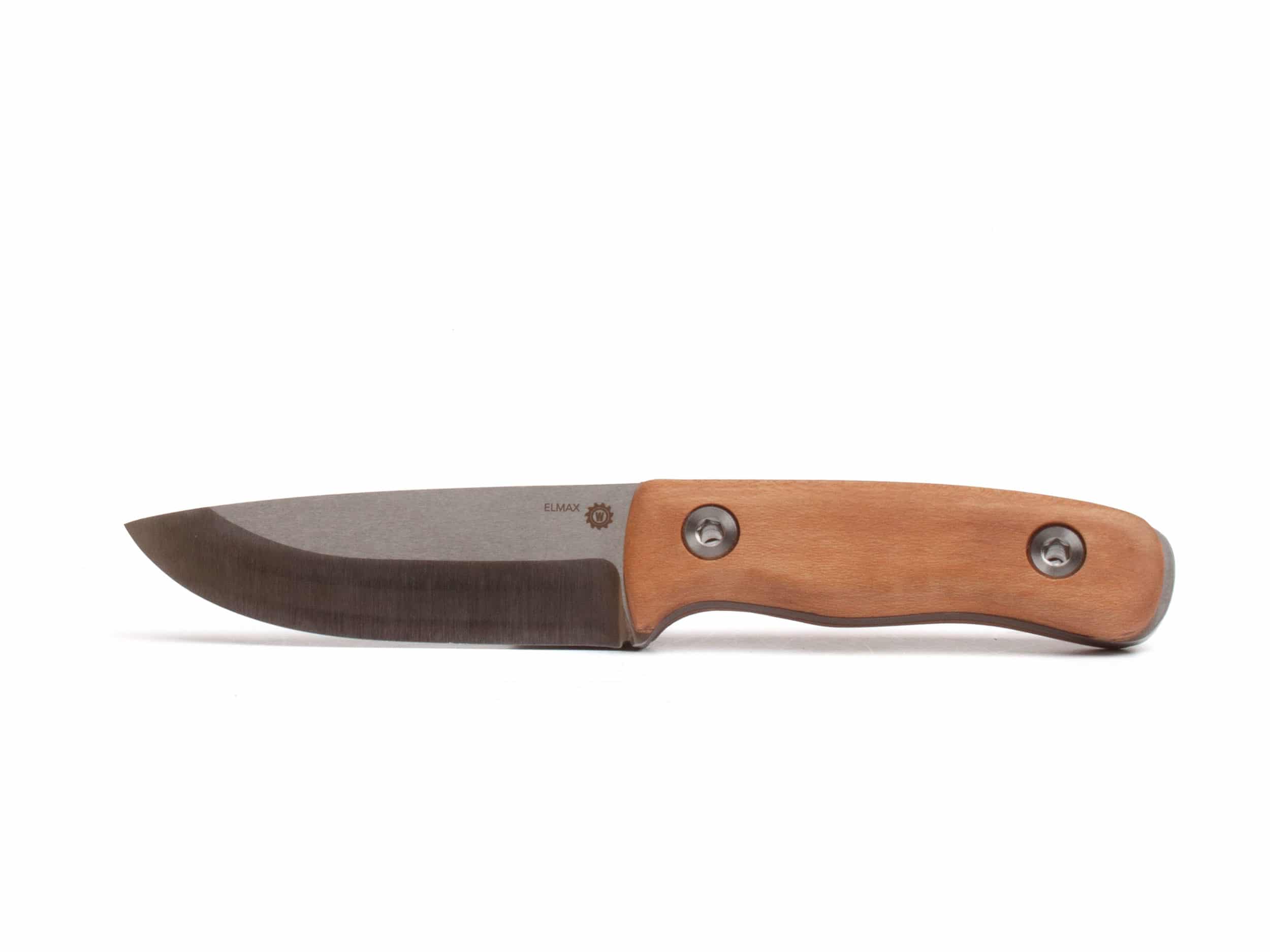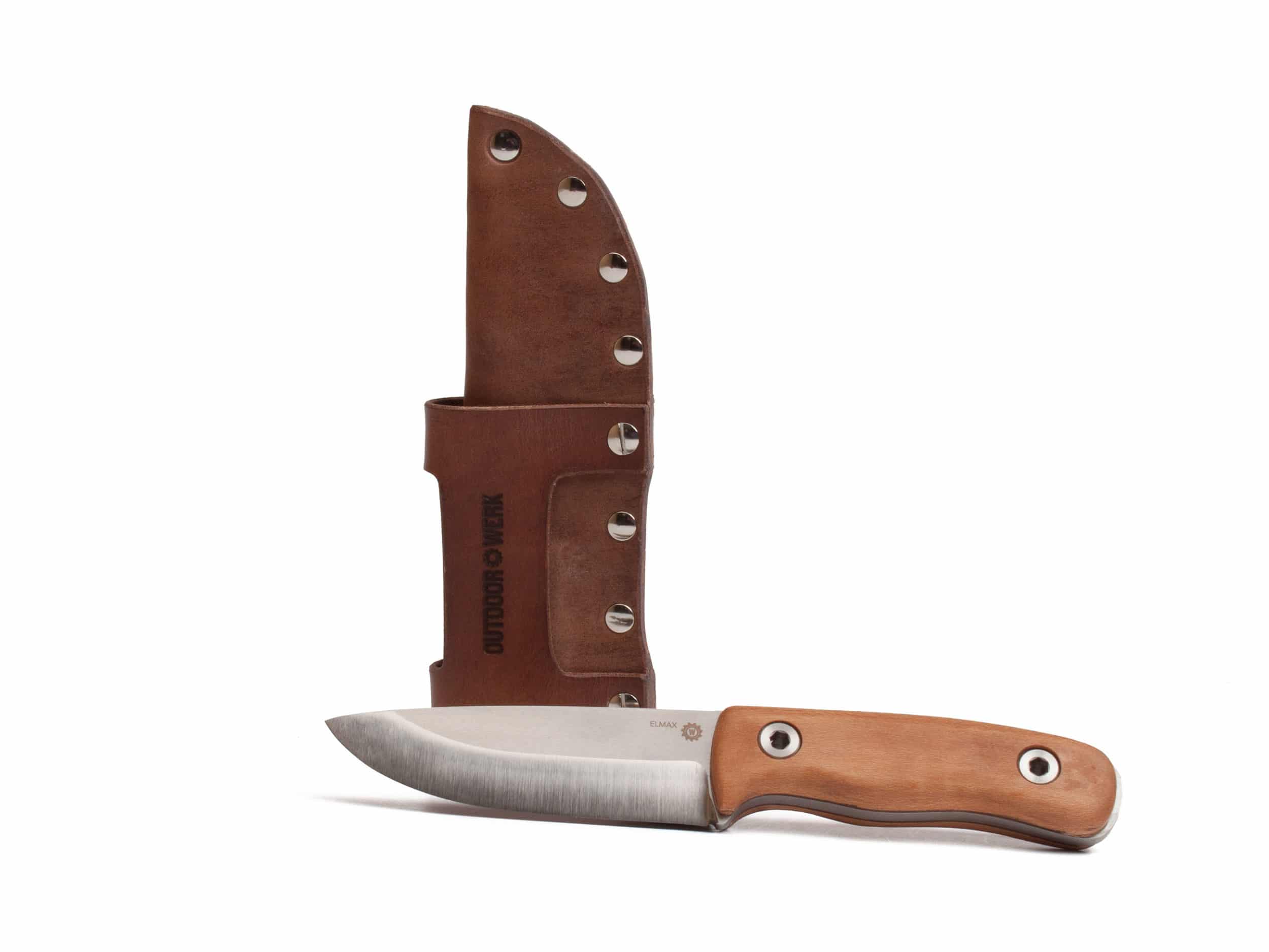 Das Schweizer Outdoor Messer OW4. ELMAX Pulverstahl, Griff aus Kornelkirsch-Griffholz unterlegt mit Schweizer Ziegenleder, Flugzeug-Titan-Schrauben. Erst wieder Anfang 2023 erhältlich.
