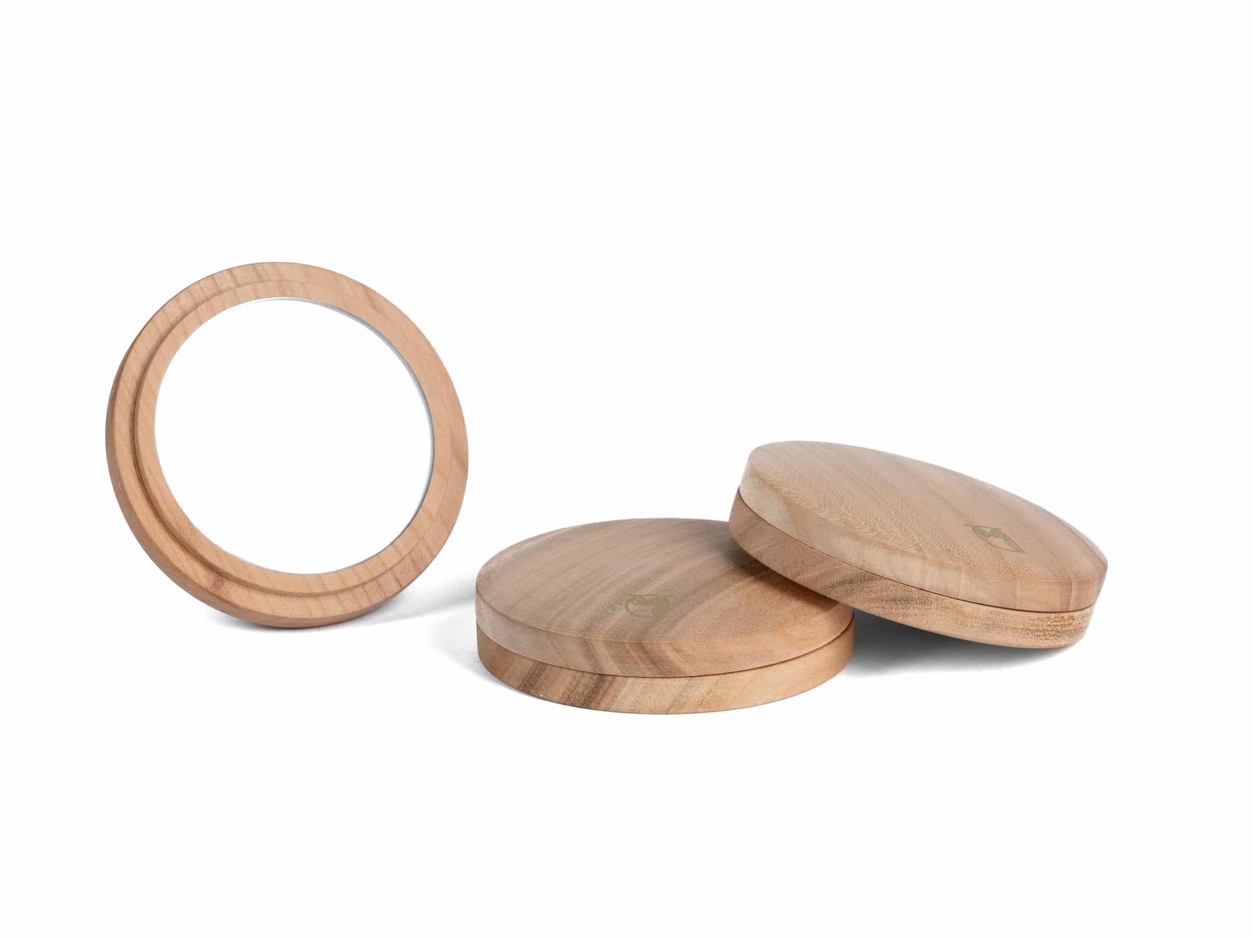 Stilvoll gedrechselter Taschenspiegel aus Schweizer Kirschbaumholz mit Magnetverschluss.