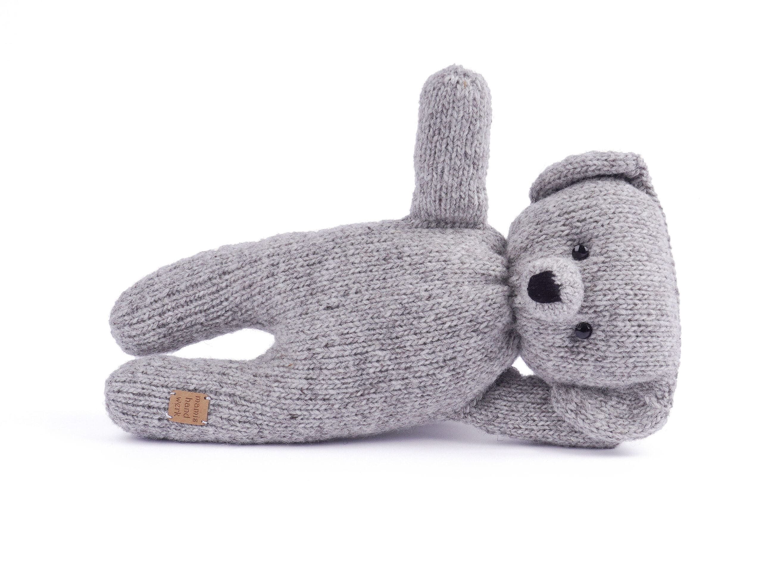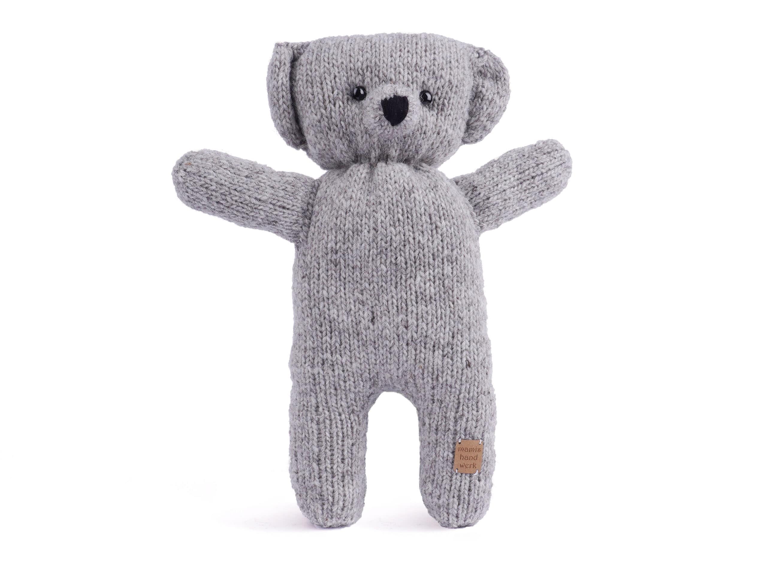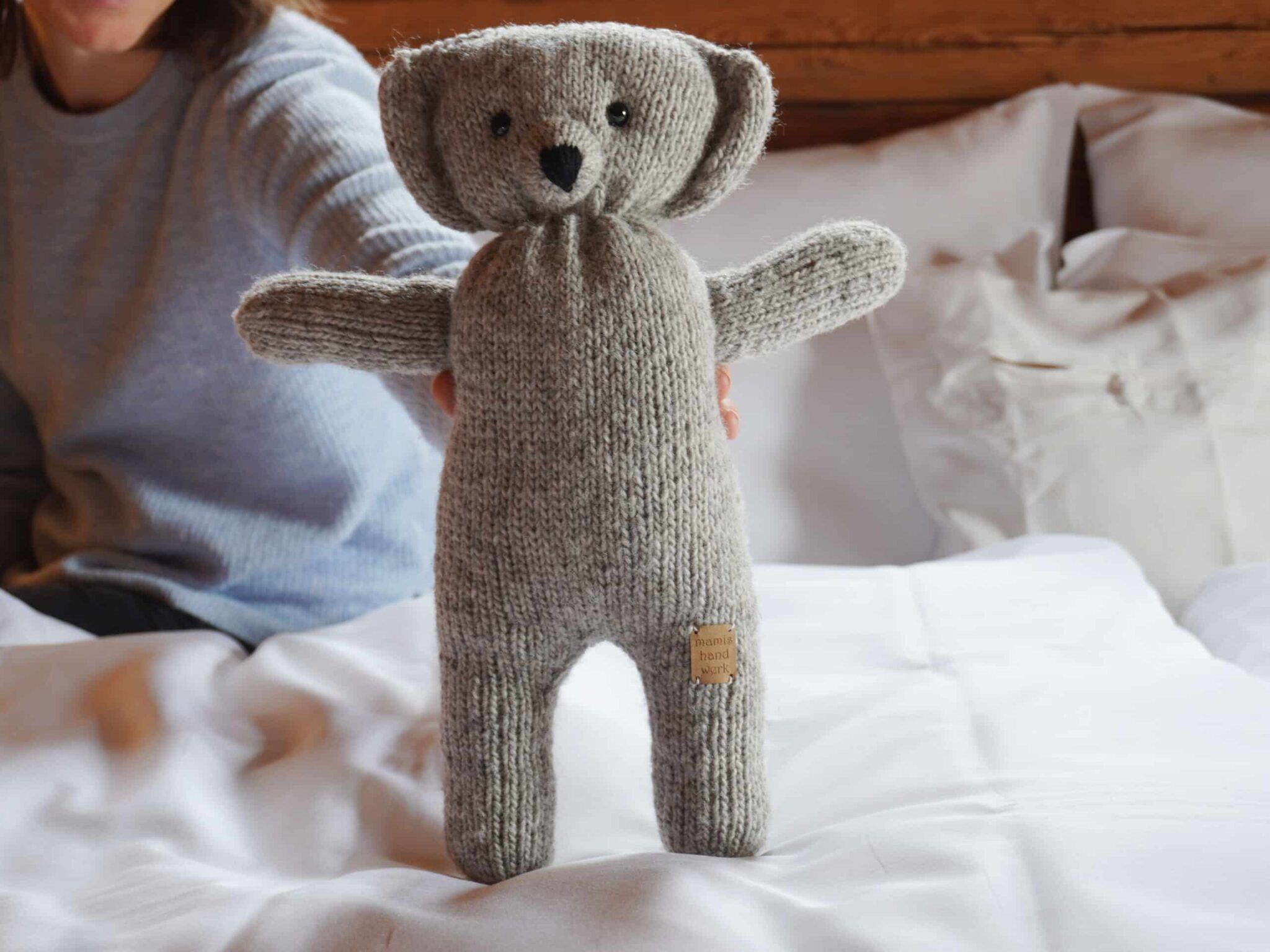 Dieser grosse Teddybär (Höhe 38 cm) wird mit viel Liebe in der Schweiz gestrickt. Nach dem klassischen Strickmuster der Grossmutter fertigt Monika diesen hübschen Bären von A bis Z von Hand.