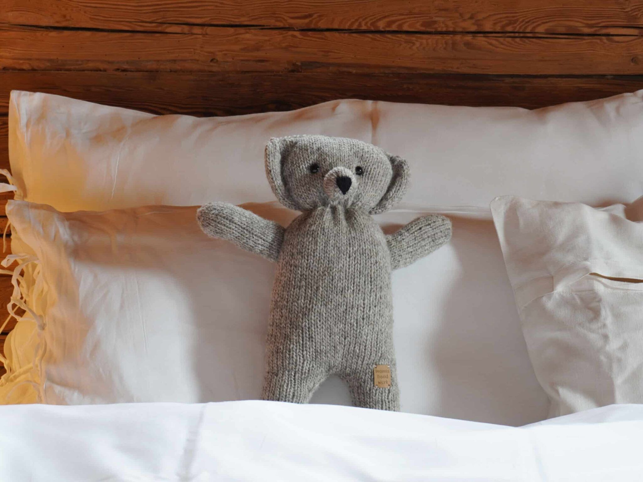 Die ungefärbte Schurwolle, die Füllung aus Schweizer Schafwoll-Kügelchen (beides hergestellt und verarbeitet im Prättigau) und die Kulleraugen, machen den Teddybären zum langlebigen Lieblingsplüschtier.