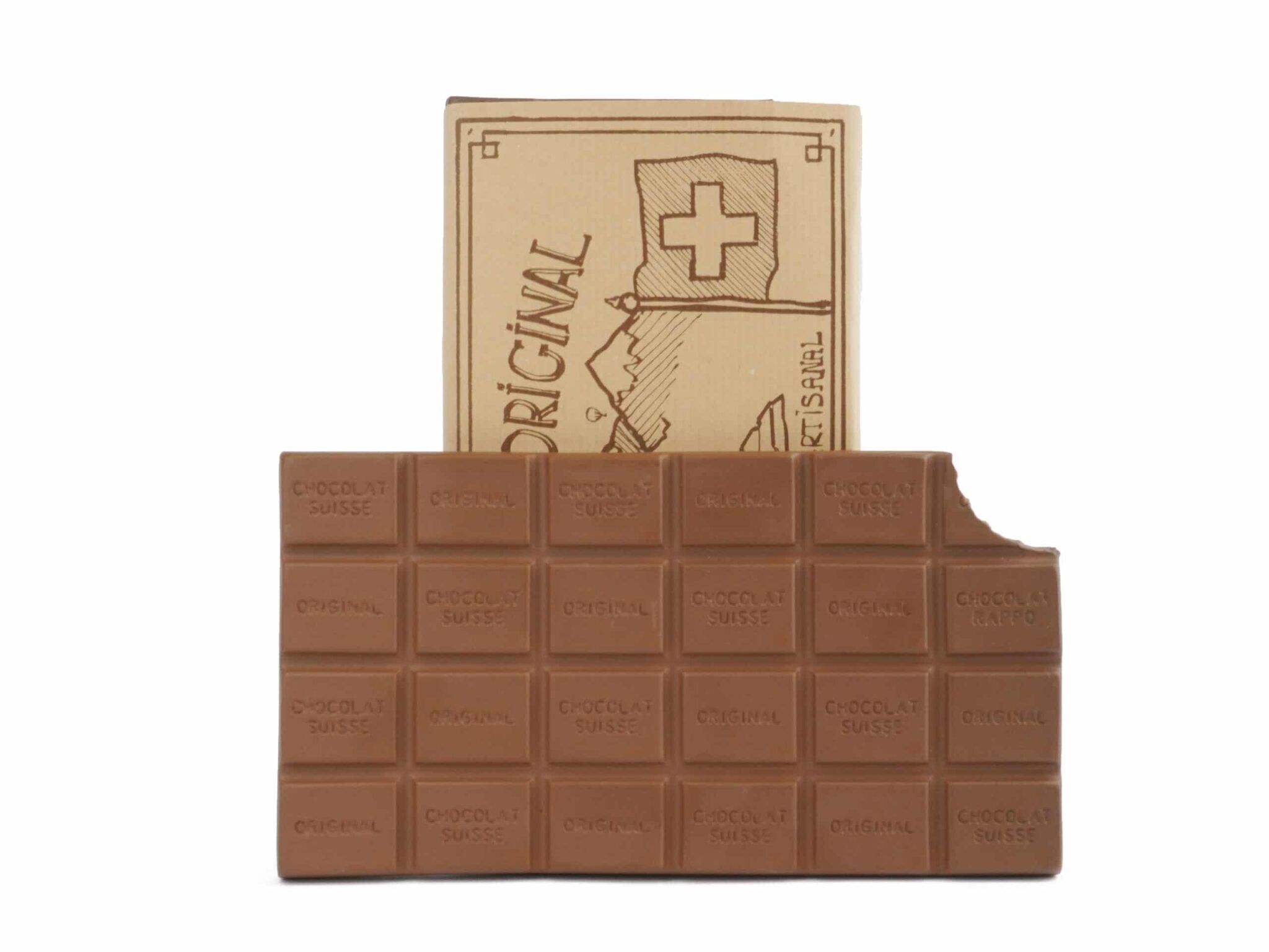 Die täuschend echte Tafel Swiss Original Chocolate verblüfft auf jedem Tisch und ist bestimmt auch eine originelle Schweizer Geschenkidee für Deine Liebsten.